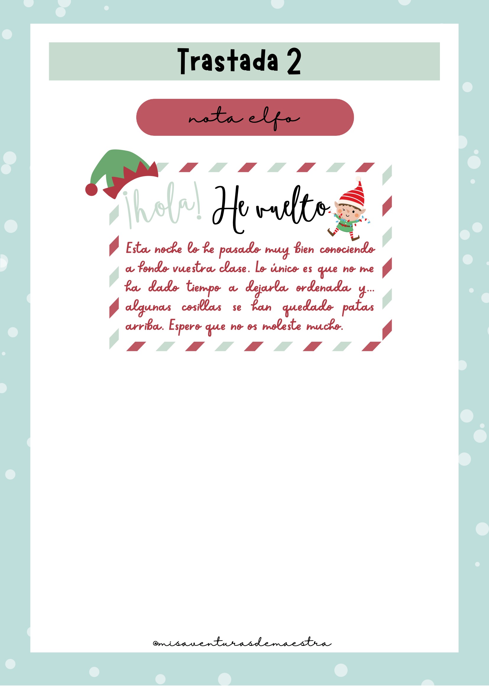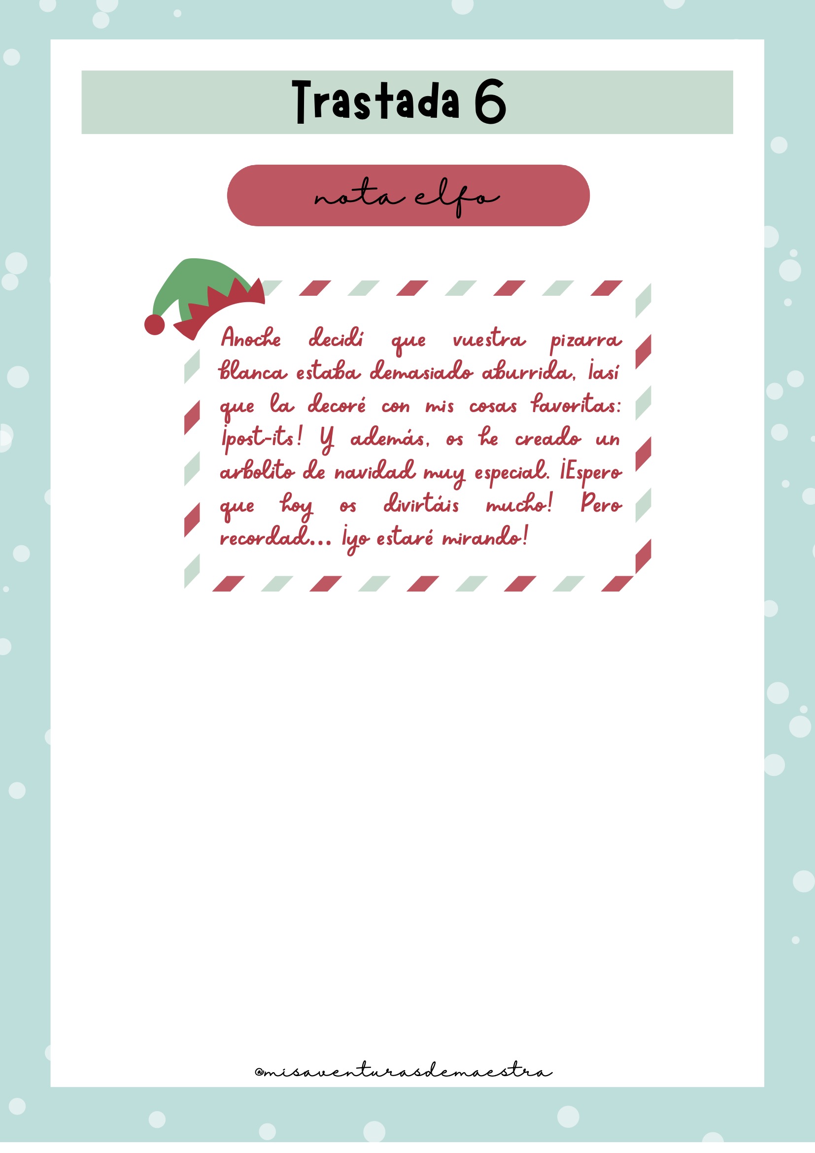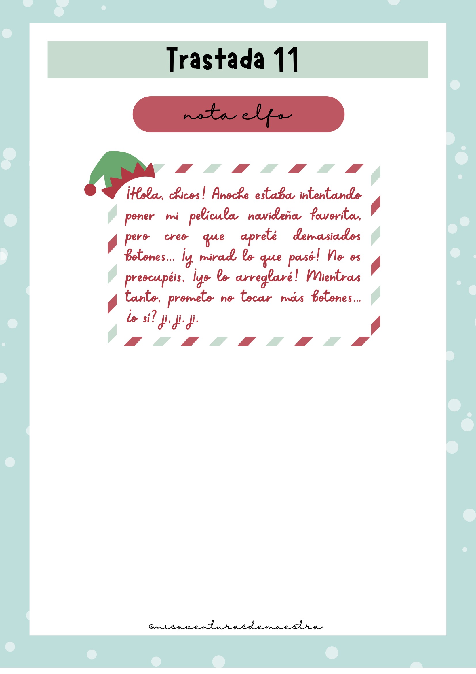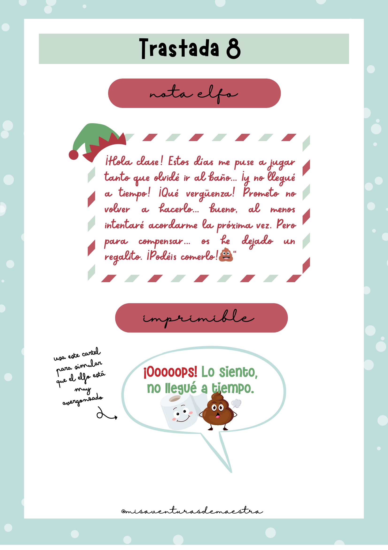Imprime el pack y prepáralo antes de diciembre para organizar cada una de las trastadas. Cada día, el elfo aparecerá en un lugar diferente de la clase con una actividad, una travesura o un reto. Puedes combinarlo con momentos de tutoría, dinámicas de cohesión o celebraciones navideñas. Es un recurso perfecto para crear rutina, ilusión y conexión emocional con el grupo.