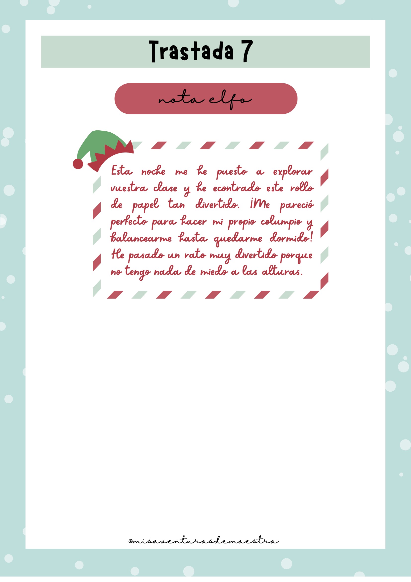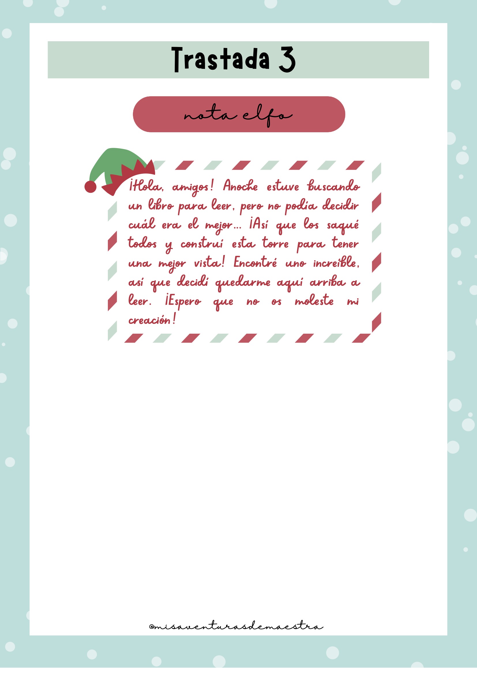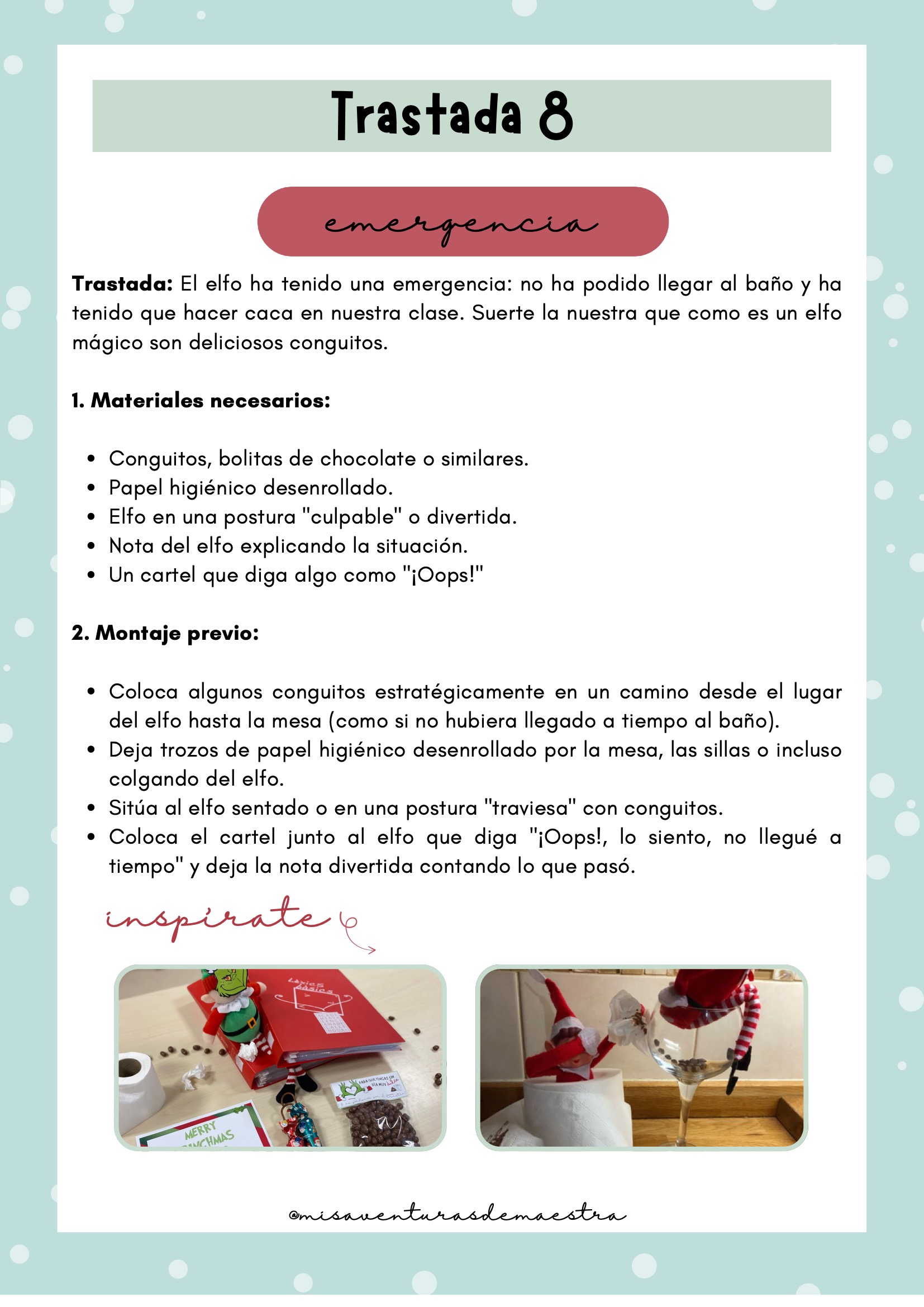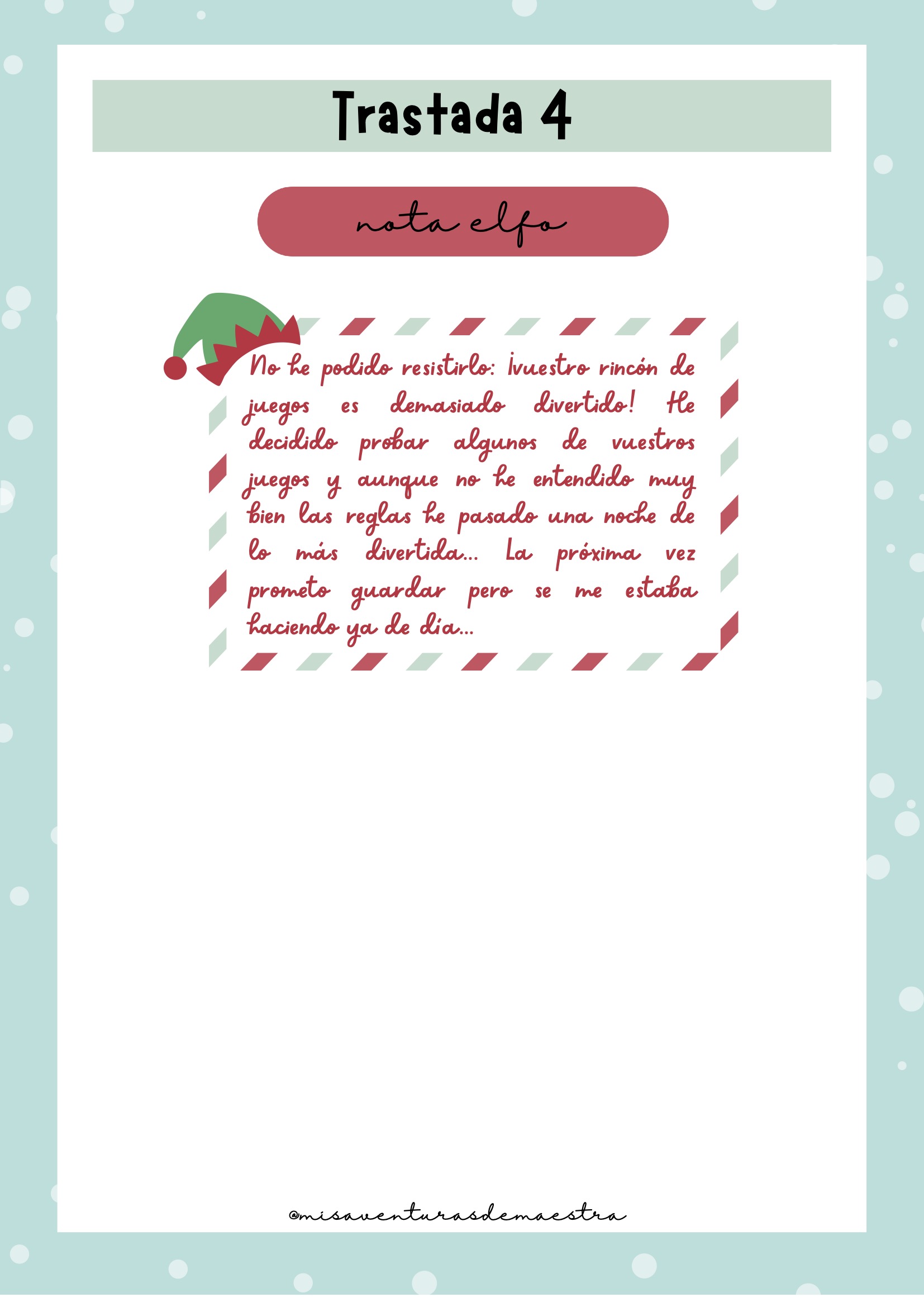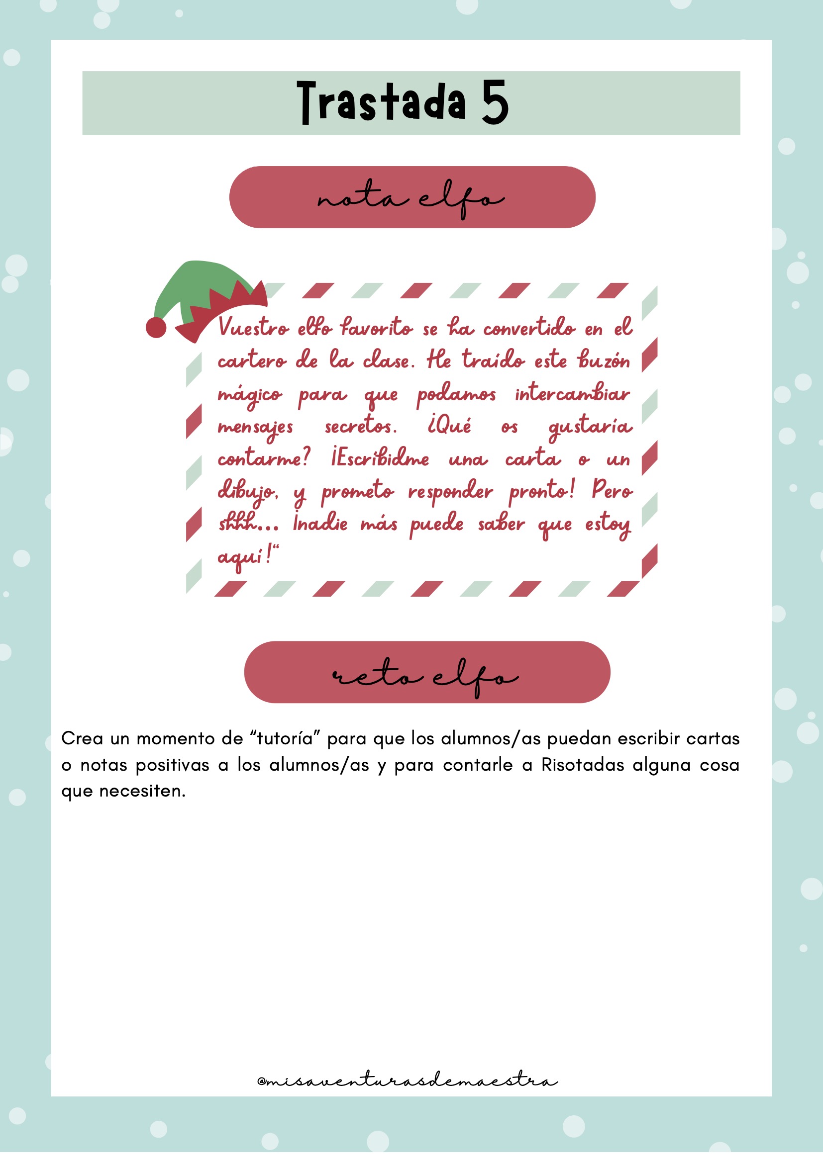 Imprime el pack y prepáralo antes de diciembre para organizar cada una de las trastadas. Cada día, el elfo aparecerá en un lugar diferente de la clase con una actividad, una travesura o un reto. Puedes combinarlo con momentos de tutoría, dinámicas de cohesión o celebraciones navideñas. Es un recurso perfecto para crear rutina, ilusión y conexión emocional con el grupo.