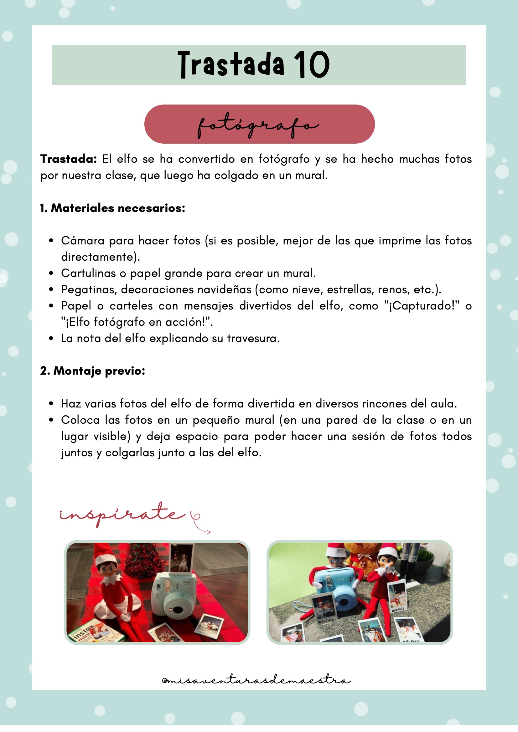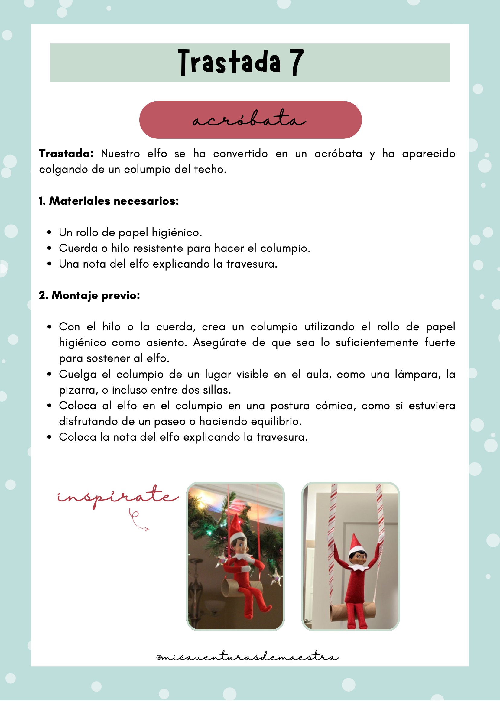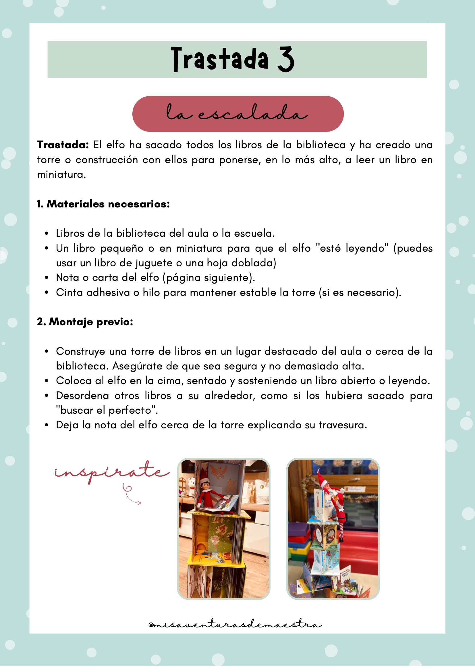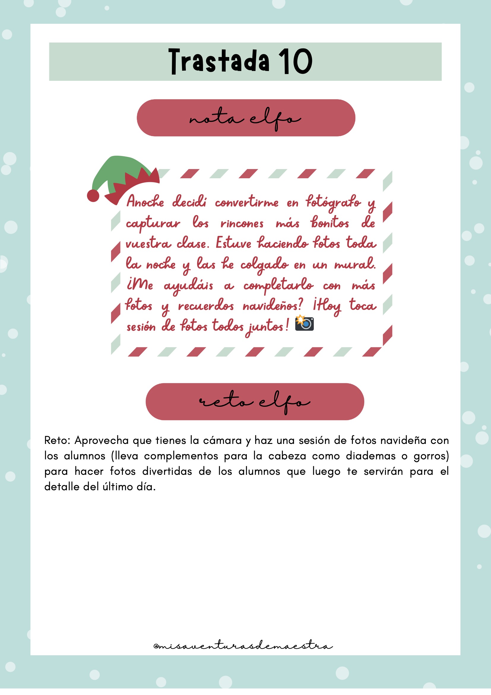 Imprime el pack y prepáralo antes de diciembre para organizar cada una de las trastadas. Cada día, el elfo aparecerá en un lugar diferente de la clase con una actividad, una travesura o un reto. Puedes combinarlo con momentos de tutoría, dinámicas de cohesión o celebraciones navideñas. Es un recurso perfecto para crear rutina, ilusión y conexión emocional con el grupo.