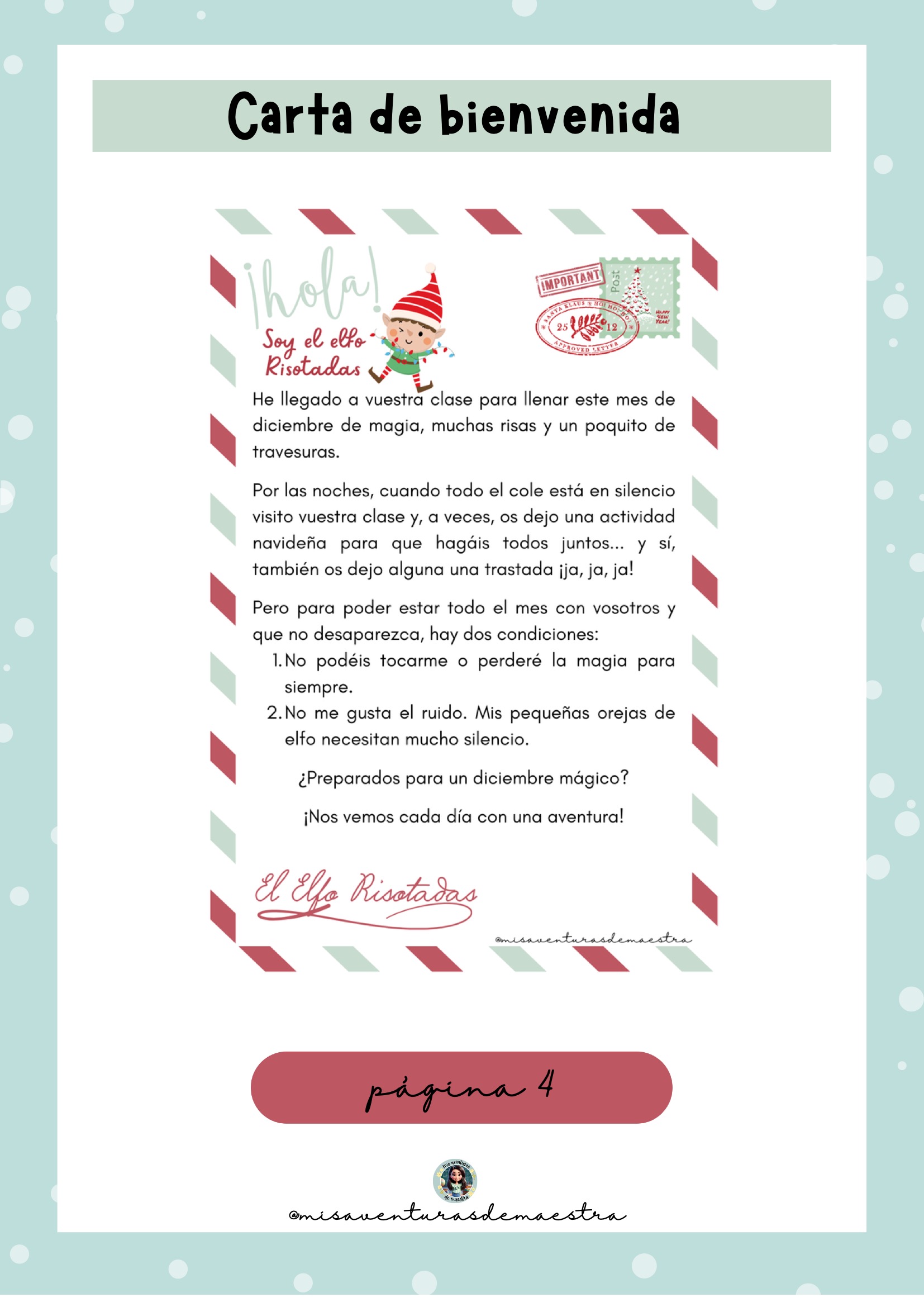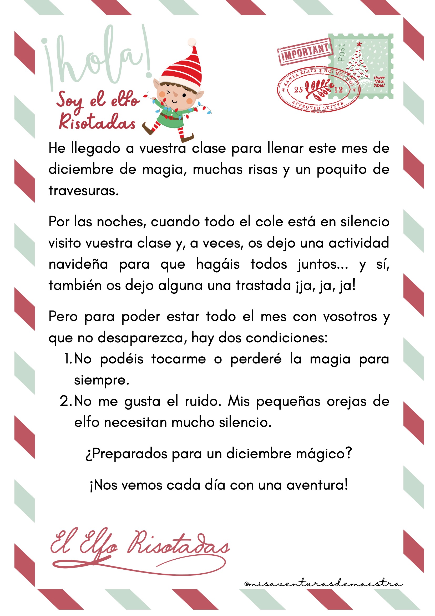 Carta de bienvenida del Elfo Risotadas, explicando su misión y las normas del aula.