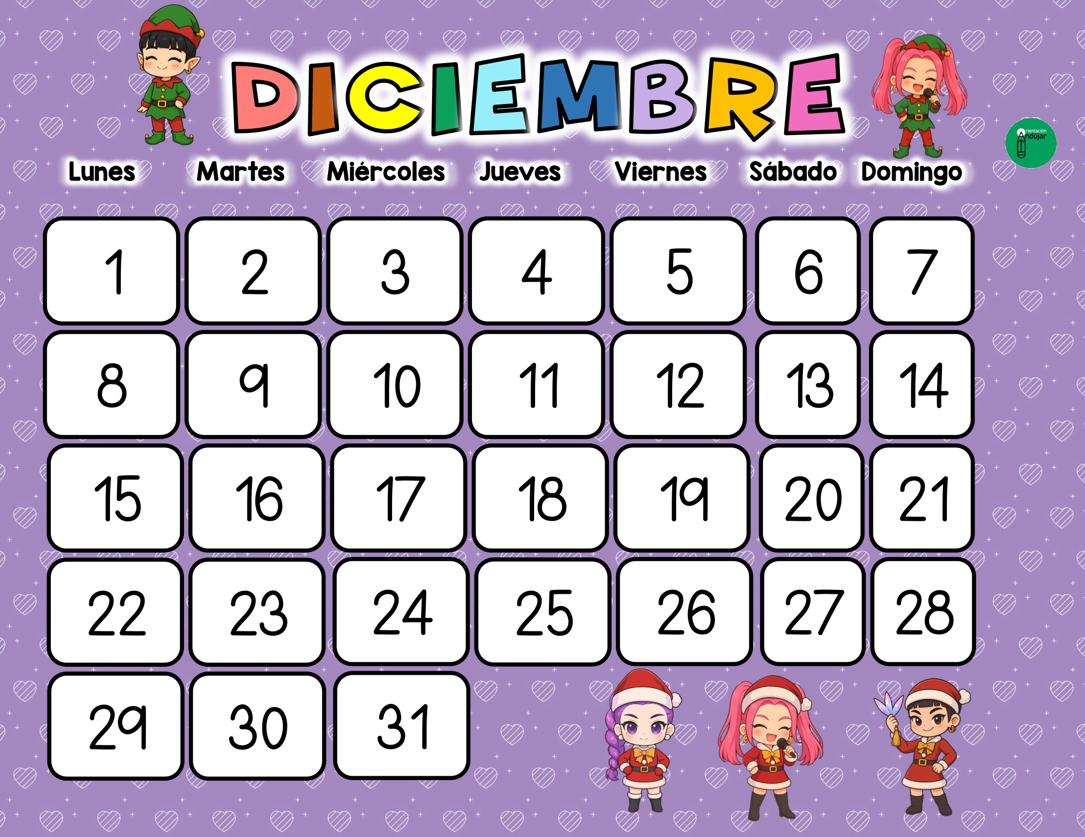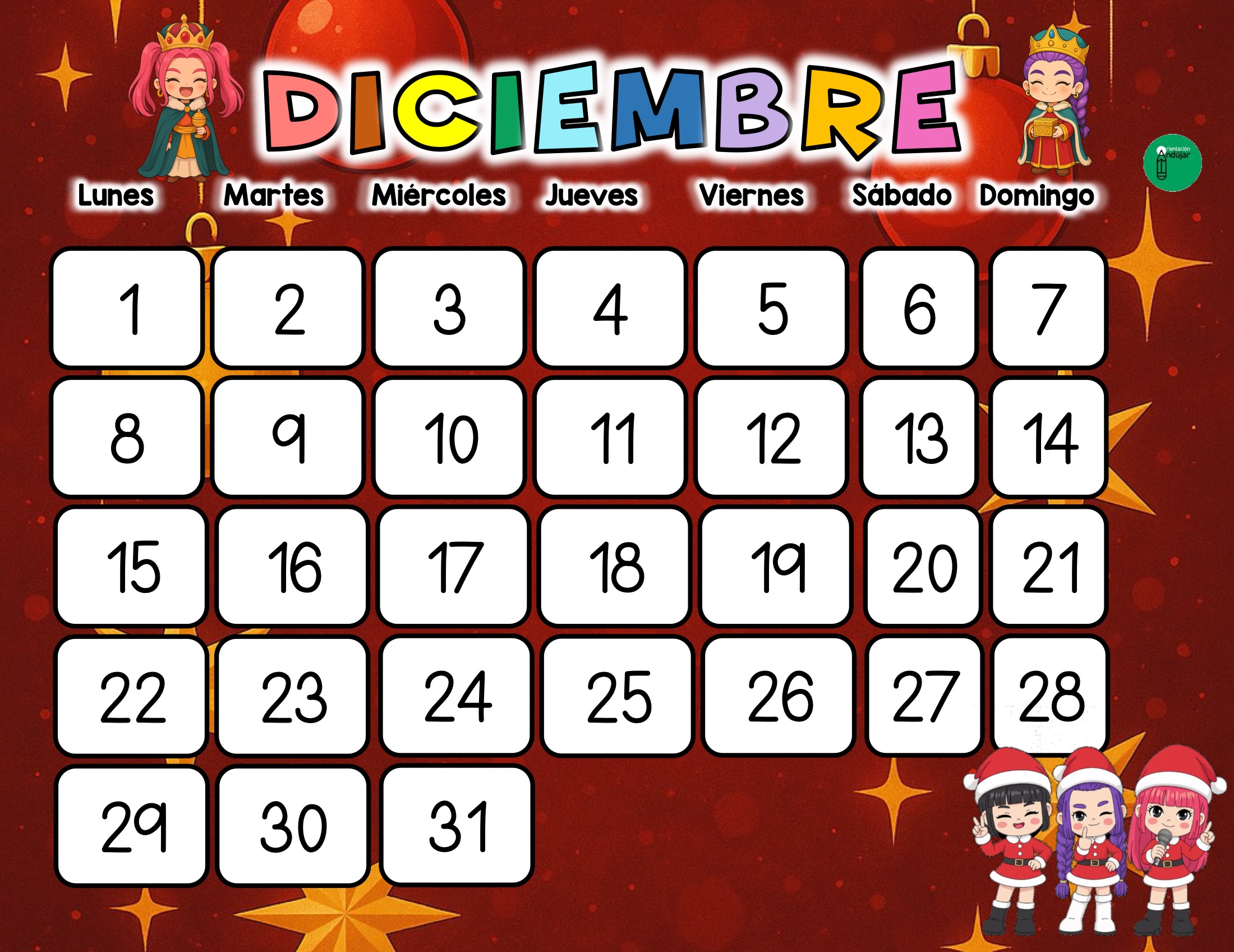 Puedes colocar este calendario en el panel de rutinas, utilizarlo para trabajar la fecha del día, crear un calendario de clase o asignar tareas diarias marcando cada casilla. También es perfecto para acompañar actividades temáticas de Navidad, proyectos del mes de diciembre o para decorar el aula con un toque K-Pop navideño muy divertido.