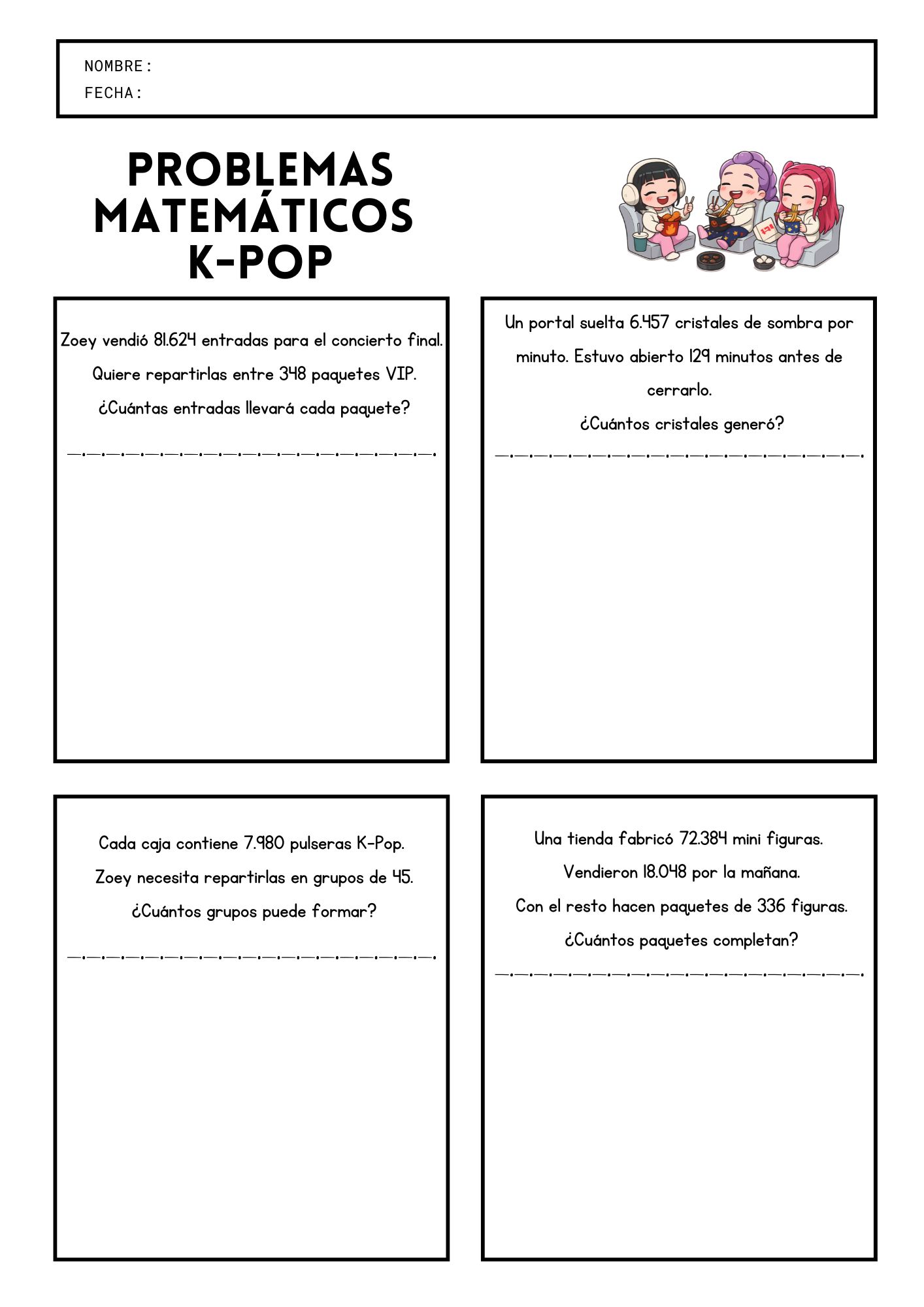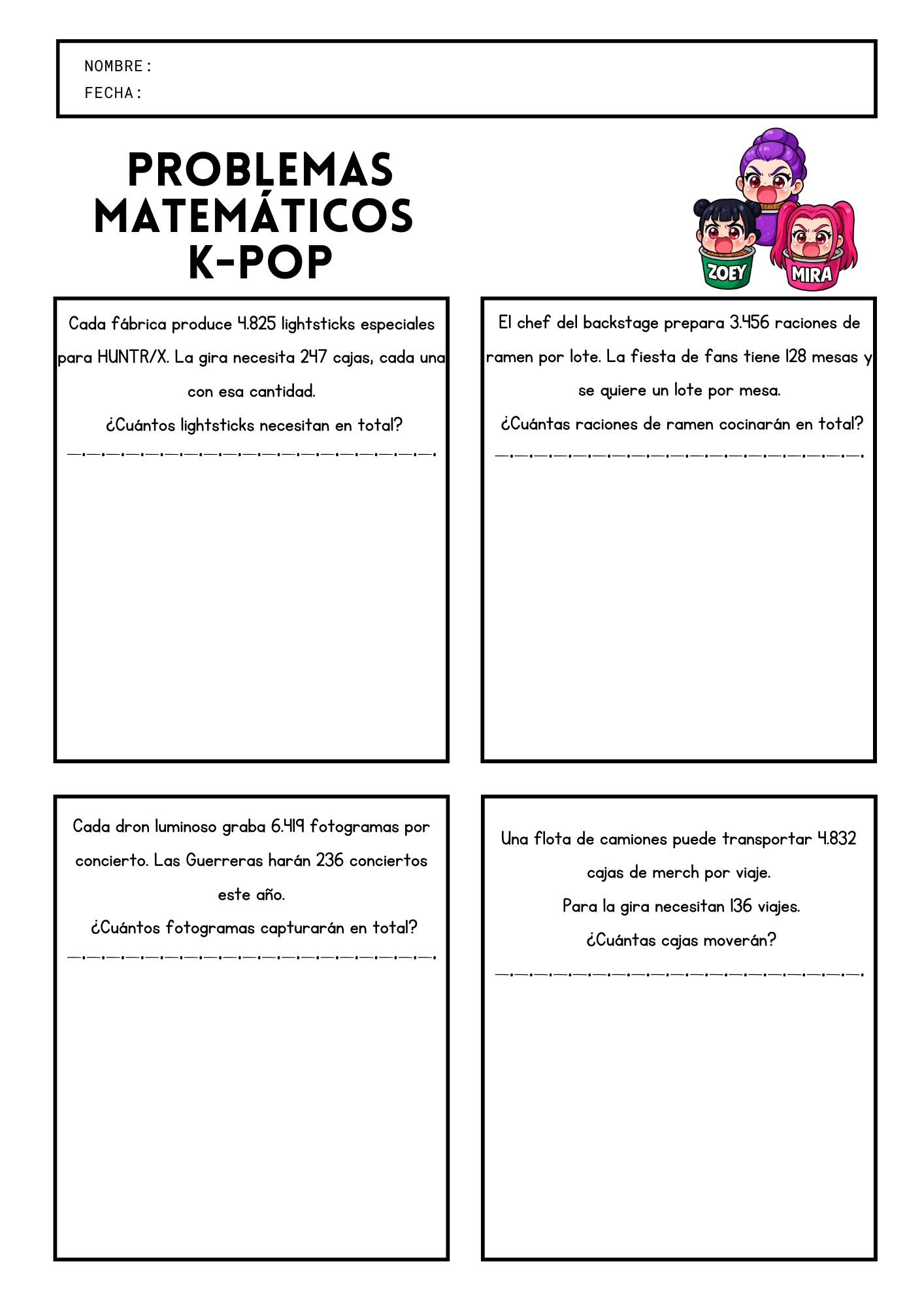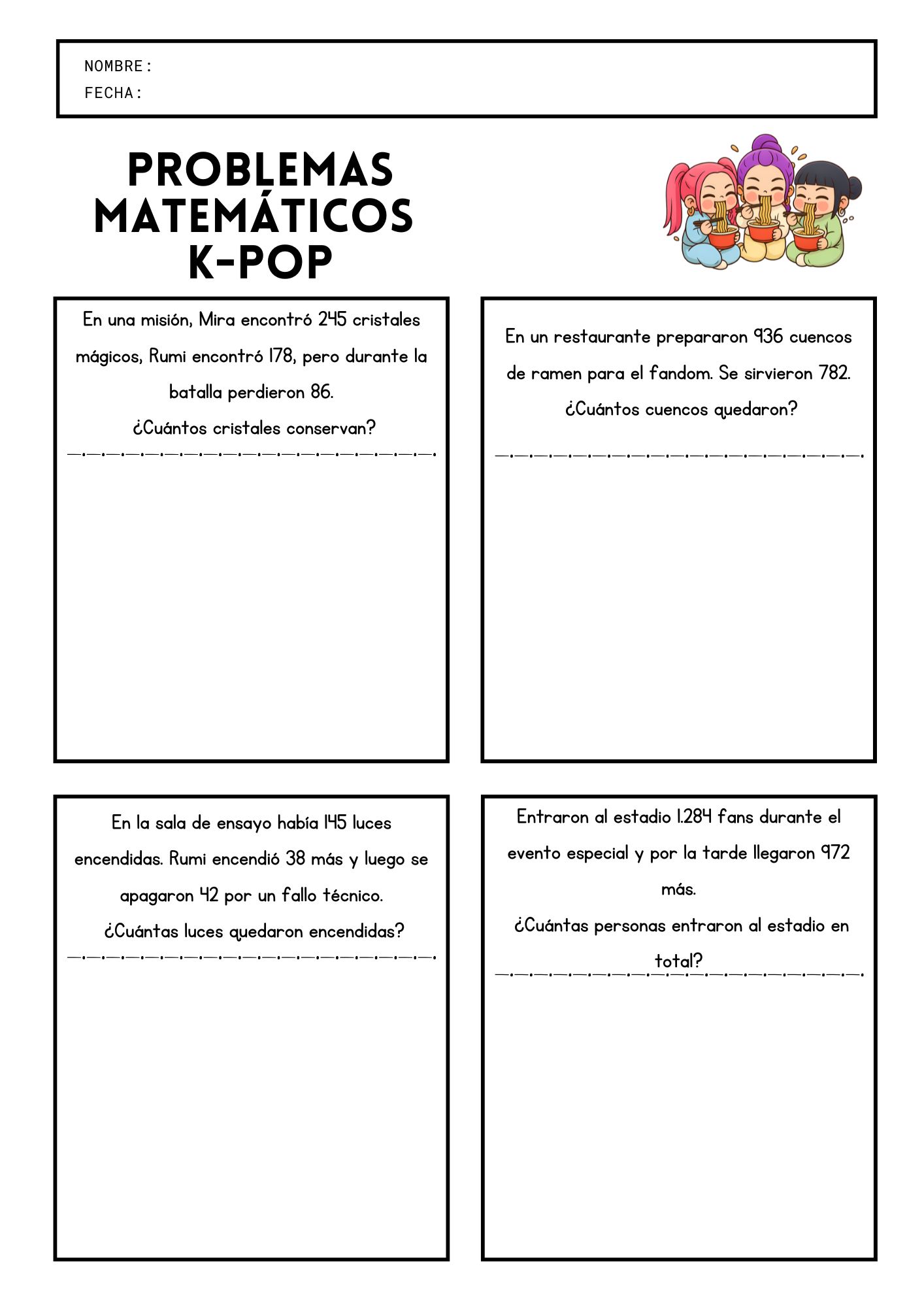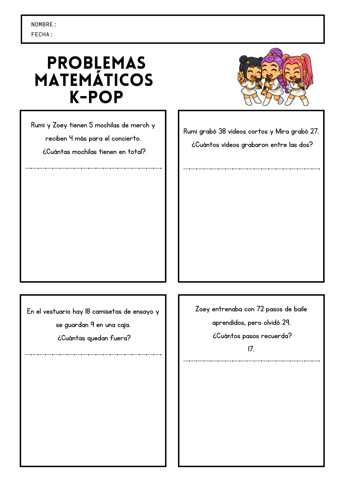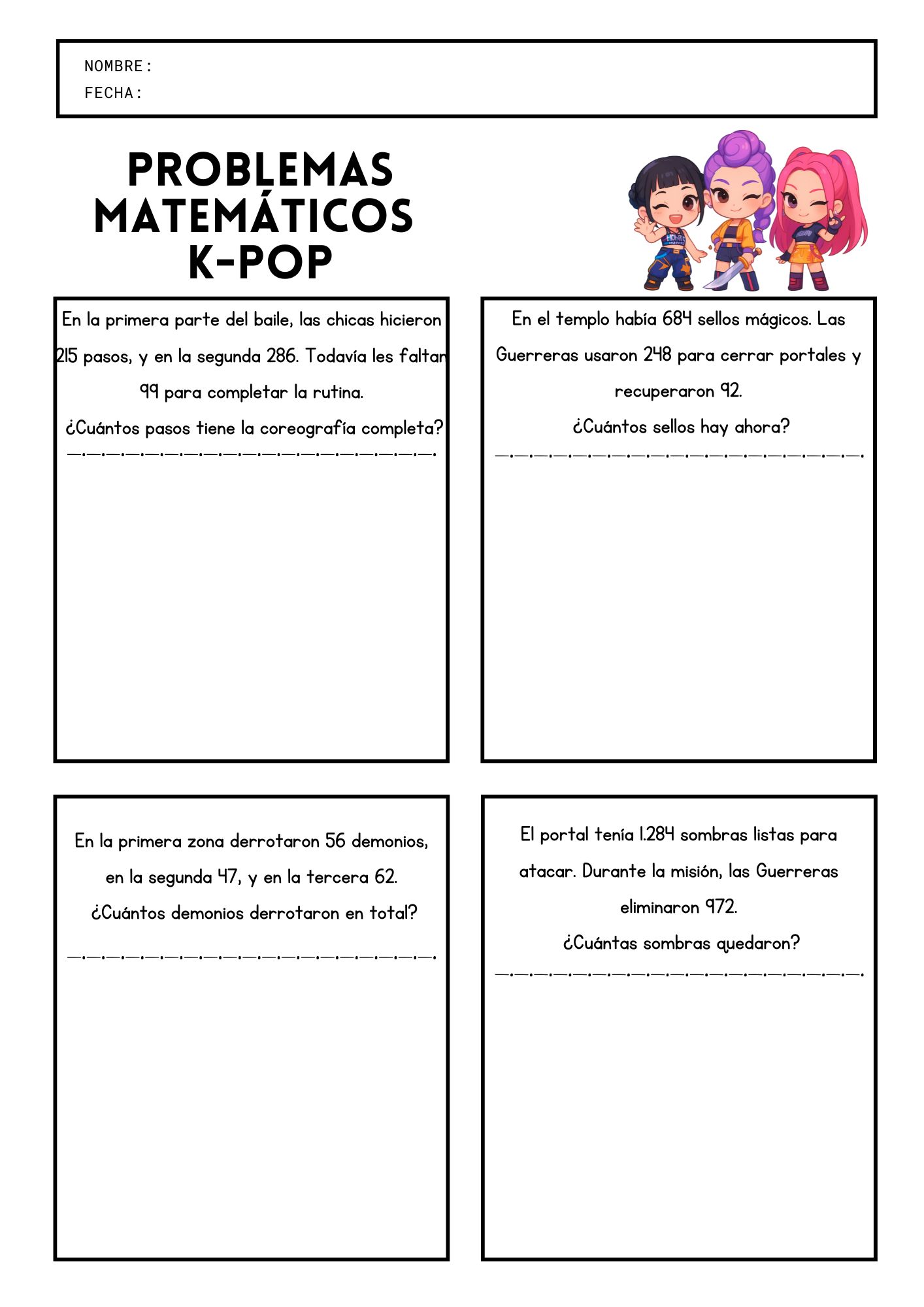 Las matemáticas se vuelven mucho más atractivas cuando se mezclan con los personajes favoritos de los alumnos. Por eso comparto una colección de problemas protagonizados por el fenómeno del momento, las guerreras K-pop y sus aventuras, diseñada para trabajar el cálculo y el razonamiento matemático de forma motivadora y divertida.