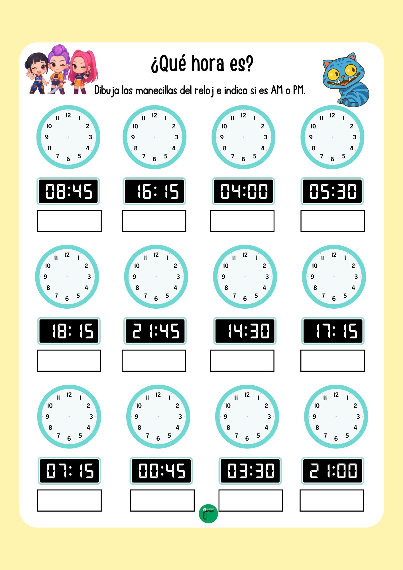 Aprender a leer la hora en relojes analógicos y digitales puede resultar un desafío para muchos alumnos. Para hacerlo más accesible, motivador y visual, hemos creado unas fichas que combinan aprendizaje matemático con un toque de cultura pop que encanta a los niños: las guerreras K-Pop, unos personajes ilustrados que acompañan y guían cada ejercicio.