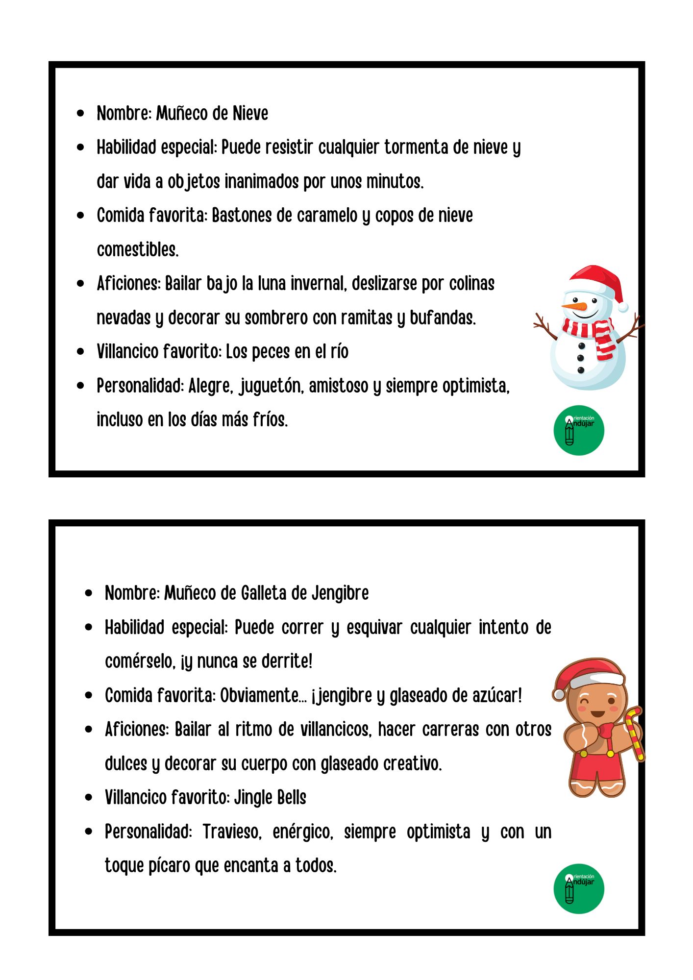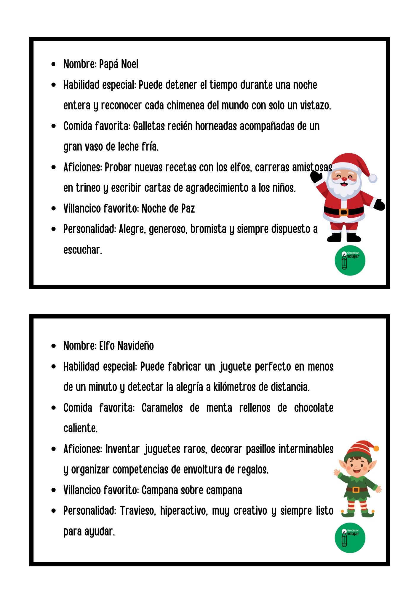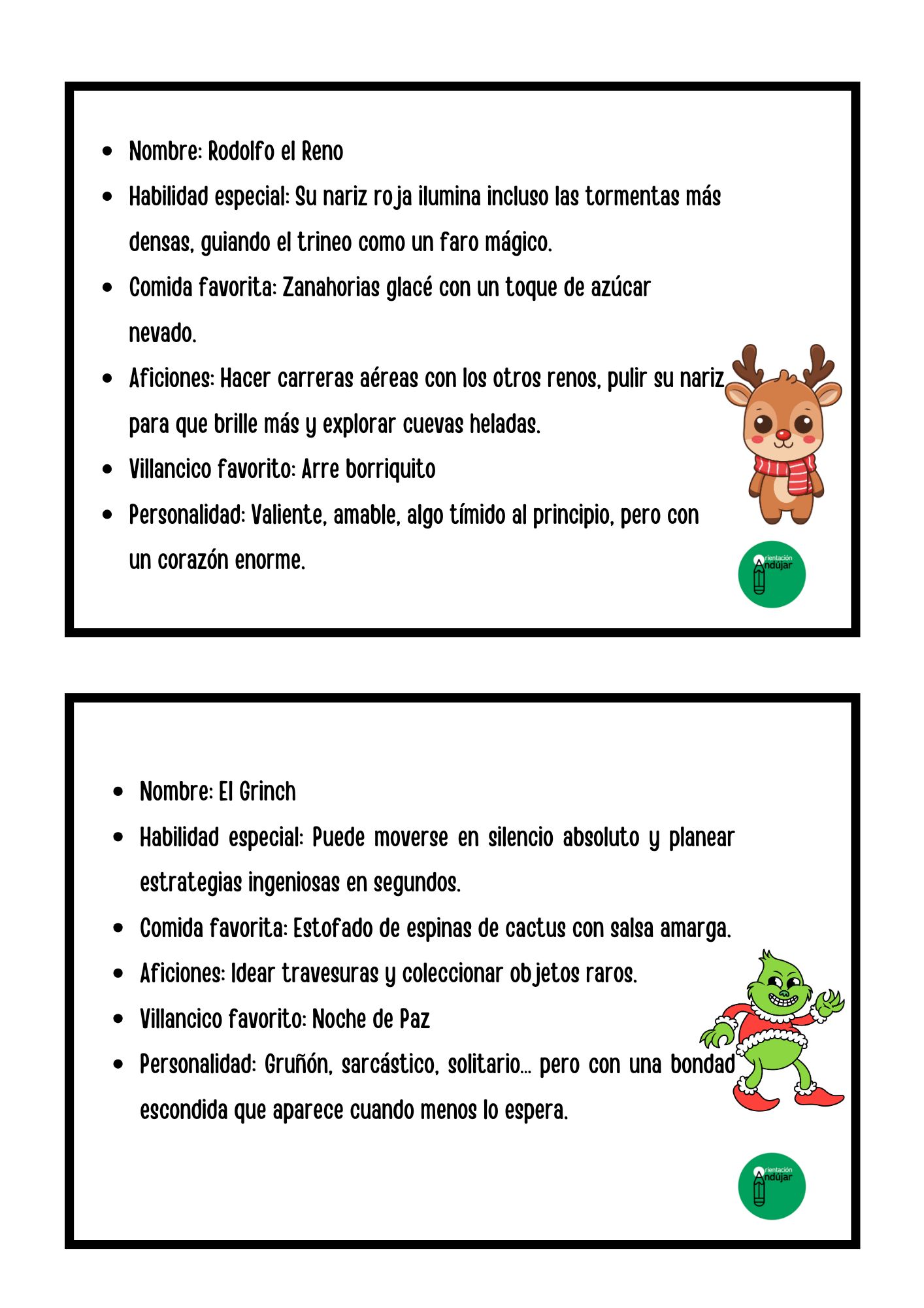 Hemos preparado una colección de tarjetas educativas con datos curiosos y divertidos sobre personajes navideños clásicos: Papá Noel, el Grinch, Rodolfo el Reno, el Muñeco de Nieve, el Elfo Navideño y el Muñeco de Galleta de Jengibre, entre otros.