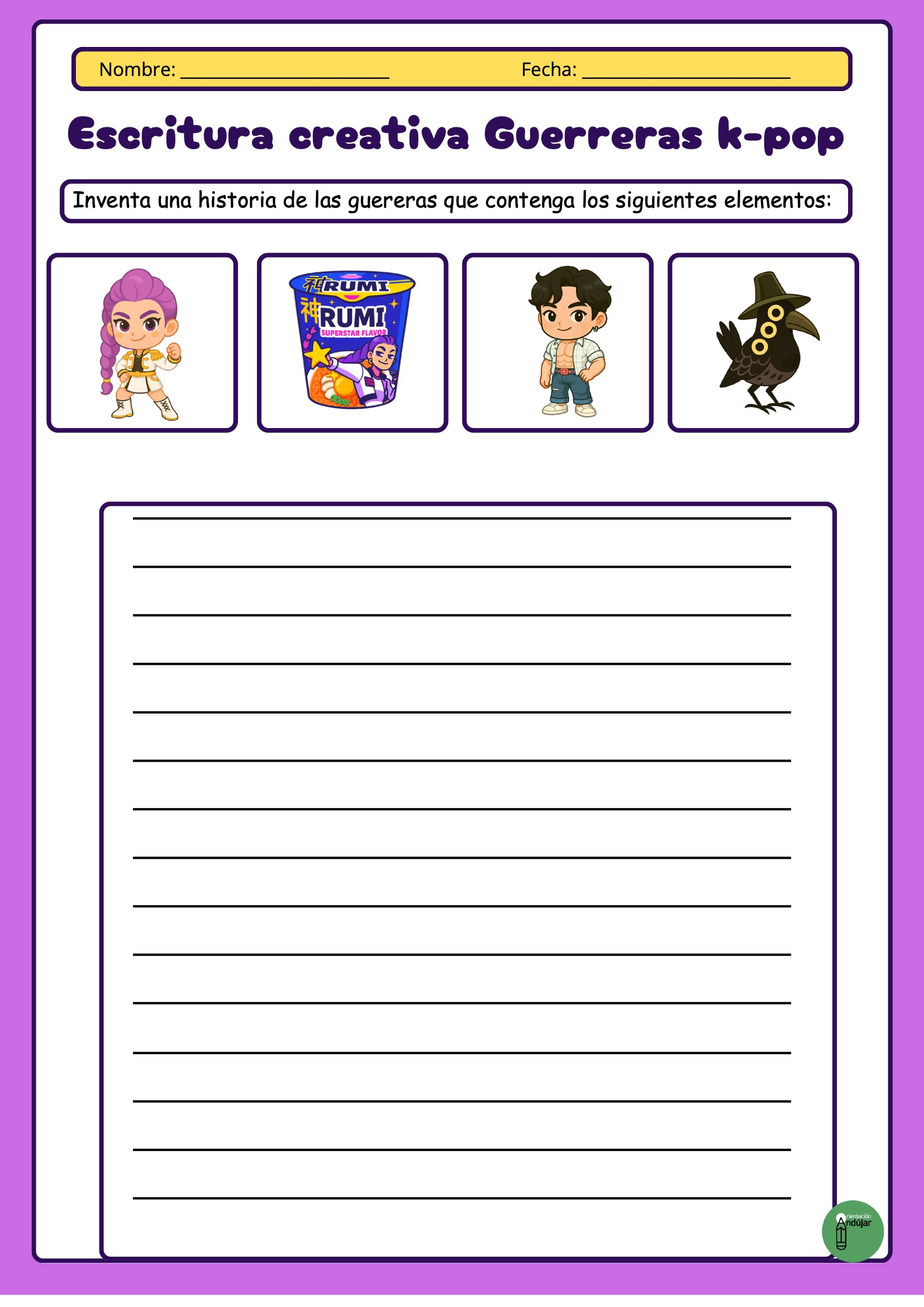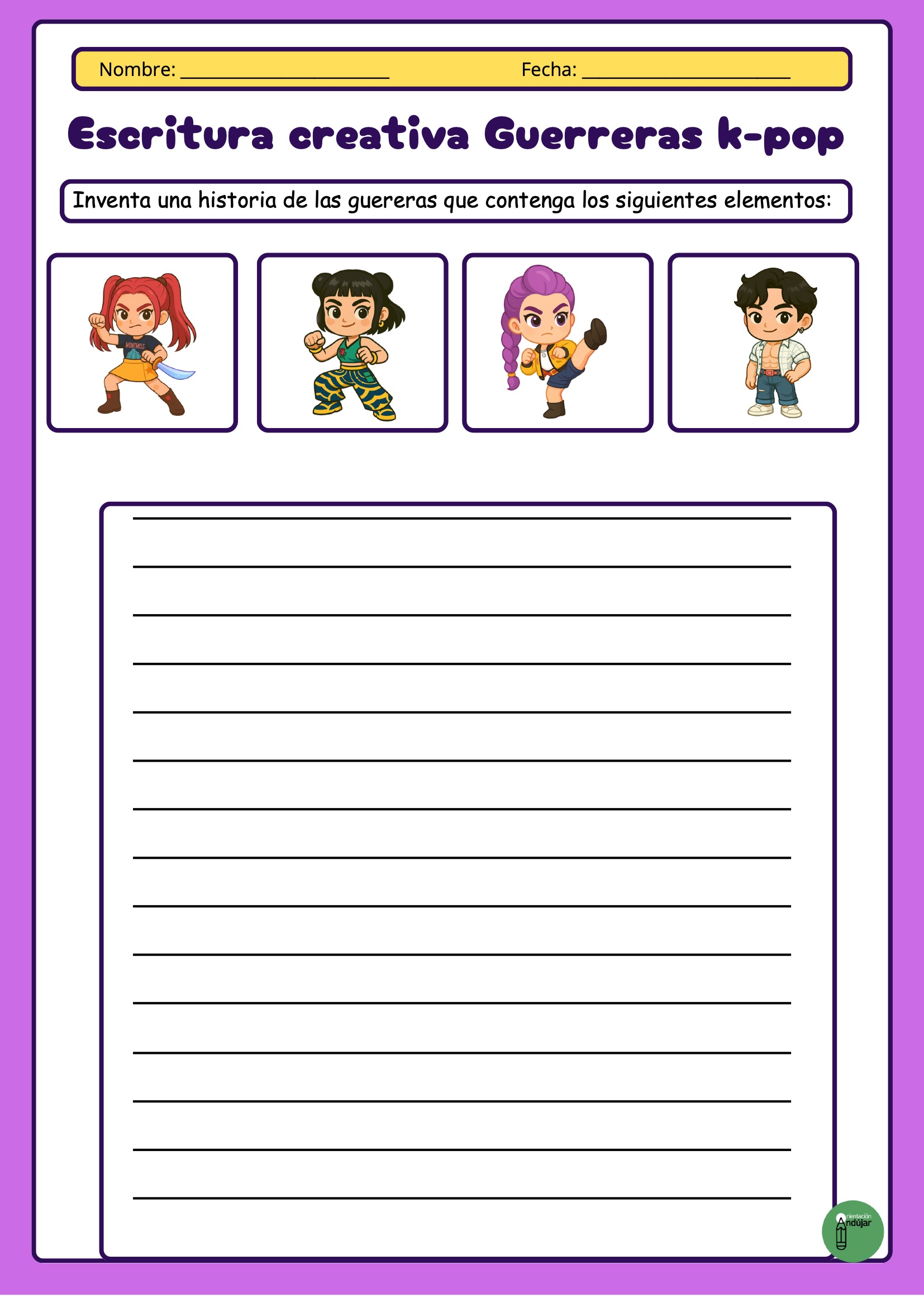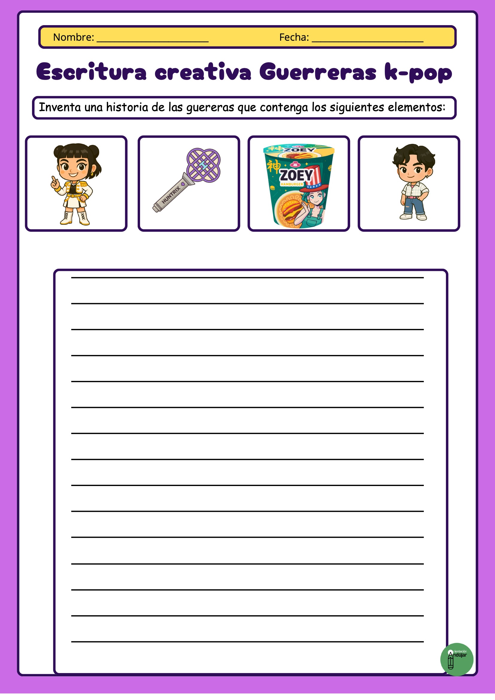 Hoy compartimos un material s煤per motivador para el aula: fichas de escritura creativa inspiradas en las Guerreras de K-Pop, un recurso visual y divertido que impulsa la imaginaci贸n del alumnado a partir de ilustraciones llenas de color, movimiento y energ铆a.