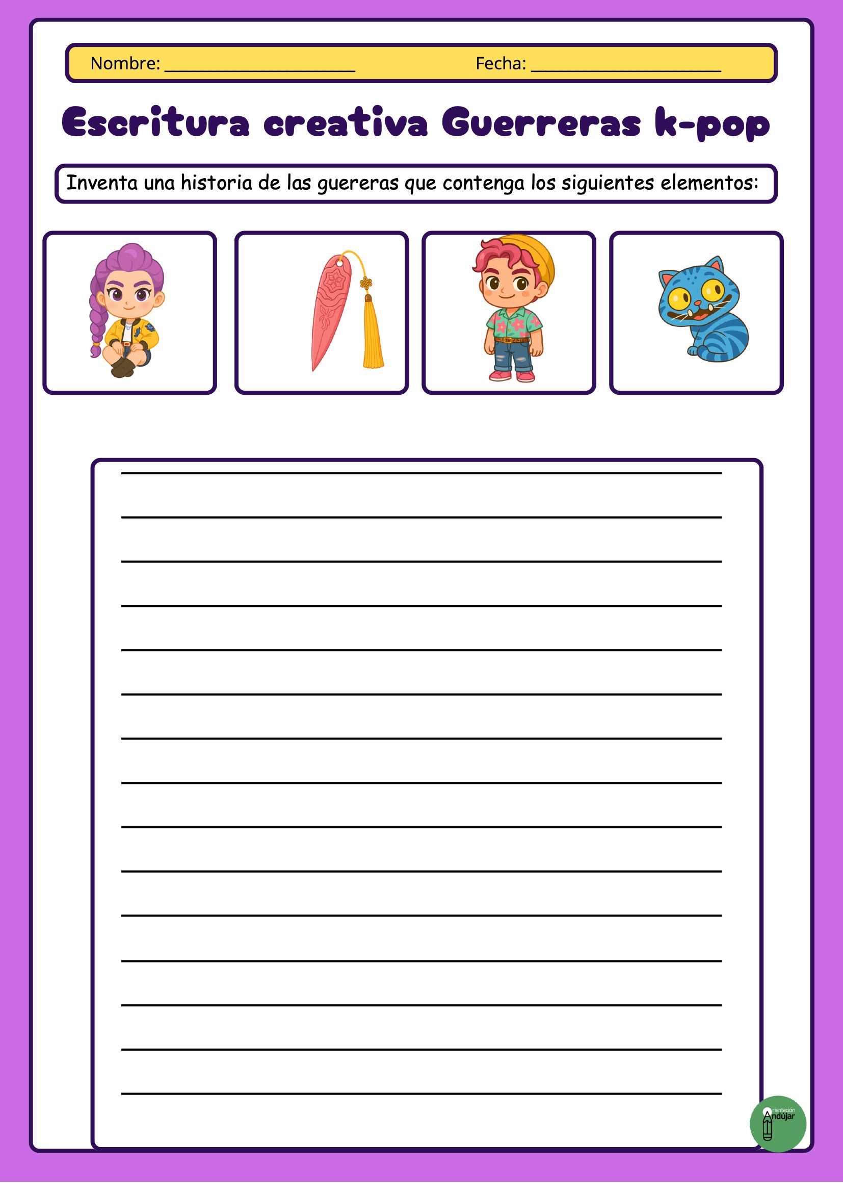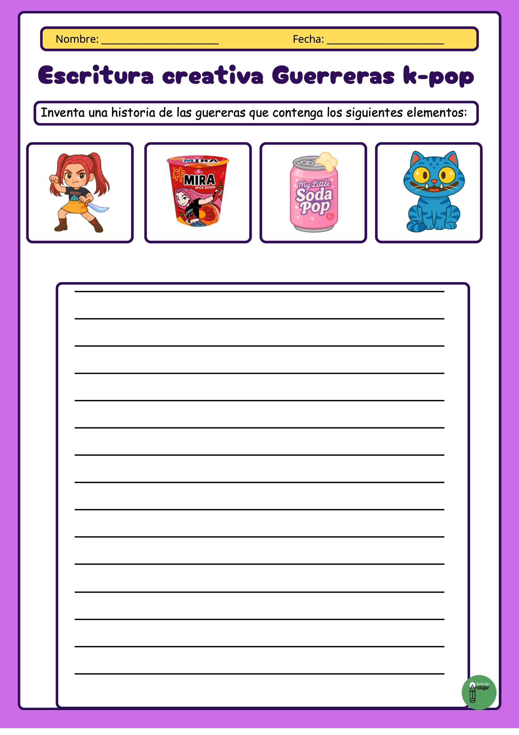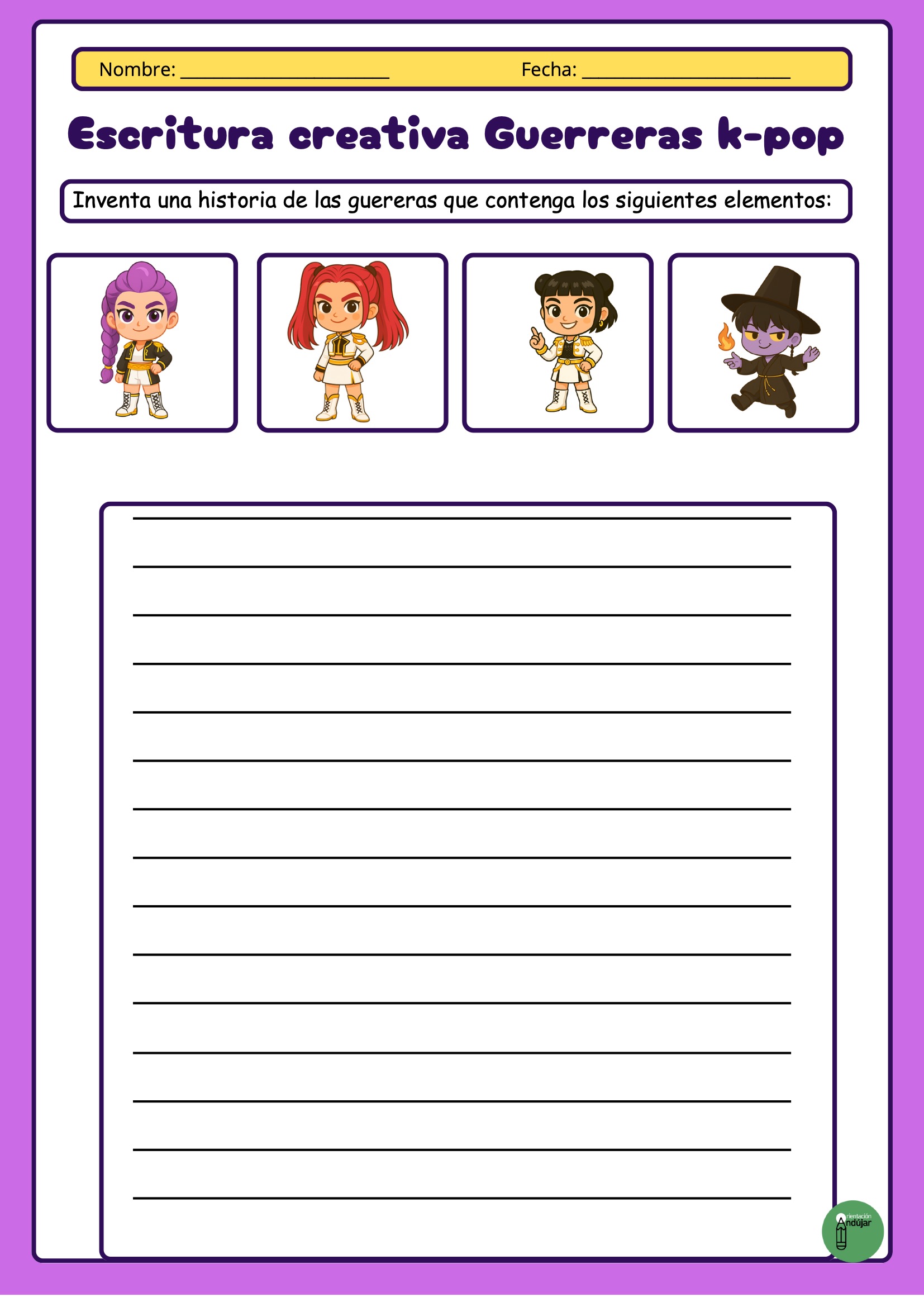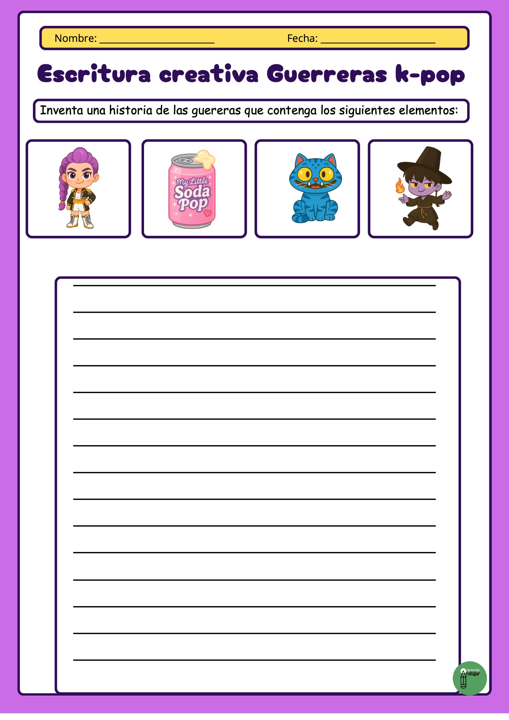 Hoy compartimos un material s煤per motivador para el aula: fichas de escritura creativa inspiradas en las Guerreras de K-Pop, un recurso visual y divertido que impulsa la imaginaci贸n del alumnado a partir de ilustraciones llenas de color, movimiento y energ铆a.