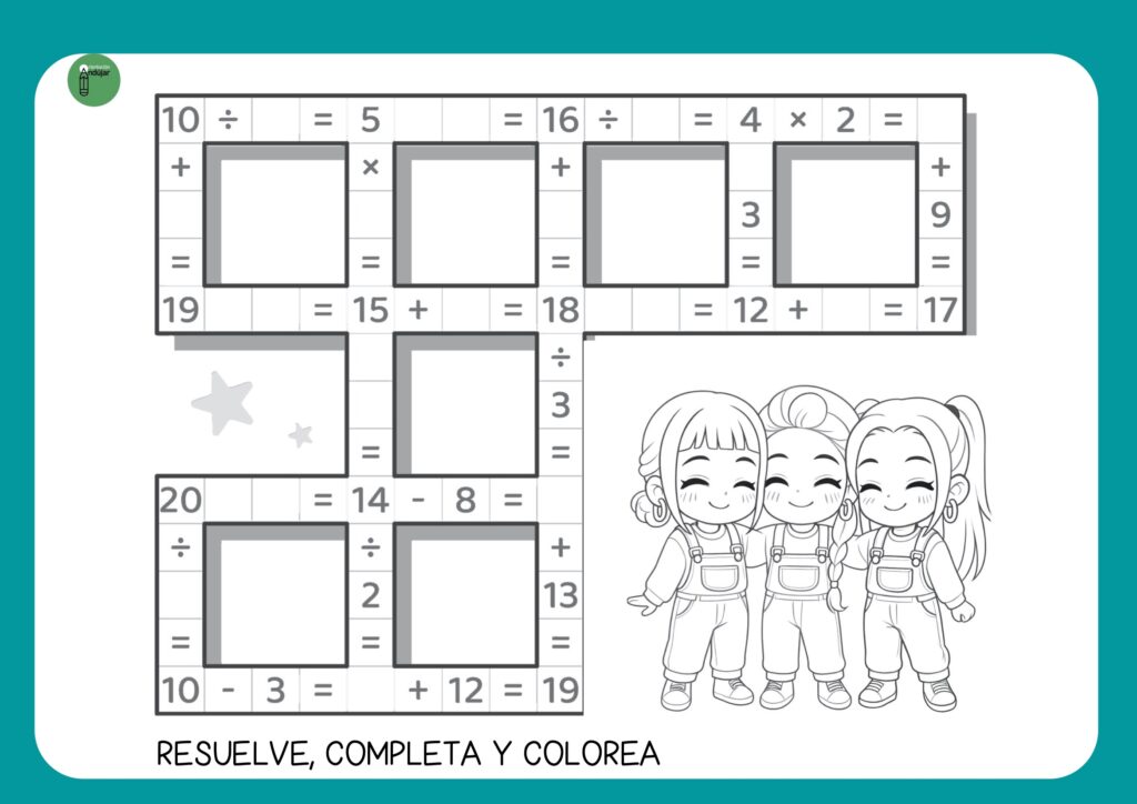 Actividades de resuelve, completa y colorea, ideales para reforzar el cálculo