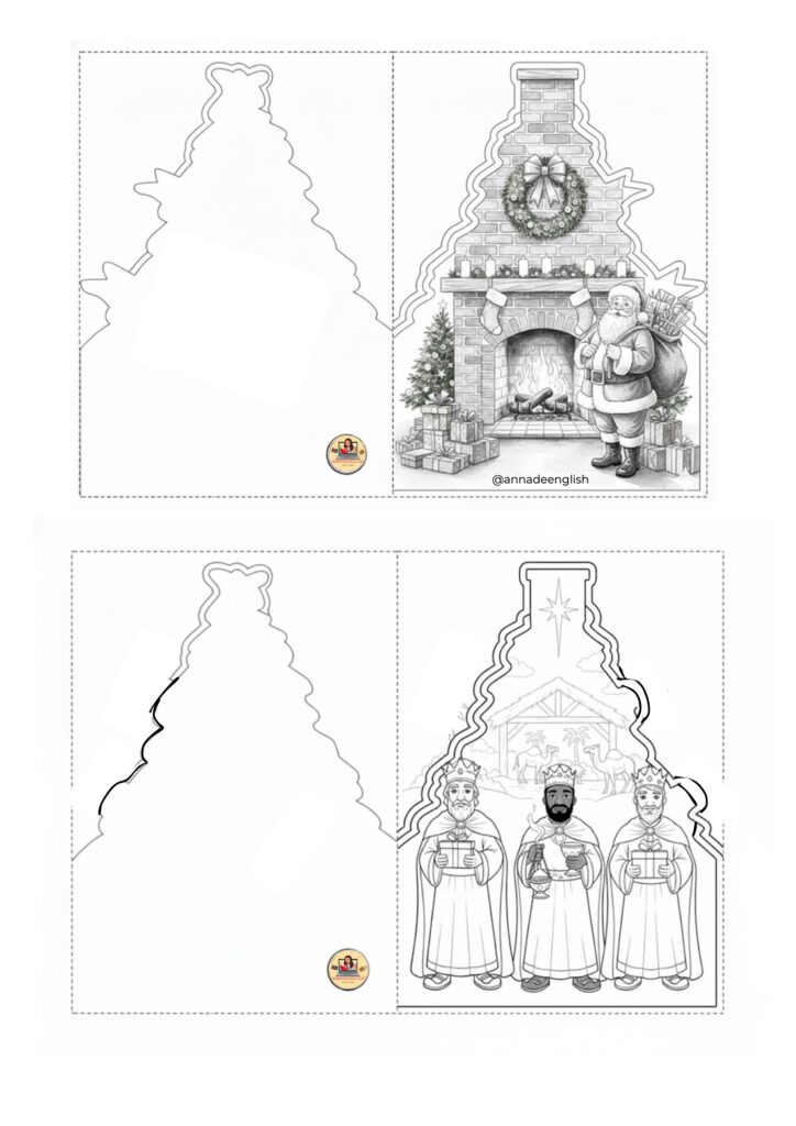 🎁 Tarjetas ilustradas para colorear: Papá Noel, árboles navideños, elfos, Reyes Magos y chimeneas (páginas 14–16).
