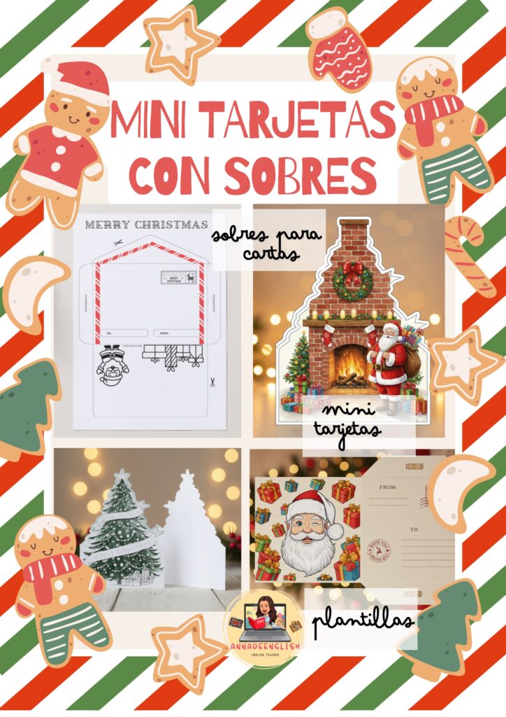 En este material encontrarás plantillas imprimibles, sobres listos para montar y tarjetas con diseños navideños encantadores que tus alumnos podrán colorear, recortar y personalizar.