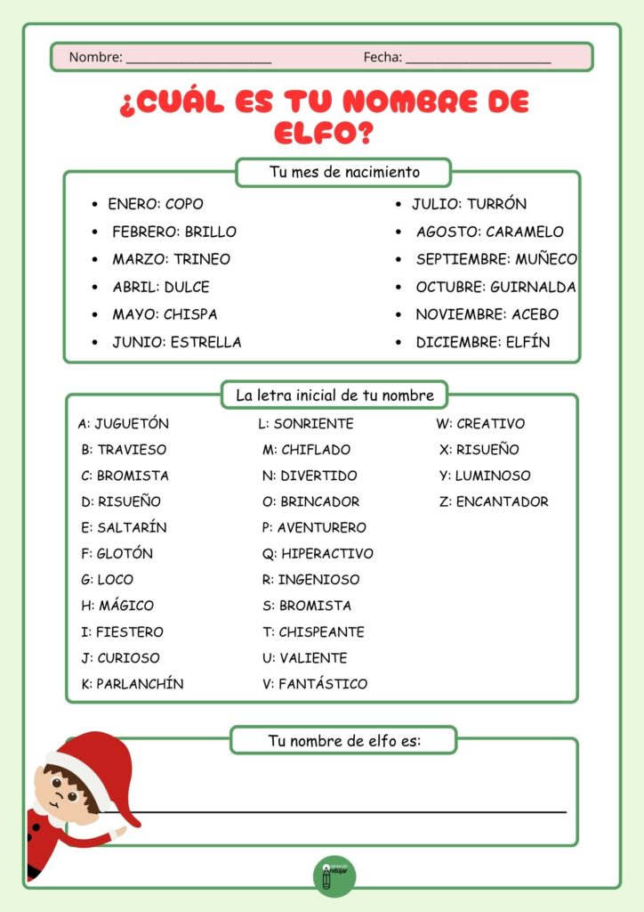 En esta propuesta, los alumnos deberán averiguar su nombre de elfo navideño teniendo en cuenta dos cosas: su mes de nacimiento y la primera letra de su nombre. Cada mes está asociado a un nombre de elfo divertido y original, y cada letra del abecedario a un adjetivo creativo. Al combinarlos, los estudiantes obtienen un nombre único, lleno de magia y espíritu navideño.