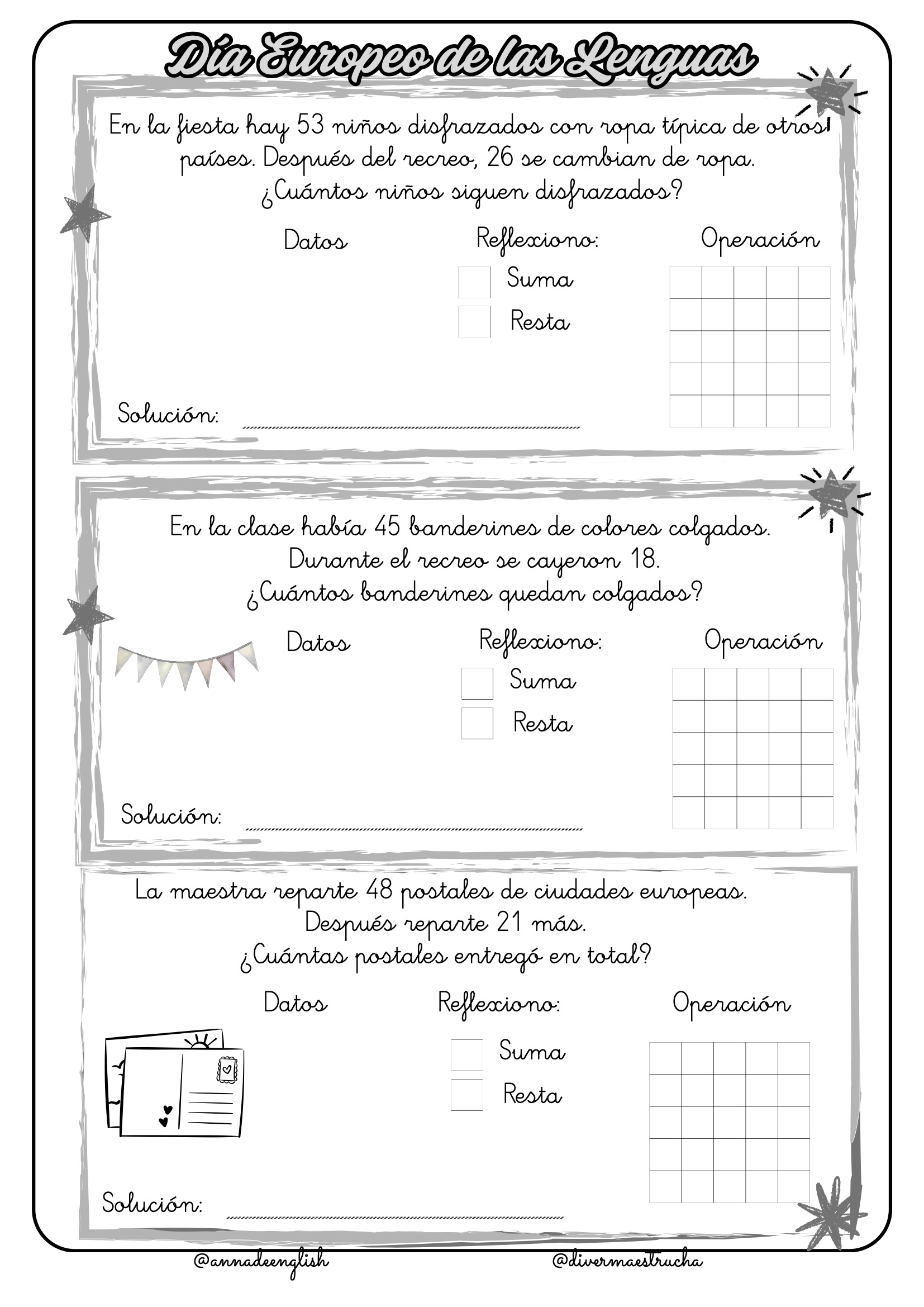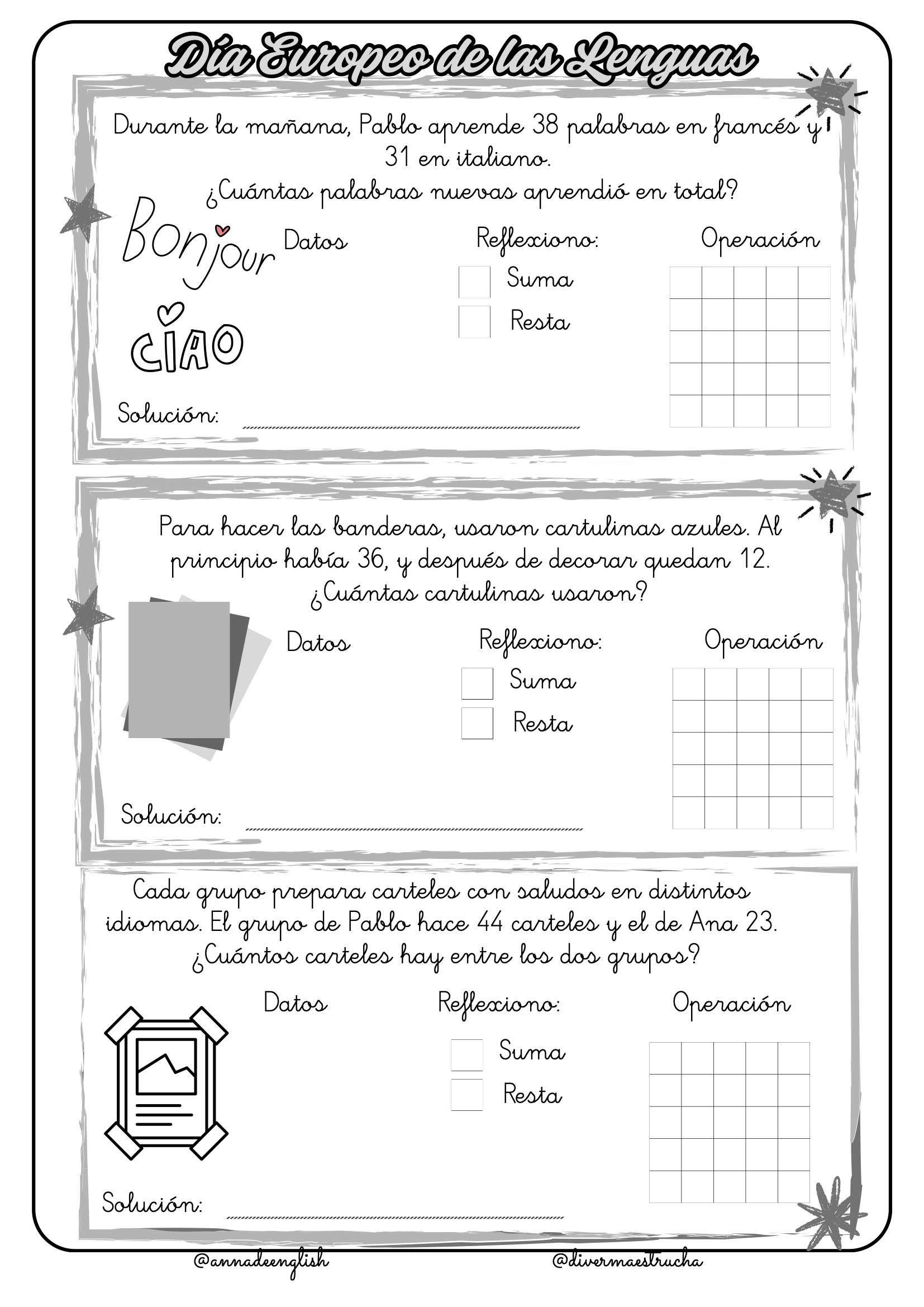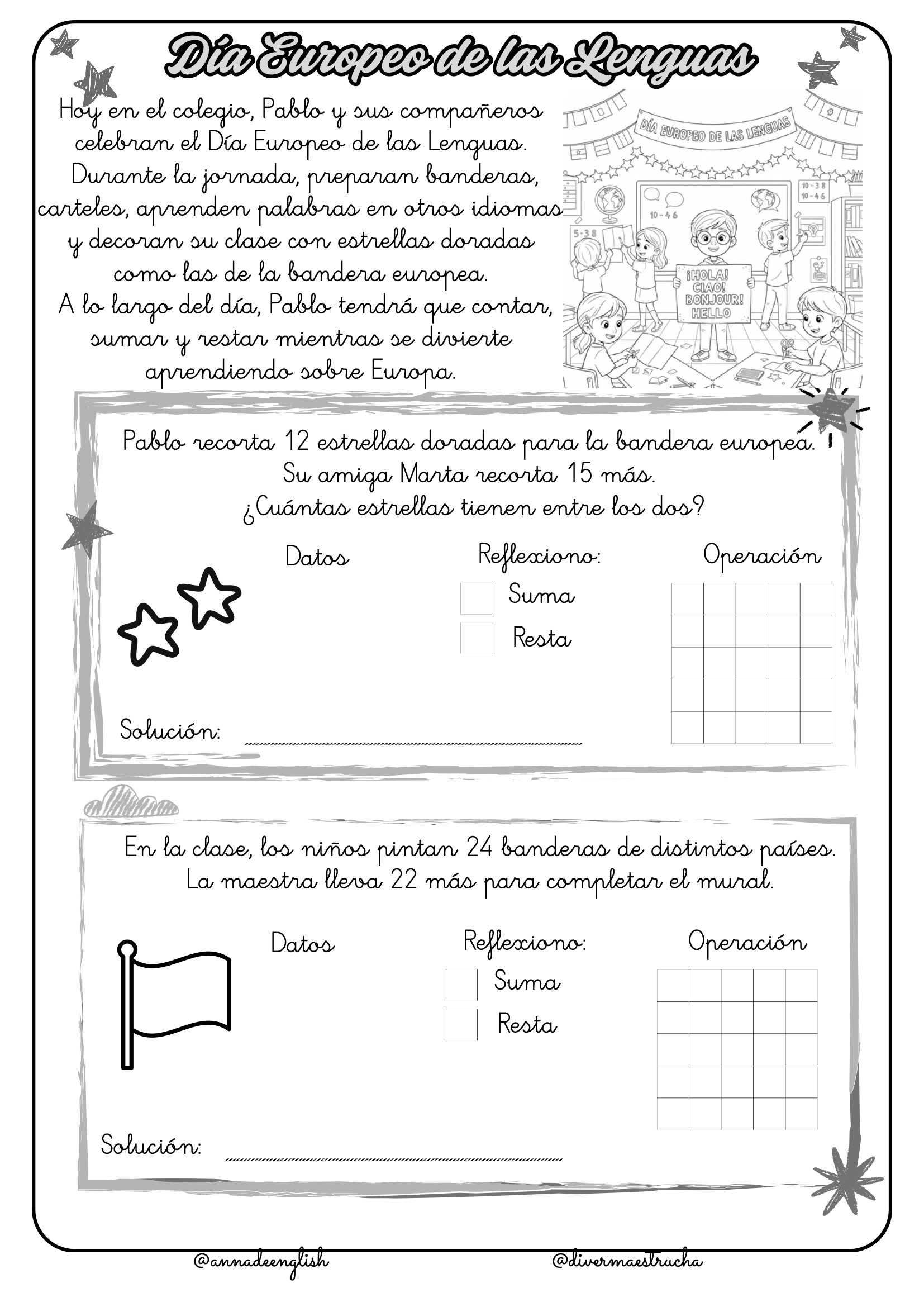 Día Europeo de las Lenguas: Con el personaje de Pablo, los estudiantes suman y restan mientras aprenden sobre idiomas, banderas y decoraciones para celebrar la diversidad lingüística de Europa.
