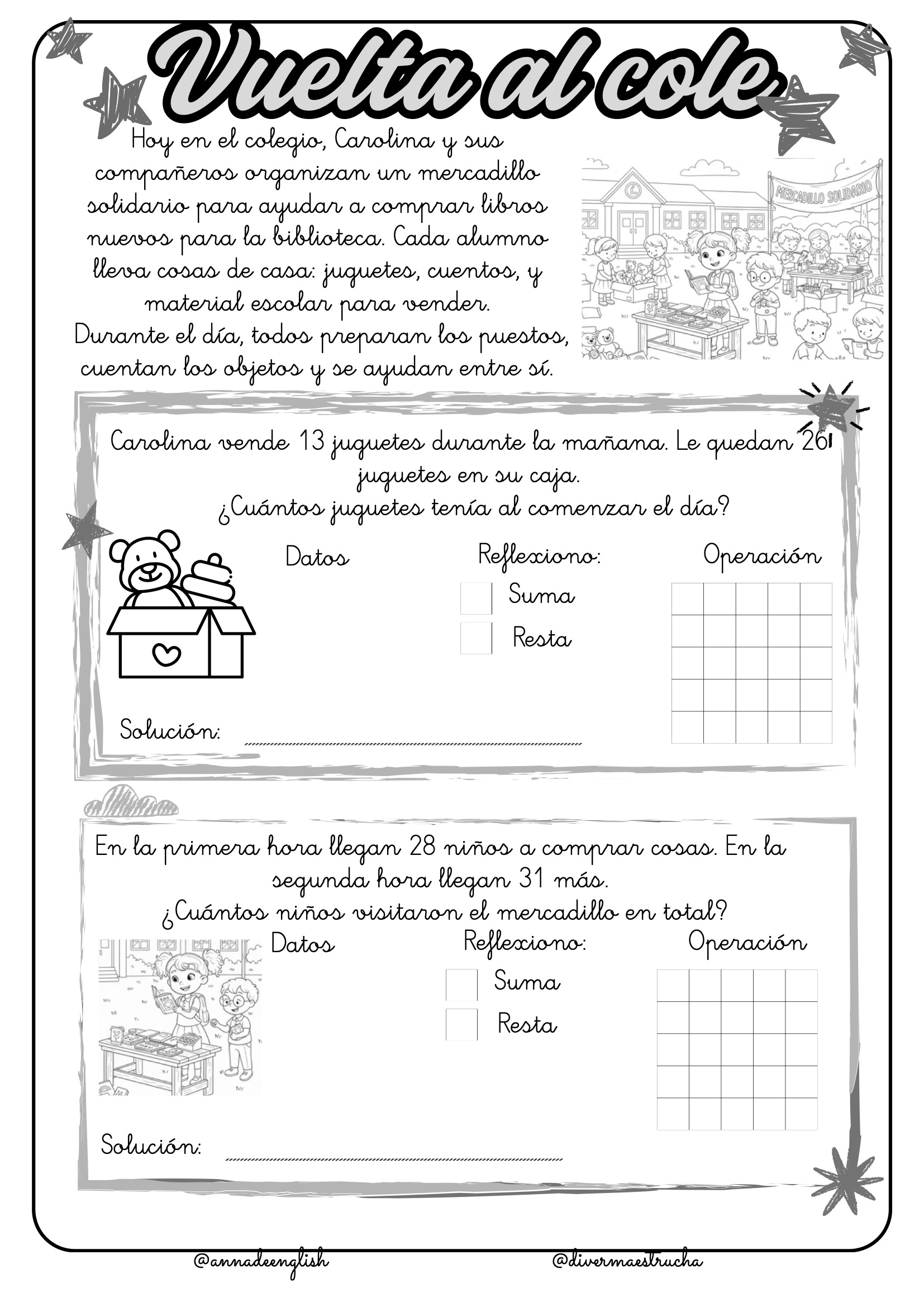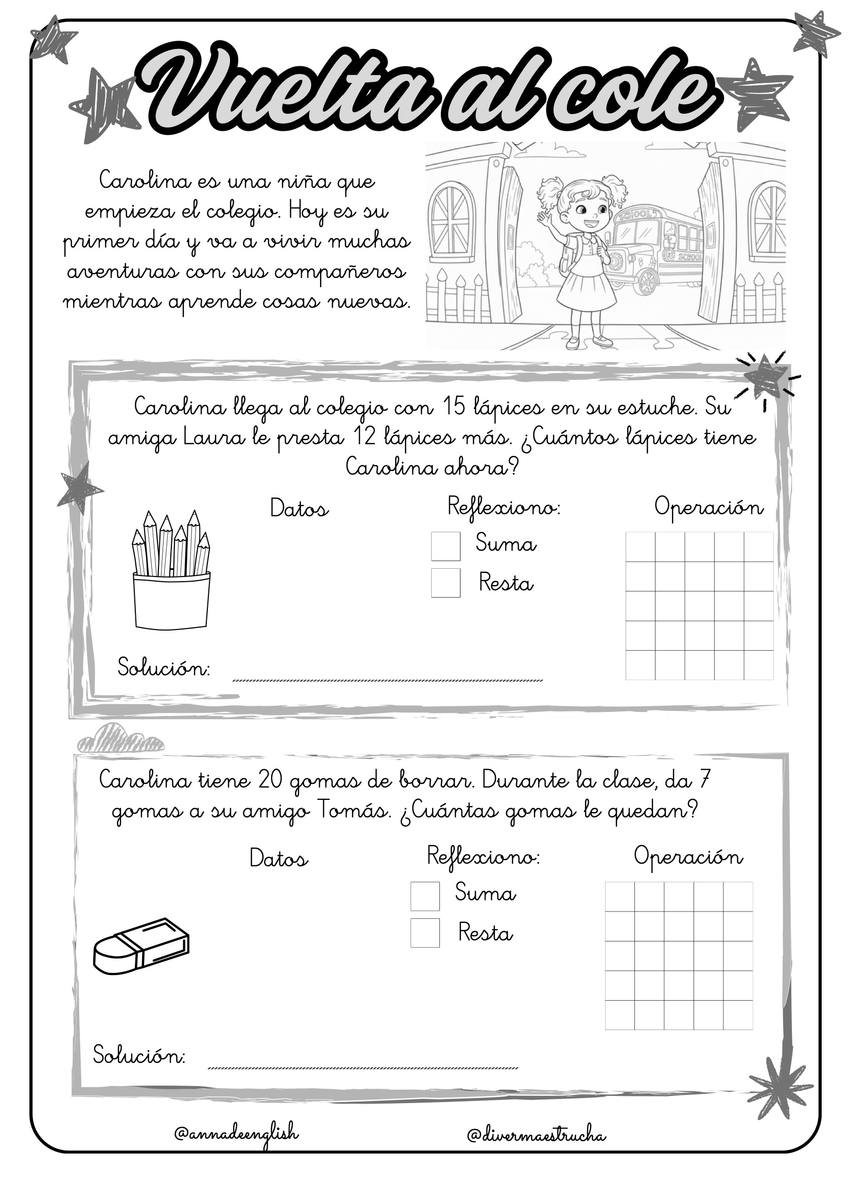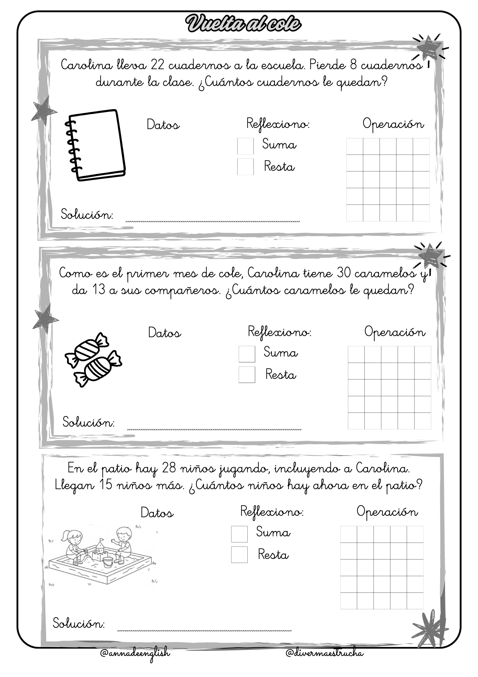 Vuelta al Cole: Los problemas giran en torno a las aventuras de Carolina en su primer día de clases, contando lápices, gomas, cuadernos, caramelos y sillas. Incluso participan en un emocionante mercadillo solidario.