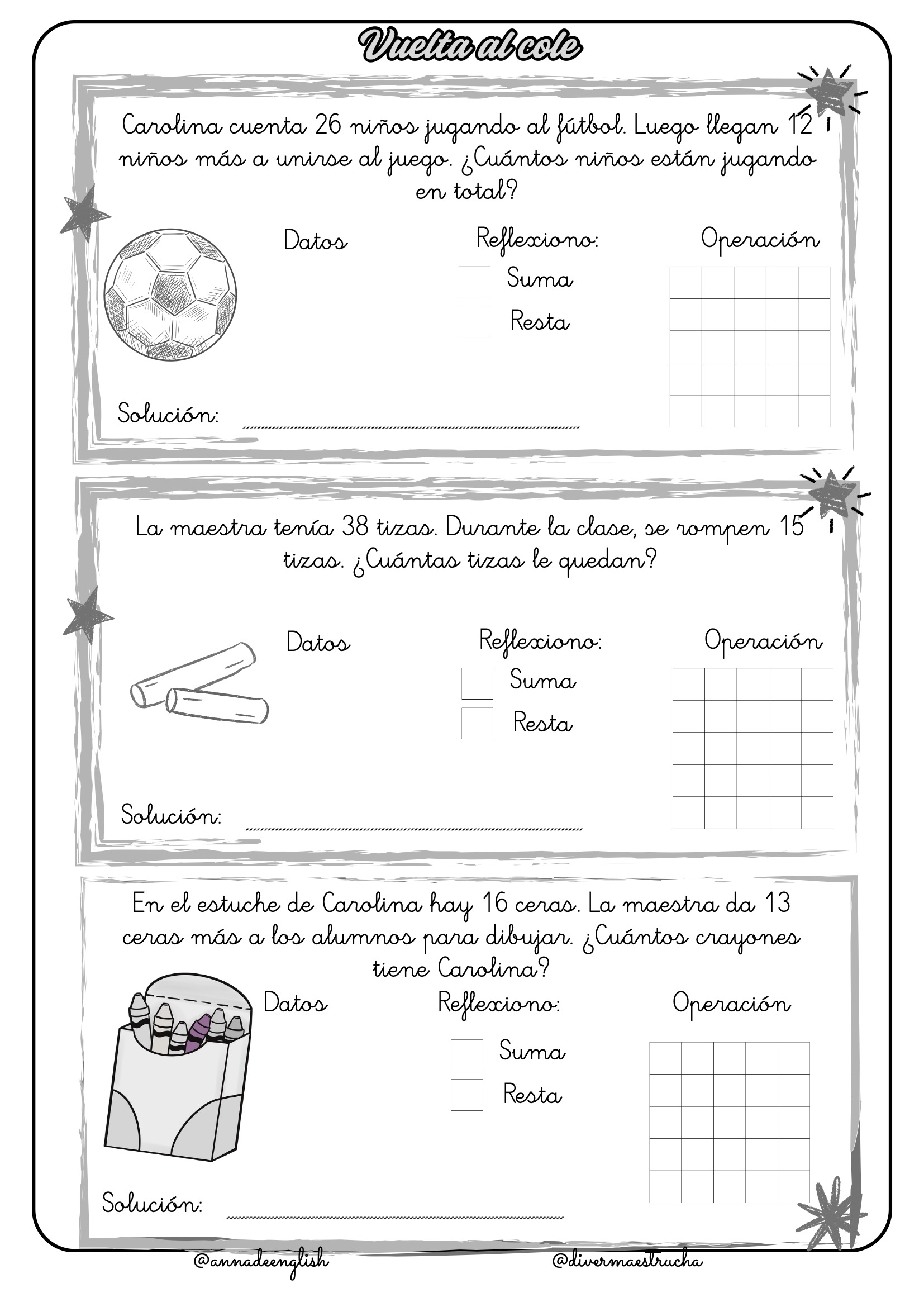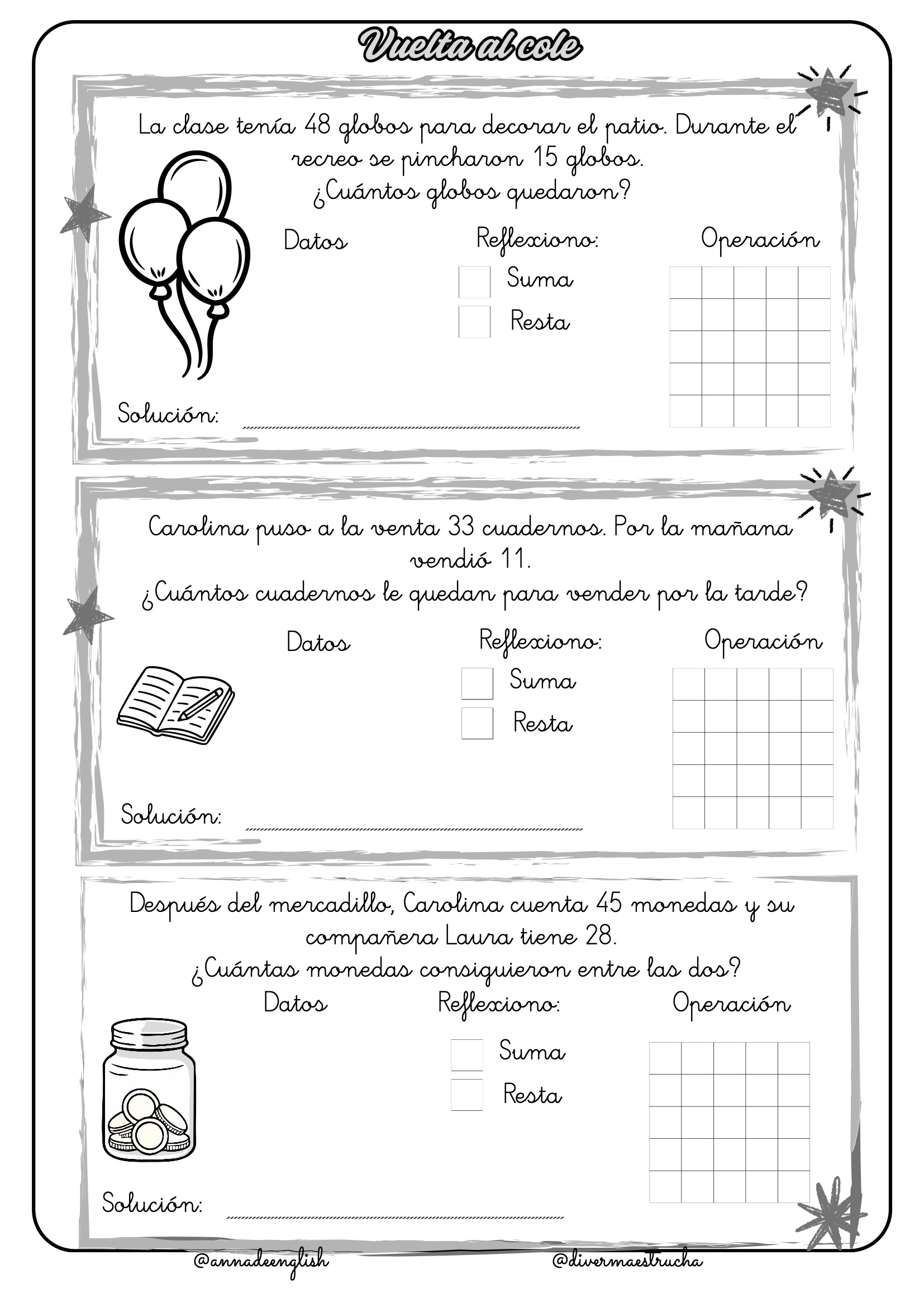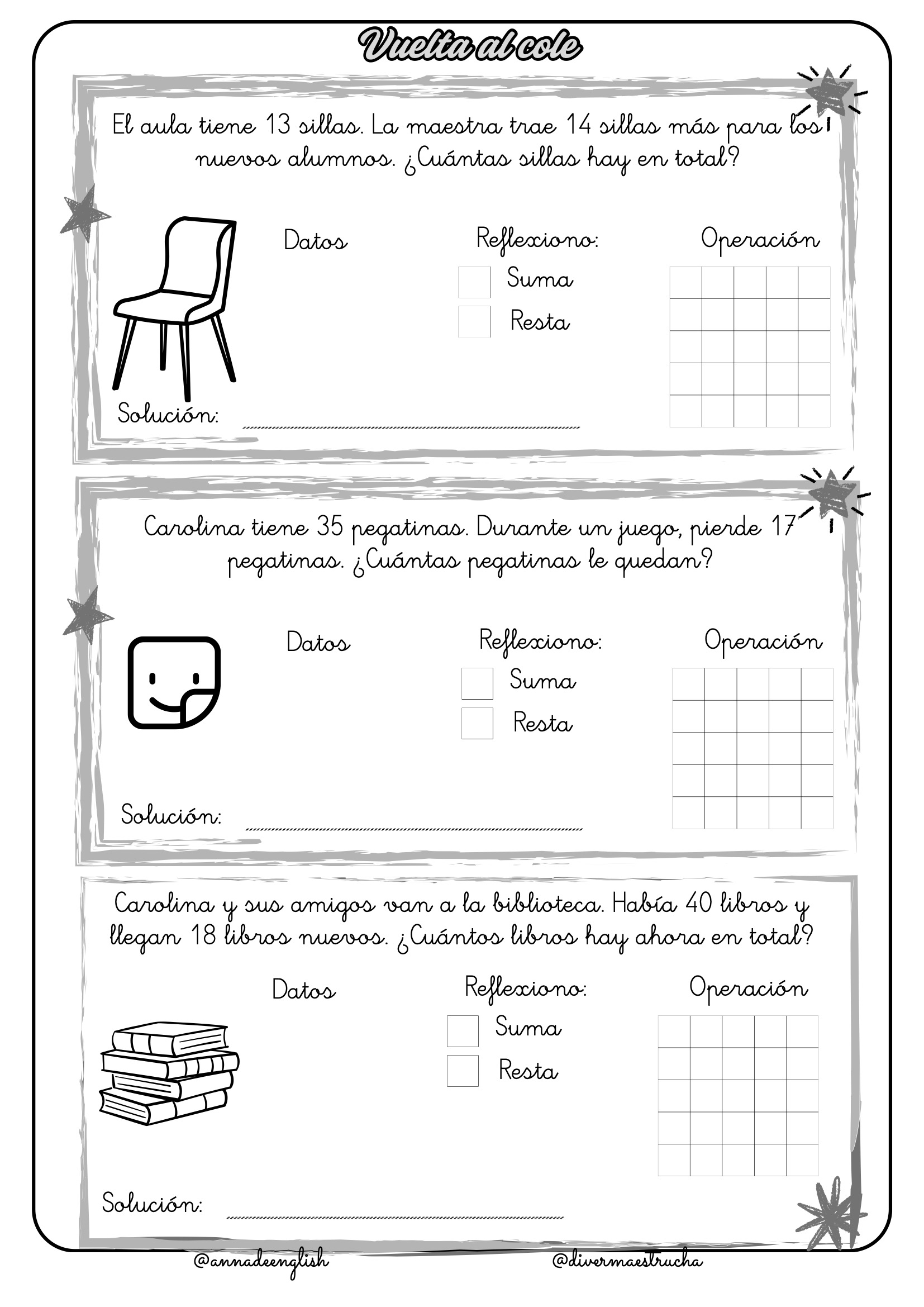 Vuelta al Cole: Los problemas giran en torno a las aventuras de Carolina en su primer día de clases, contando lápices, gomas, cuadernos, caramelos y sillas. Incluso participan en un emocionante mercadillo solidario.