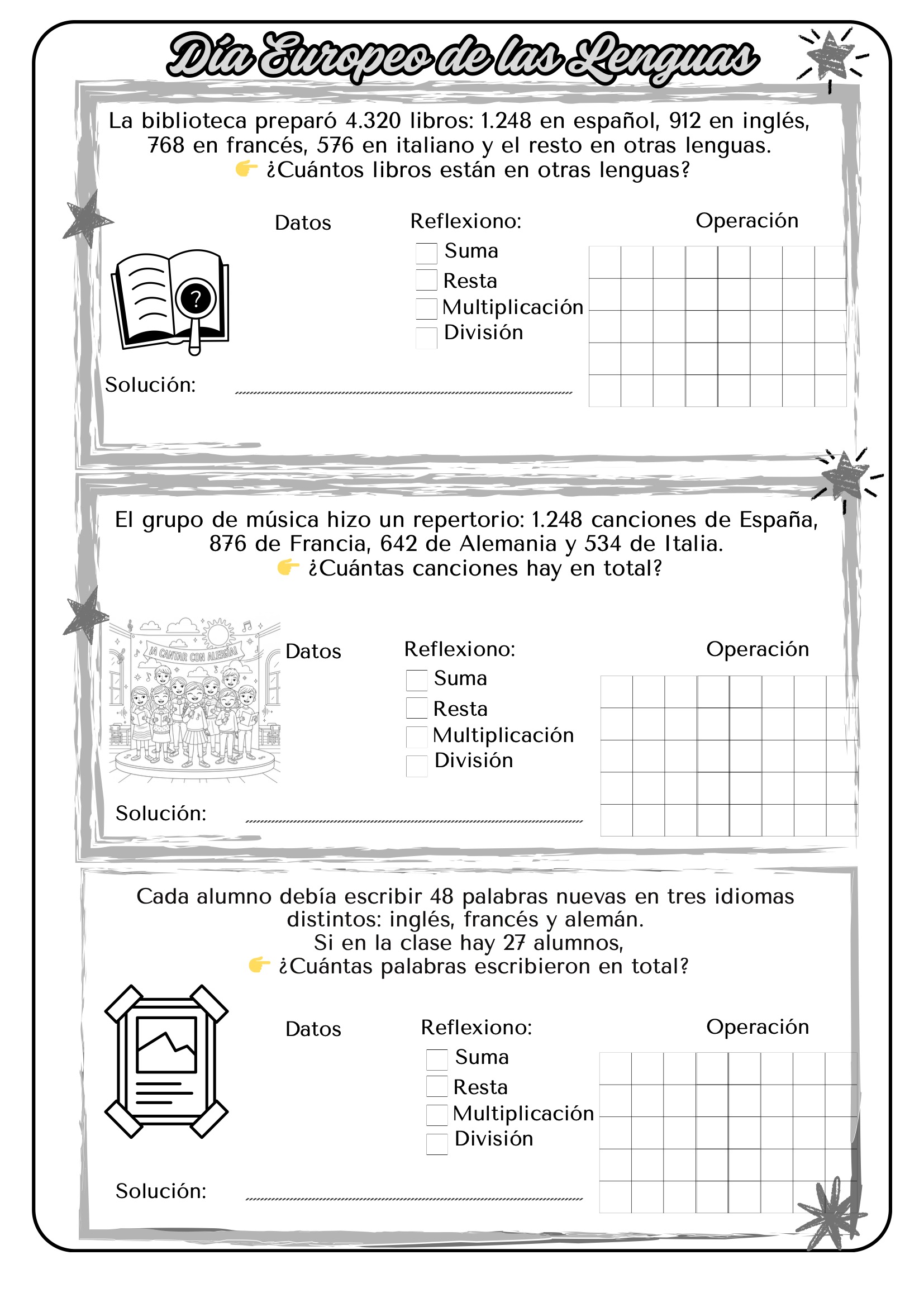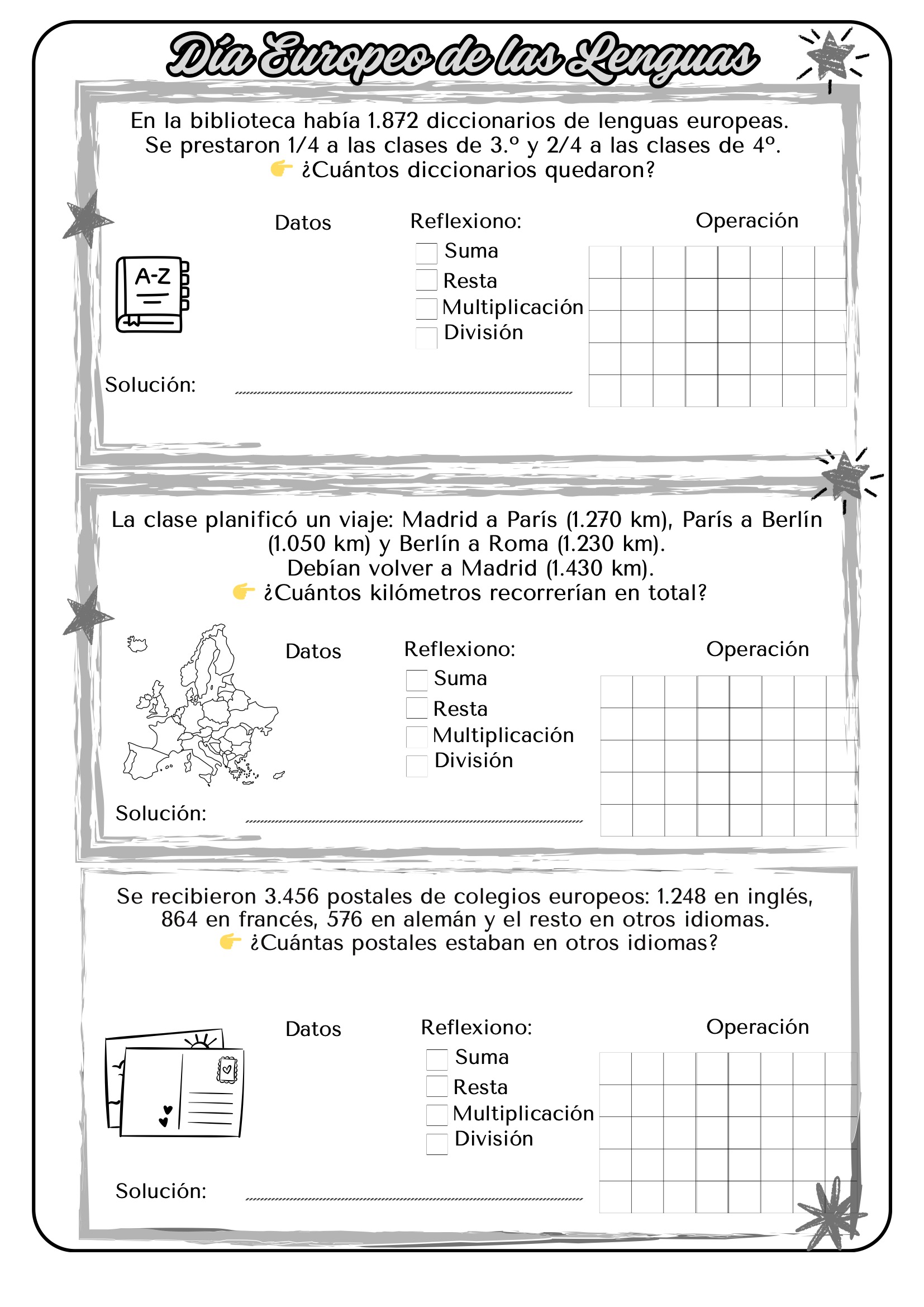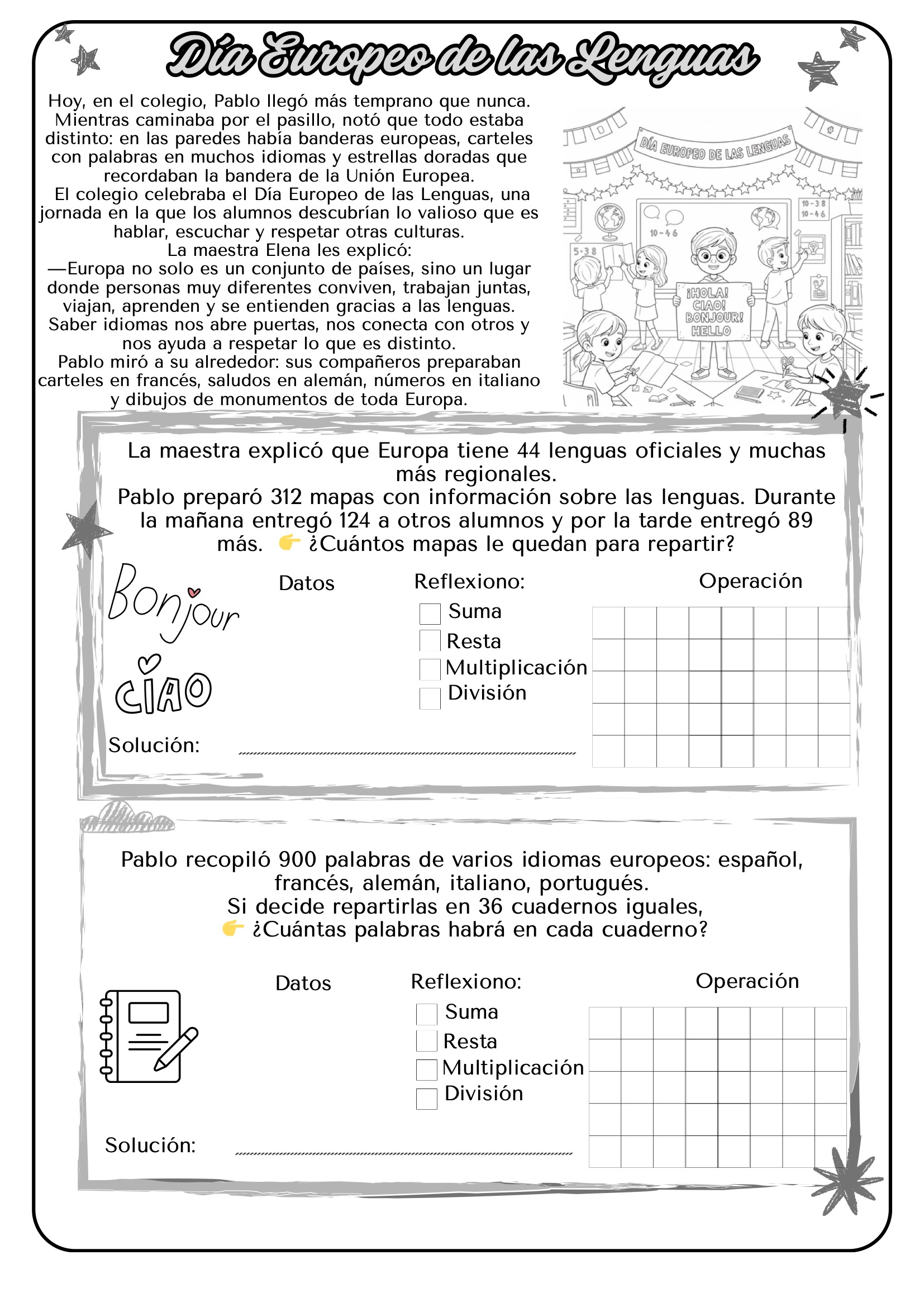 Día Europeo de las Lenguas: Con el personaje de Pablo, los estudiantes suman y restan mientras aprenden sobre idiomas, banderas y decoraciones para celebrar la diversidad lingüística de Europa.