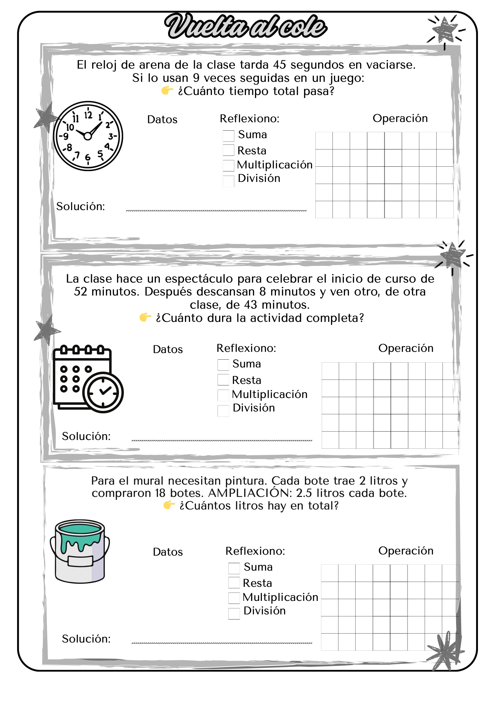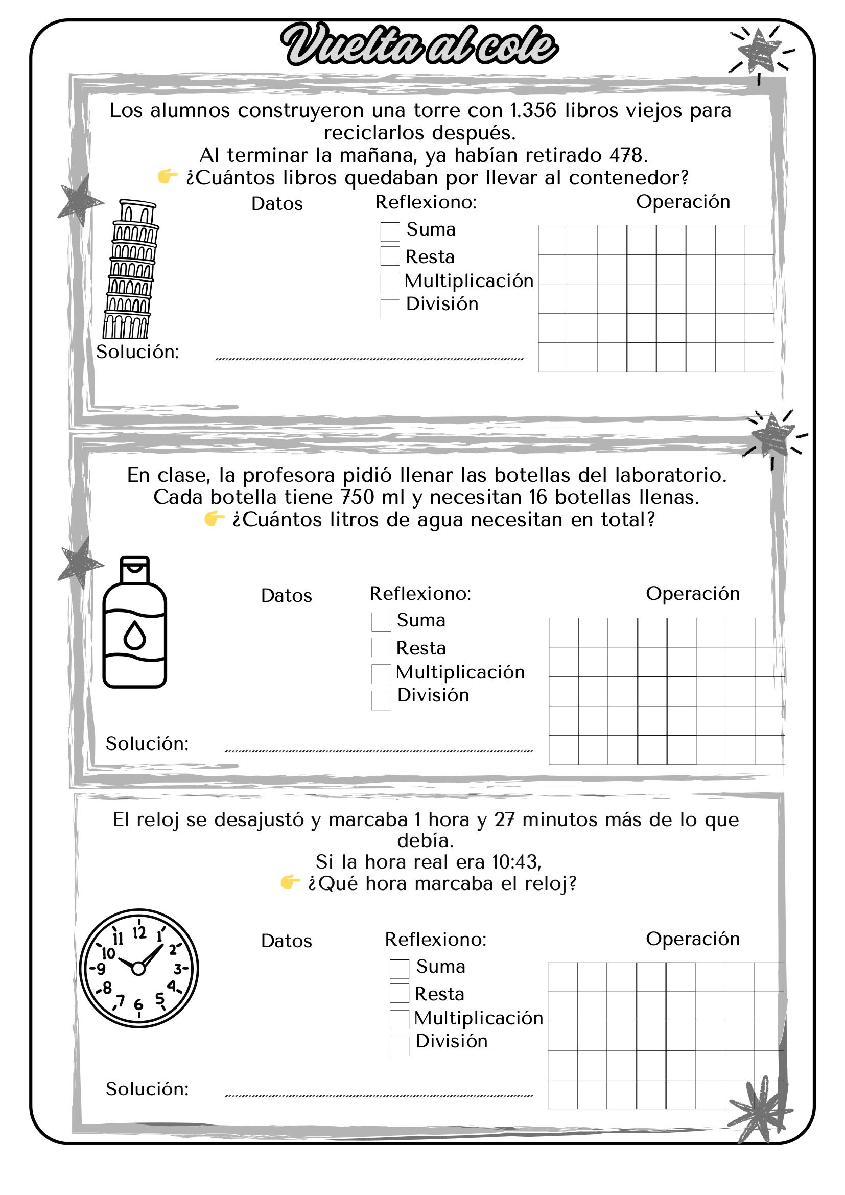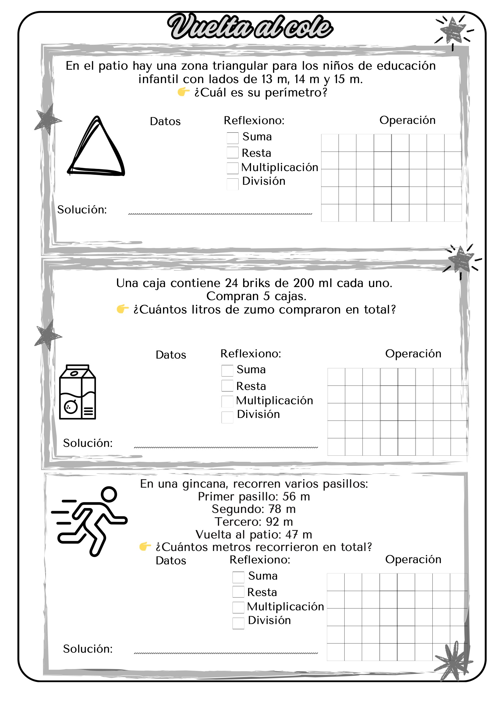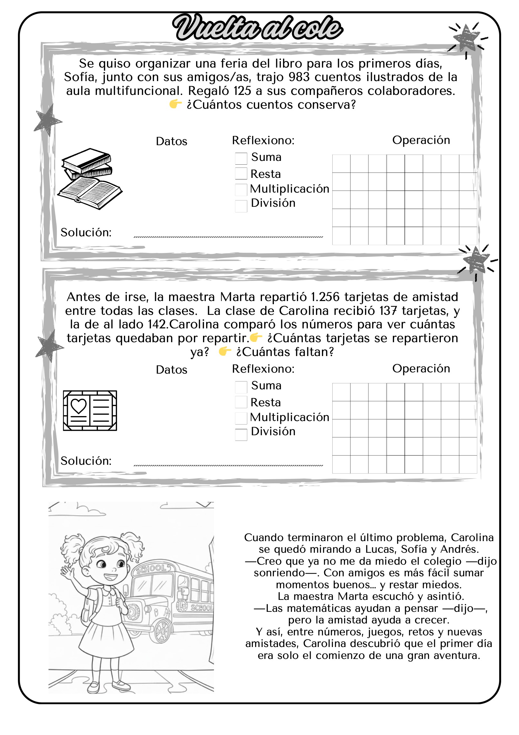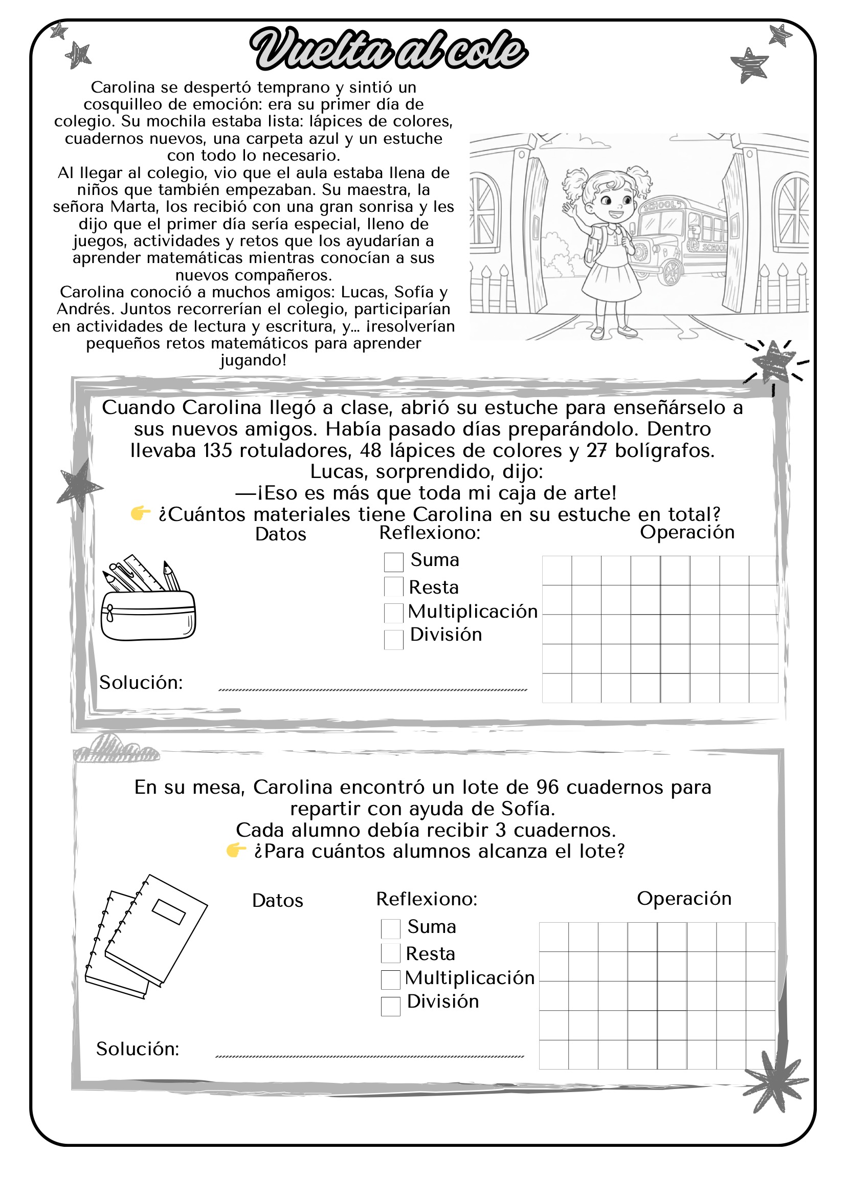 Vuelta al Cole: Los problemas giran en torno a las aventuras de Carolina en su primer día de clases, contando lápices, gomas, cuadernos, caramelos y sillas. Incluso participan en un emocionante mercadillo solidario.