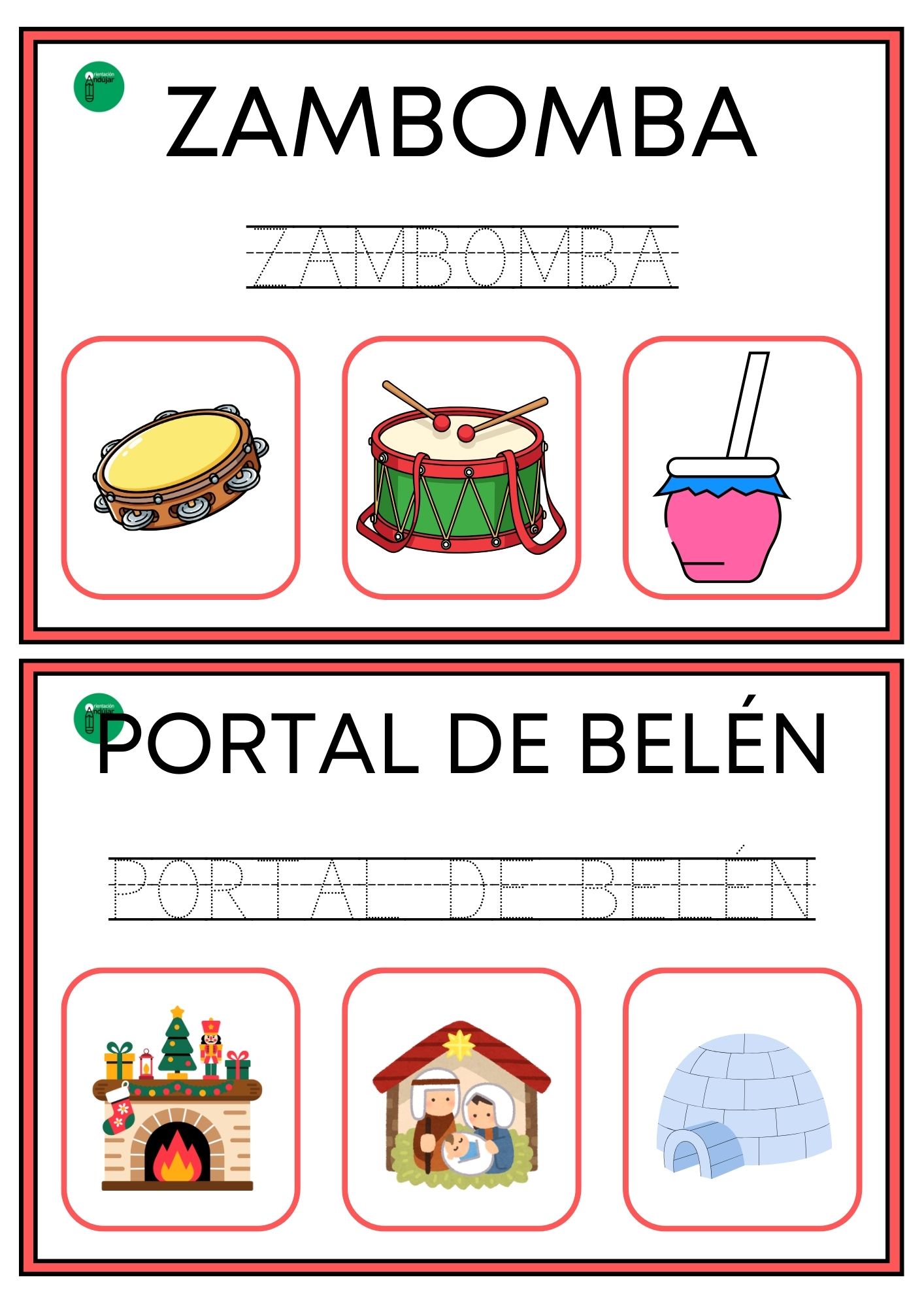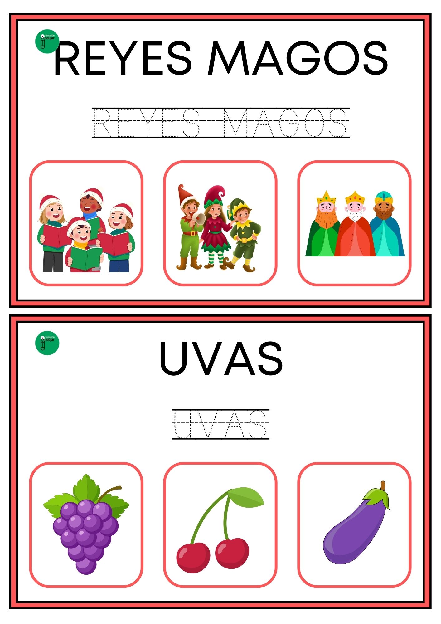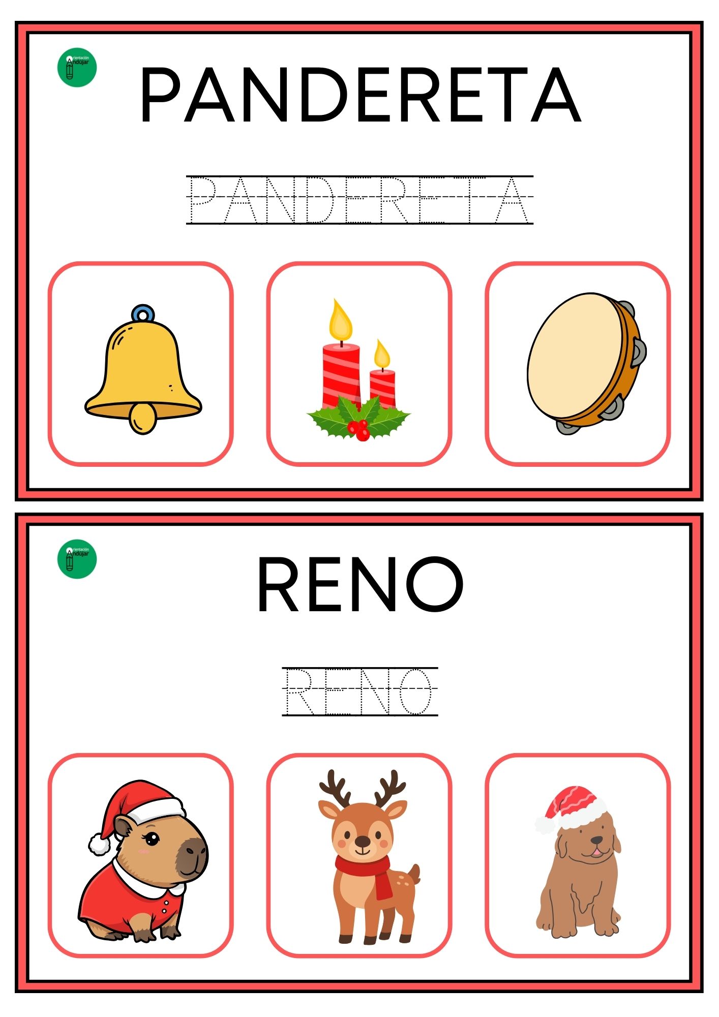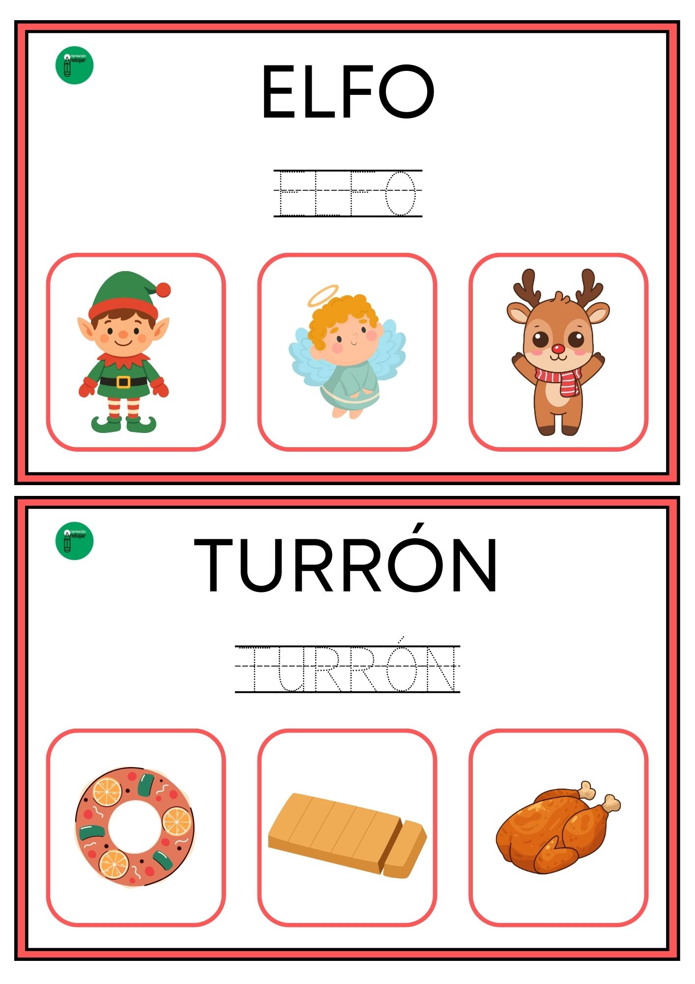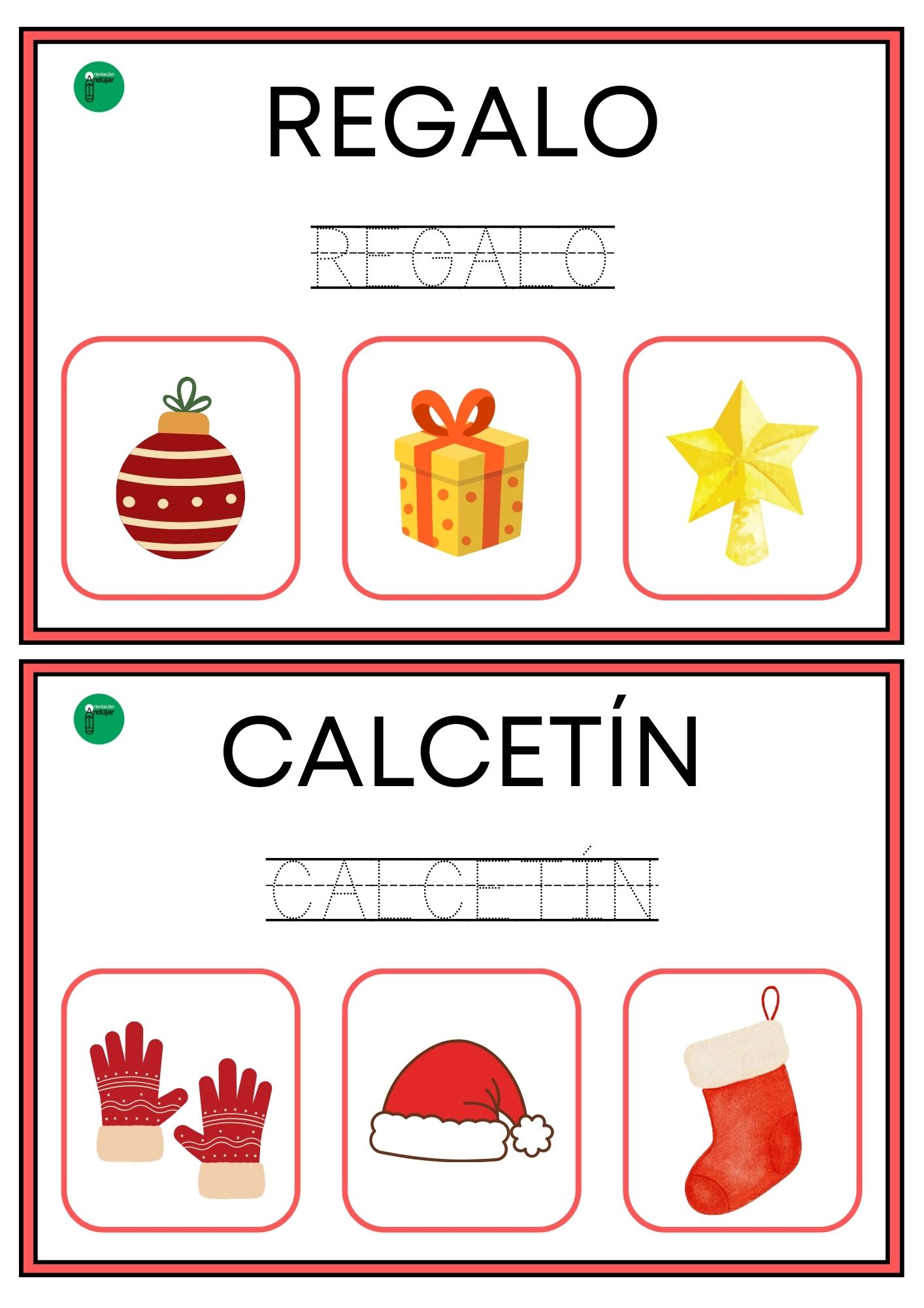 Este formato convierte cada tarjeta en una actividad completa que integra lectura, escritura y discriminación visual, tres habilidades esenciales en el proceso de lectoescritura. Además, al estar centradas en vocabulario navideño, resultan especialmente motivadoras para los alumnos y se adaptan muy bien a los últimos días de clase.