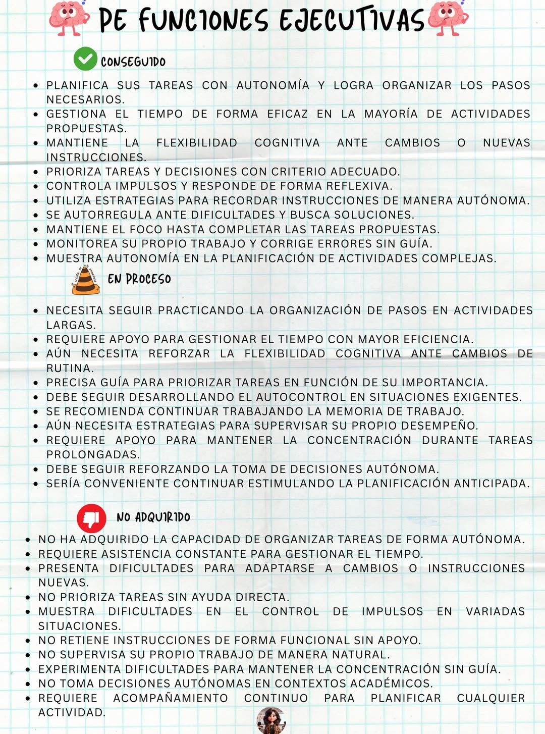 Funciones ejecutivas (p. ej., planificación, flexibilidad, memoria de trabajo).