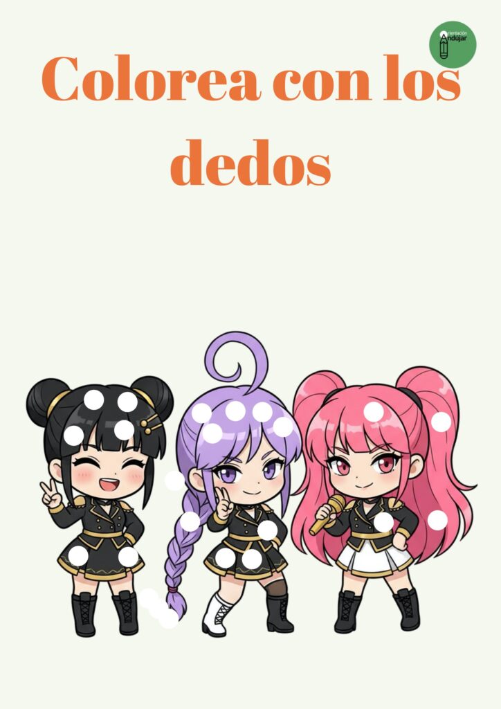 Este material est谩 pensado para Educaci贸n Infantil y primeros cursos de Primaria, combinando estimulaci贸n sensorial, motricidad fina y expresi贸n art铆stica a trav茅s de una propuesta muy atractiva: las Guerreras del K-POP. Colorear con los dedos se convierte aqu铆 en una experiencia l煤dica que conecta con los intereses del alumnado y favorece el aprendizaje activo.