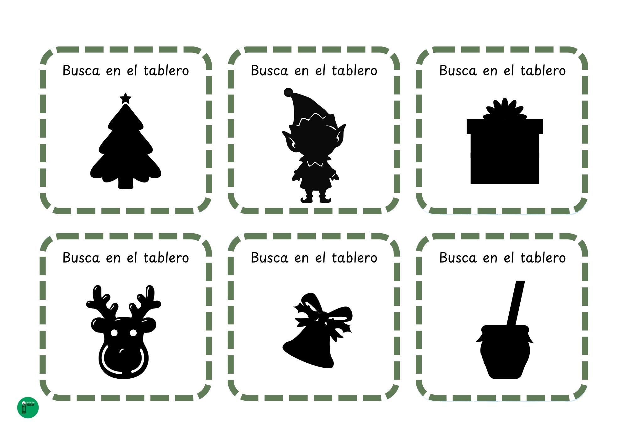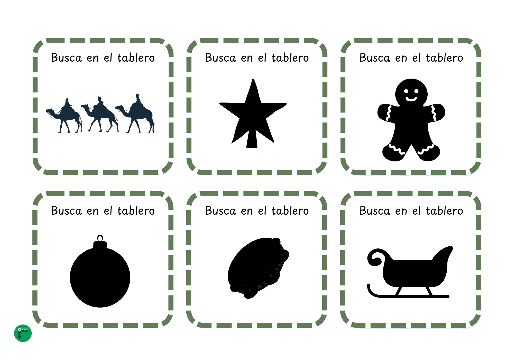 El material está formado por un tablero repleto de dibujos navideños —árboles de Navidad, estrellas, renos, regalos, gorros de Papá Noel…— y una colección de cartas con las siluetas de esos mismos elementos. El reto para los alumnos es sencillo pero muy estimulante: toman una carta, observan con atención la silueta y deben localizar lo más rápido posible la imagen correspondiente en el tablero.