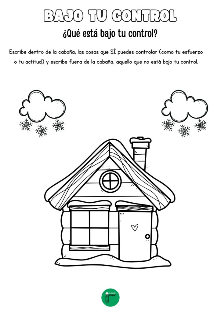 La ficha presenta una cabaña nevada en medio de una tormenta, que sirve como metáfora central. La idea es que los alumnos escriban dentro de la cabaña aquellas cosas que están bajo su control —como sus decisiones, actitudes y esfuerzos— y fuera de la cabaña aquellas cosas que no dependen directamente de ellos, como las acciones de otras personas o el clima.