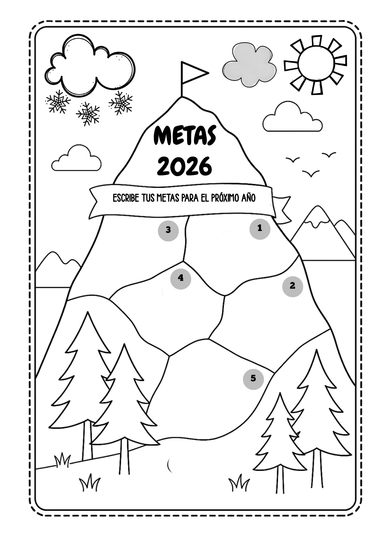 Entrega la ficha al alumnado y plantea un momento de calma y reflexión. Cada tramo de la montaña representa un objetivo que desean alcanzar en 2026. Pueden escribir metas académicas, personales, emocionales o sociales. Después, pueden colorear la ficha y, si se desea, compartir alguna meta de forma voluntaria o guardarla como compromiso personal para el nuevo año.