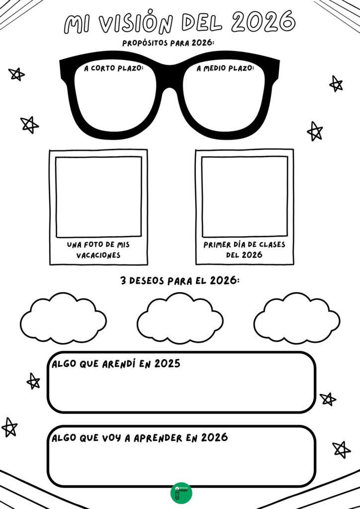 A través de esta actividad, los alumnos podrán pensar qué esperan del 2026, qué ilusiones les genera, qué retos les gustaría afrontar y qué metas desean alcanzar. La ficha les guía para que reflexionen también sobre el año anterior, identificando qué han aprendido de sus experiencias pasadas, tanto a nivel académico como personal, y cómo esos aprendizajes pueden ayudarles en el nuevo año.