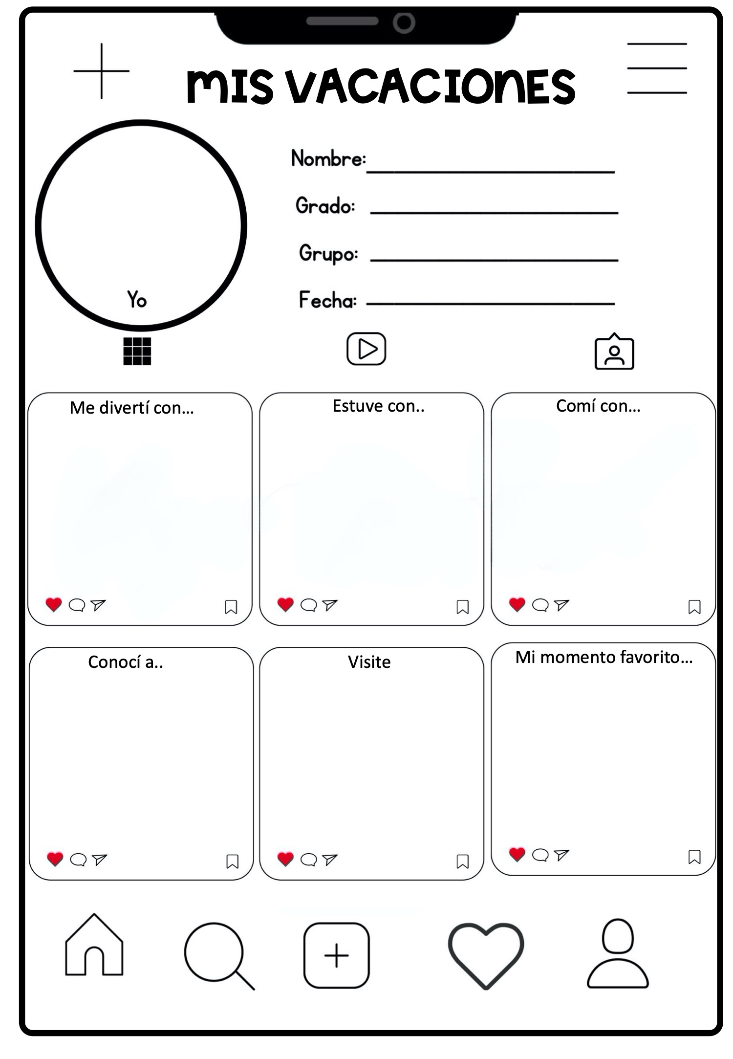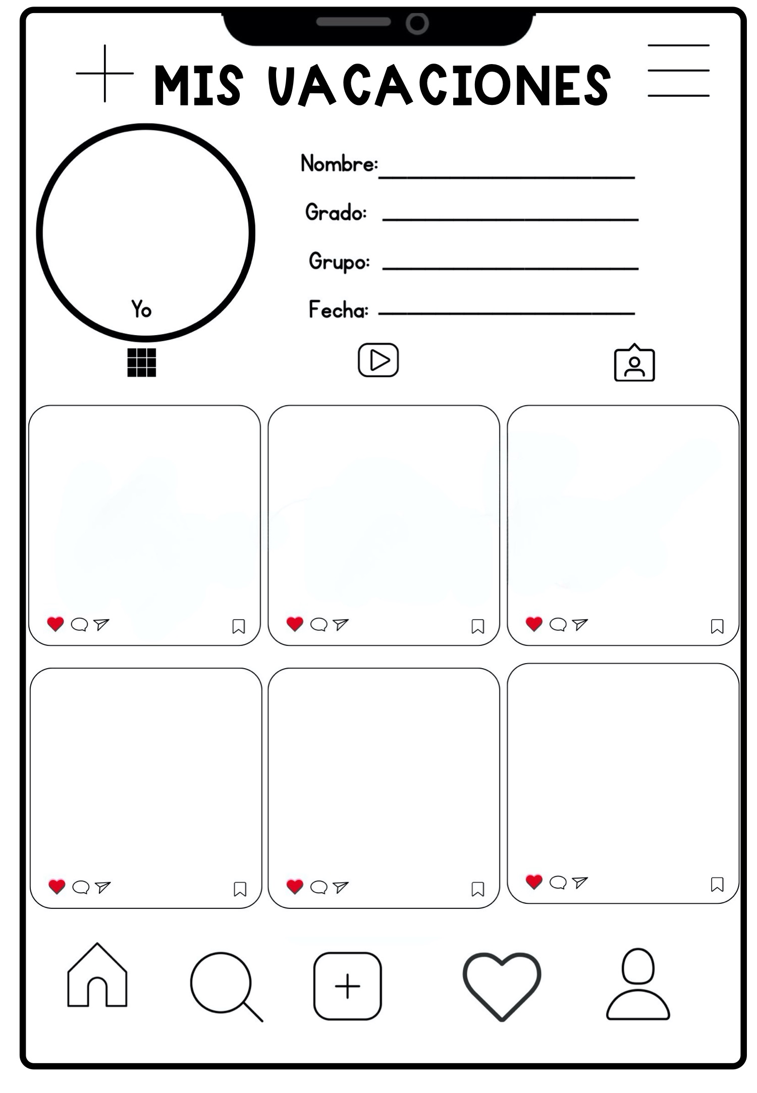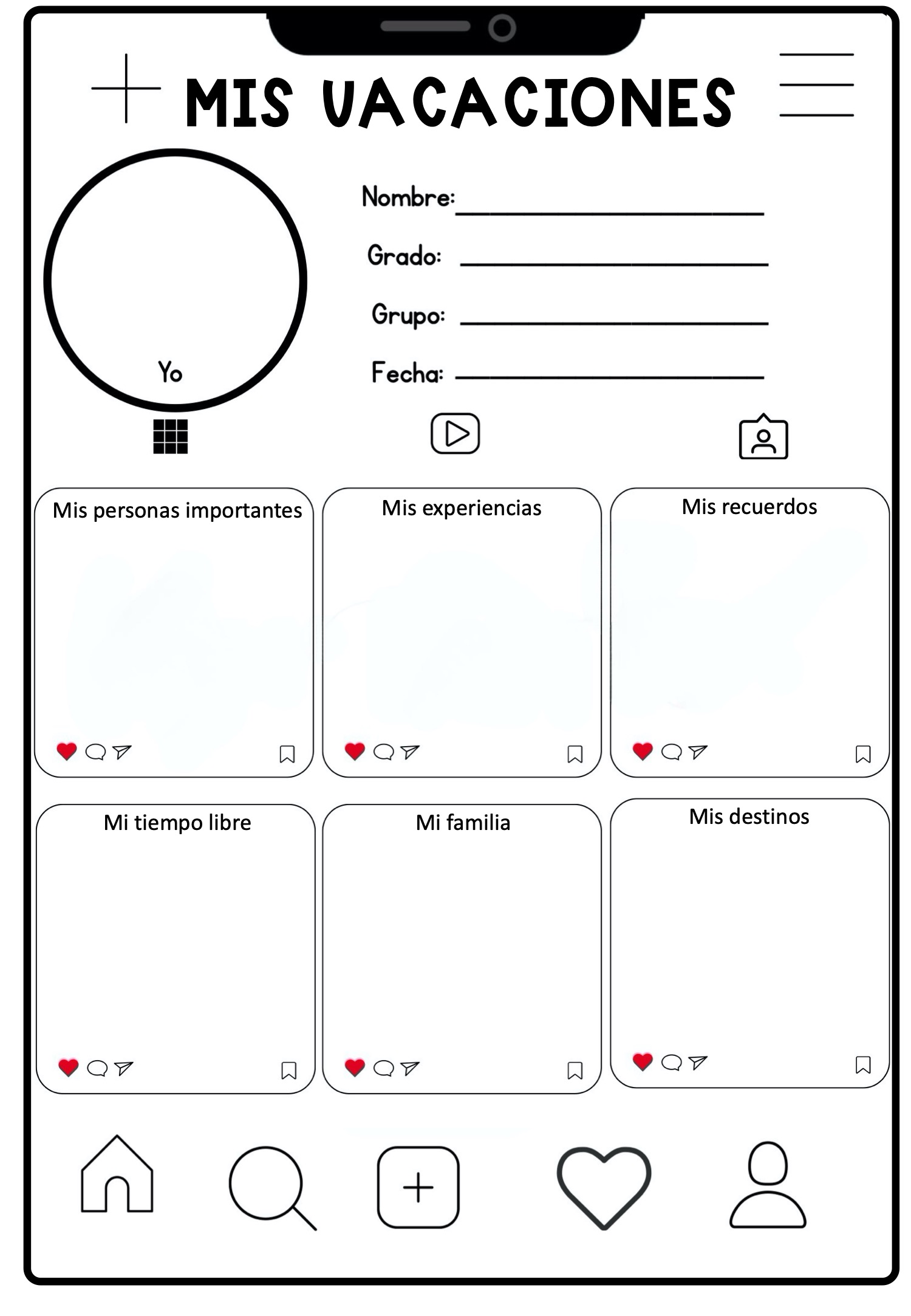 Perfil Personalizado: Todas las fichas comienzan con la sección de identificación donde el alumno coloca su nombre, grado, grupo y fecha, junto a su foto de perfil («Yo»).