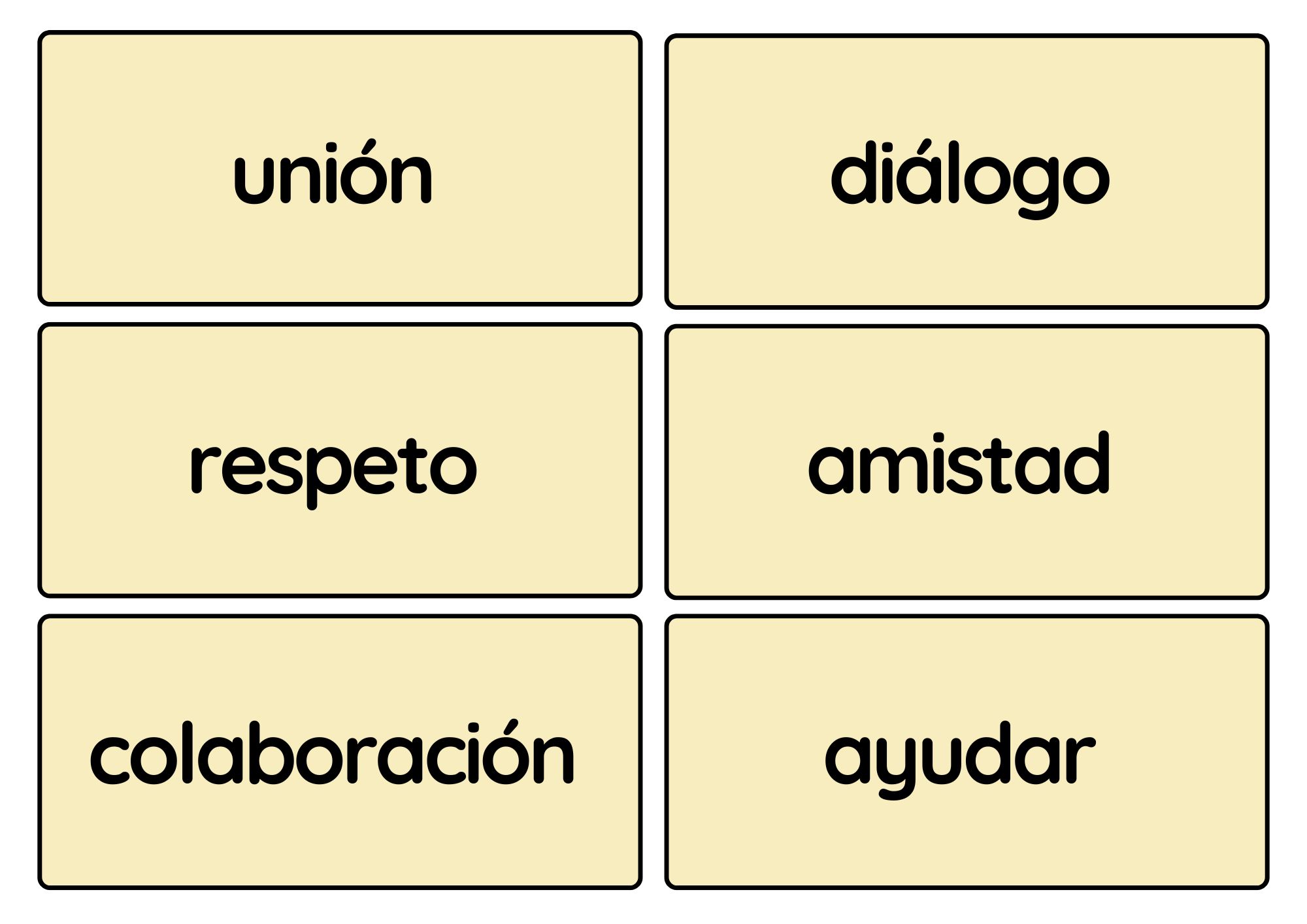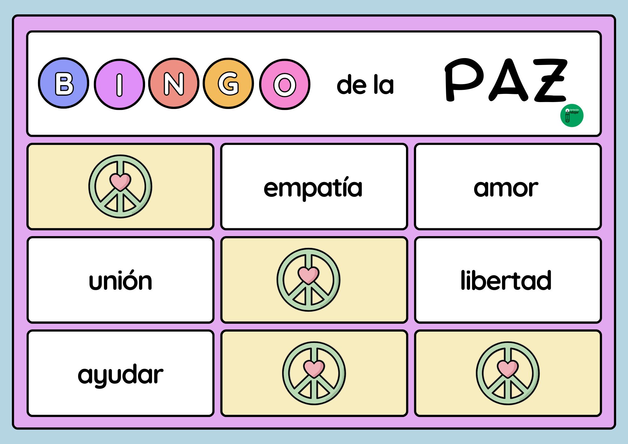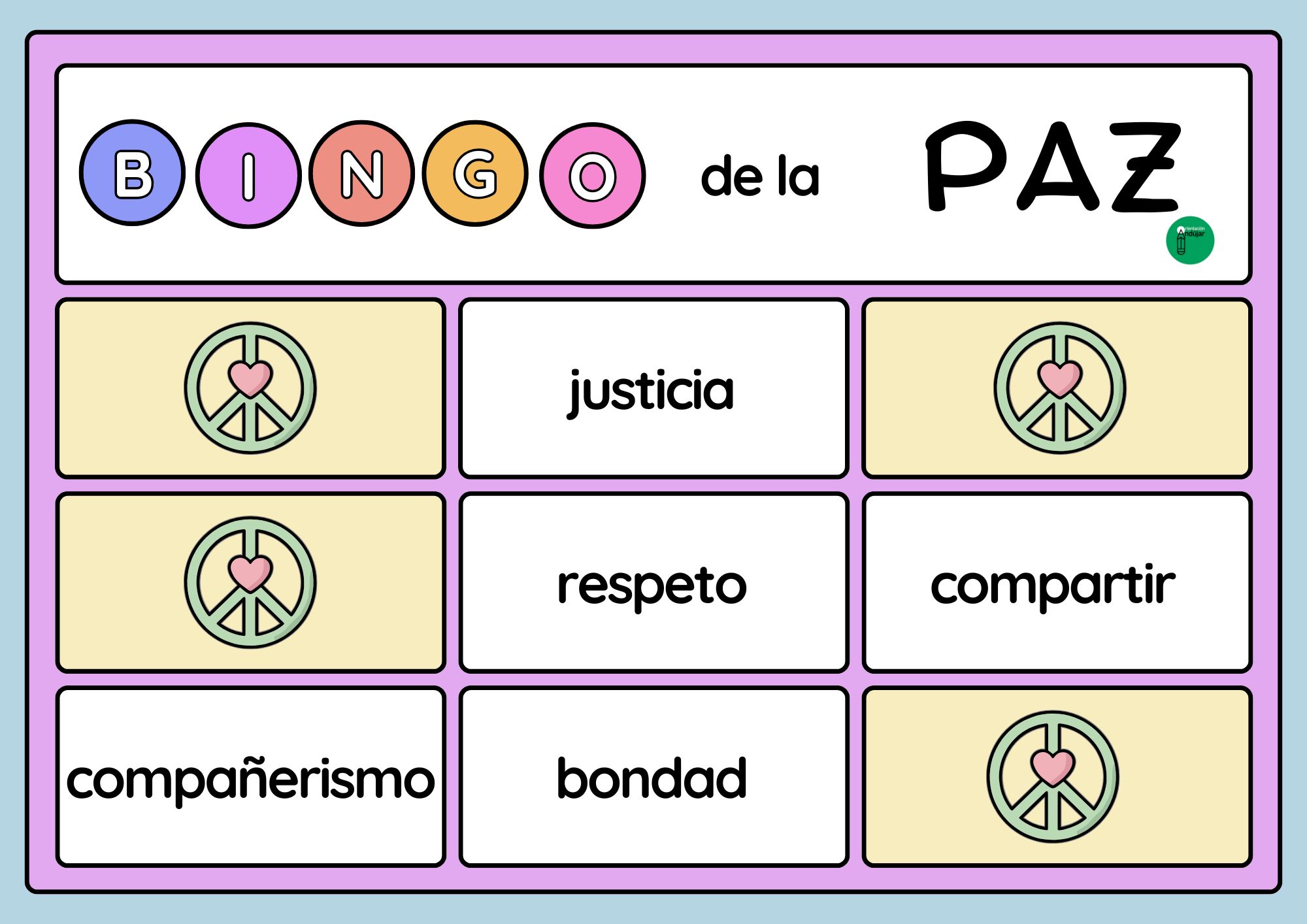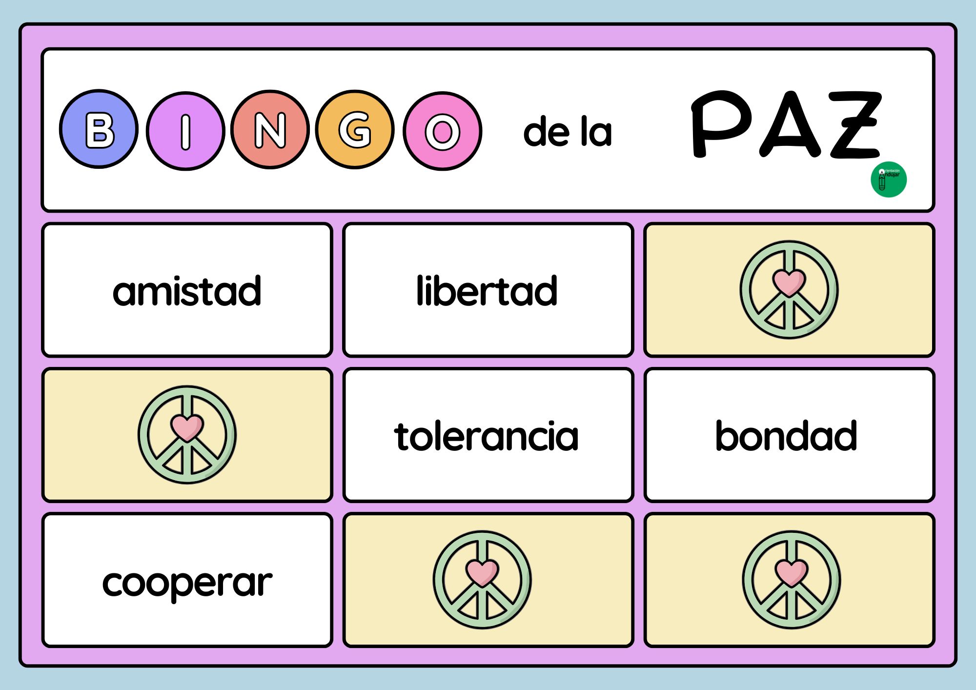 La actividad consiste en que cada alumno reciba una cartilla con palabras relacionadas con la paz, como “amistad”, “respeto”, “solidaridad”, “empatía”, “cooperación”, “diálogo”, entre otras. El docente irá anunciando estas palabras de manera aleatoria, y los alumnos deberán marcarlas en su cartilla. El primero que complete una fila, columna o diagonal grita “¡Bingo!” y puede explicar brevemente el significado de alguna de las palabras que marcó. Esto convierte el juego en una herramienta de aprendizaje activo, donde los niños no solo reconocen el vocabulario, sino que también reflexionan sobre su significado y aplicación en la vida diaria.