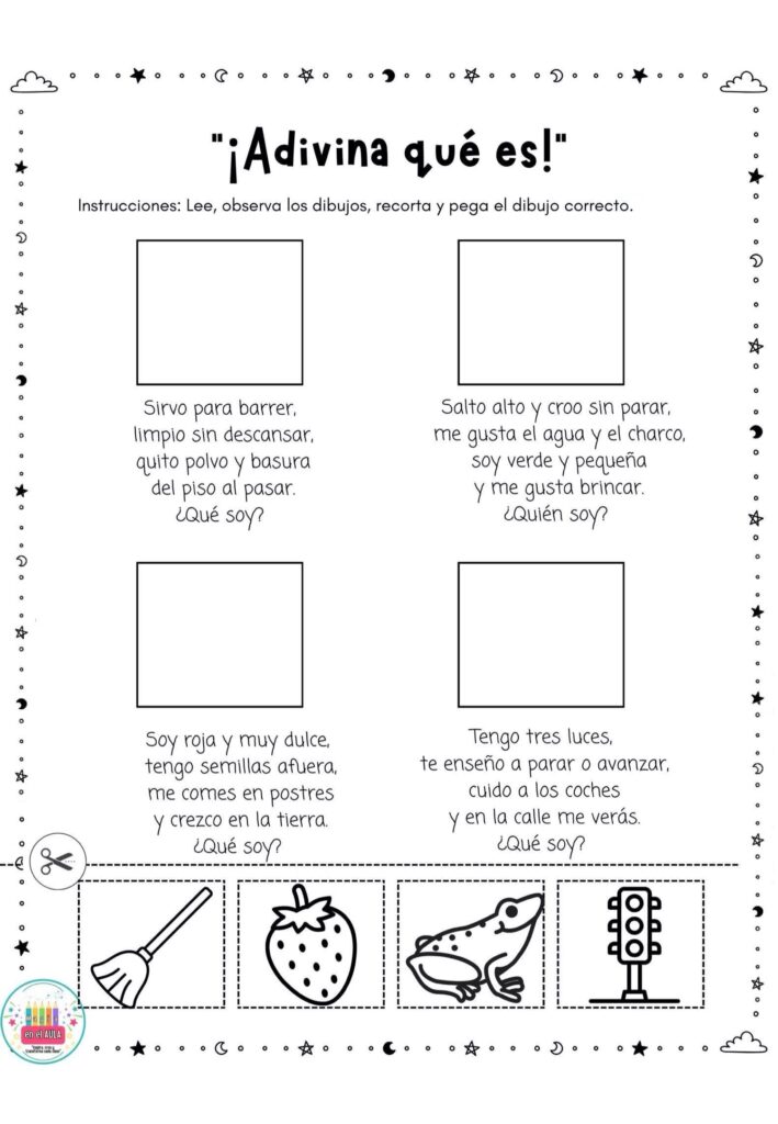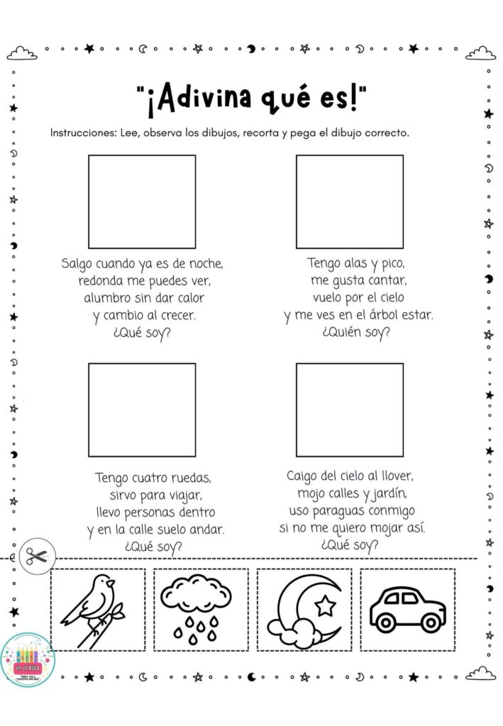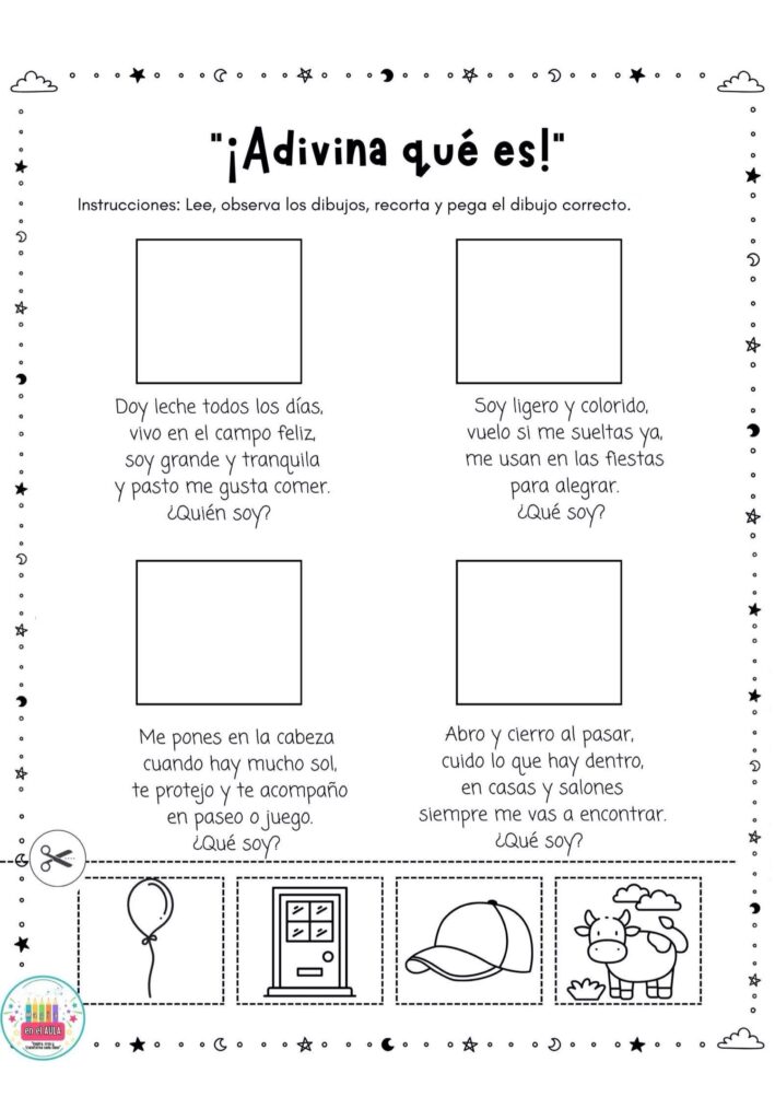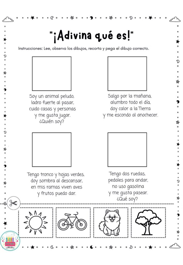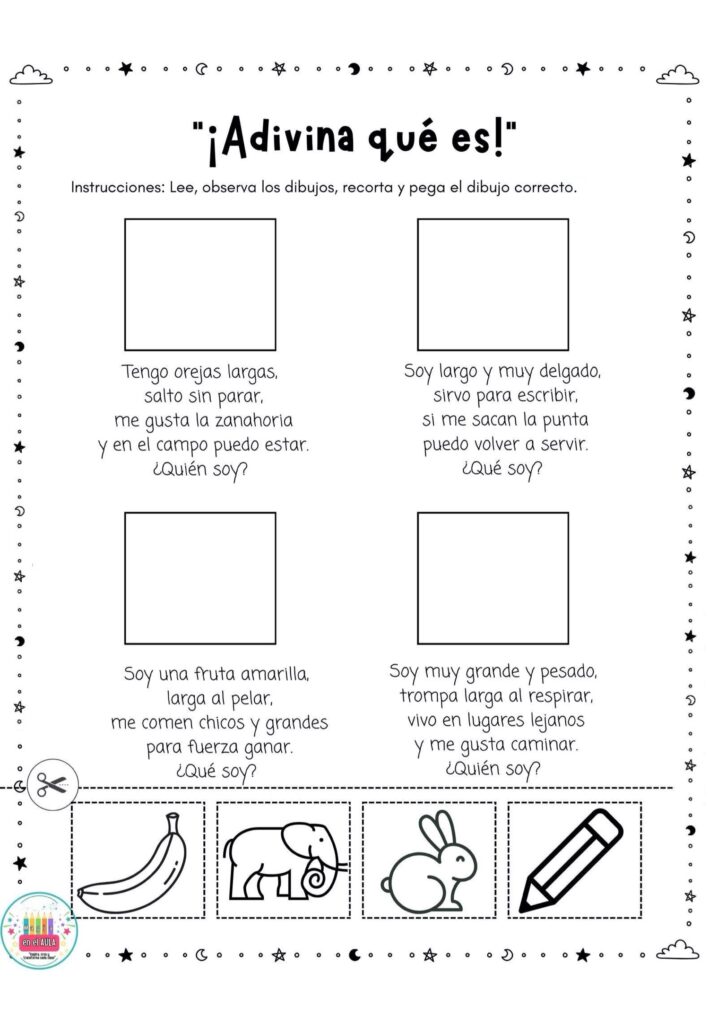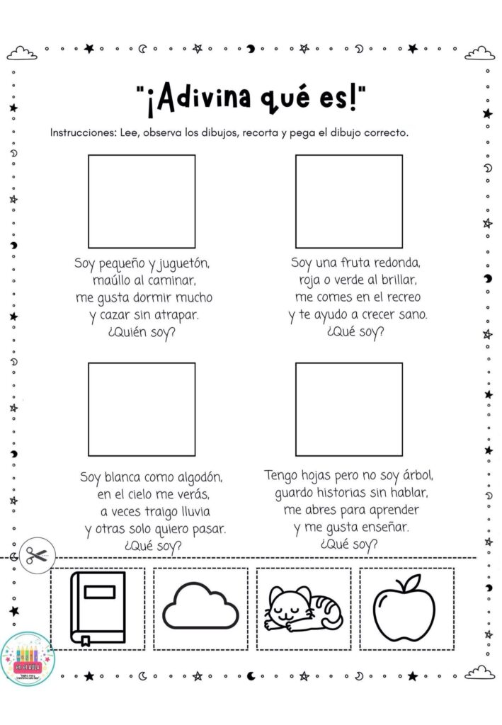 Estas fichas se pueden usar como estaciones de aprendizaje, trabajo individual o rincones de lectura. El alumnado lee la adivinanza, analiza las pistas y elige la imagen correcta para recortar y pegar, favoreciendo la comprensi贸n, la reflexi贸n y el autocontrol del error.