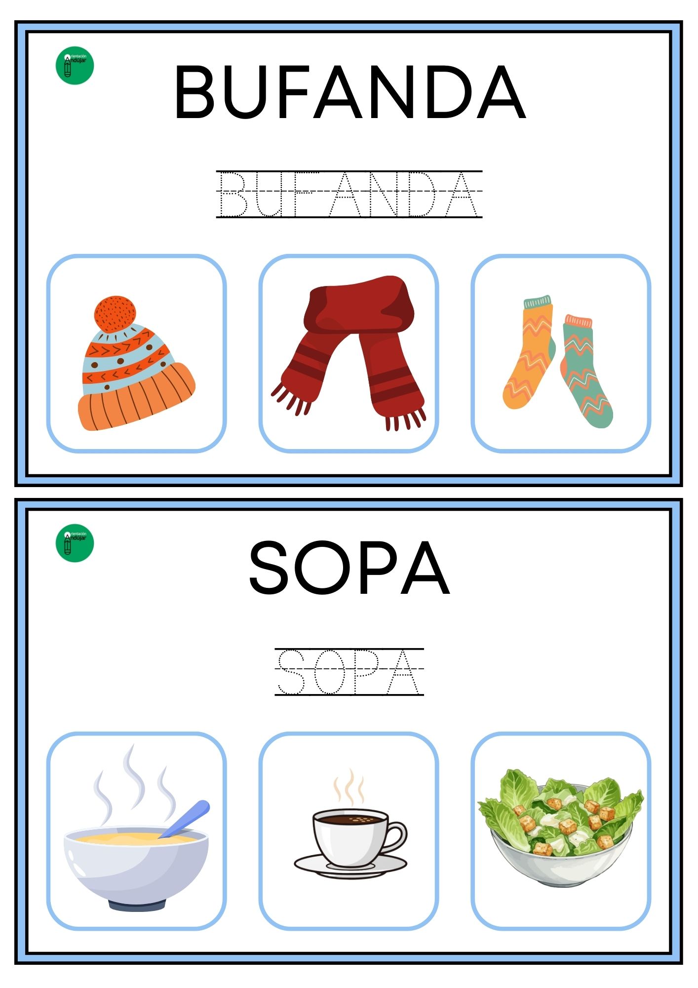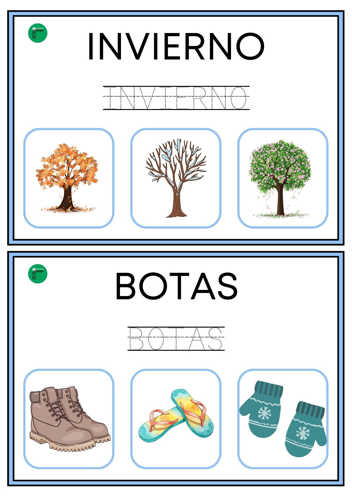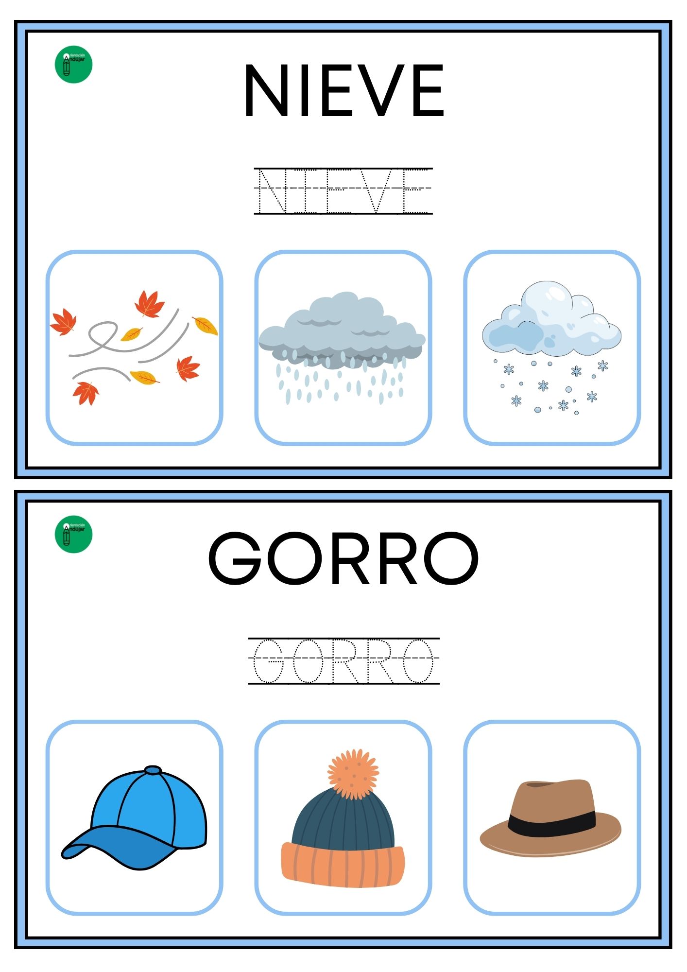 El invierno está lleno de colores, paisajes y elementos que podemos observar en la naturaleza. Para ayudar a los más pequeños a aprender y escribir palabras relacionadas con esta estación, hemos preparado una tarjeta educativa muy divertida que combina lectura, escritura y reconocimiento de imágenes.