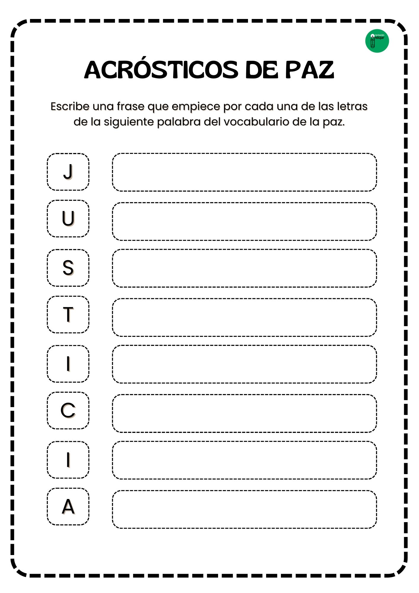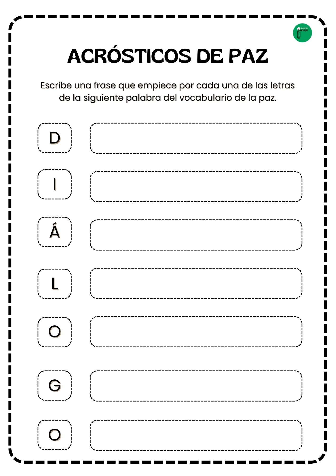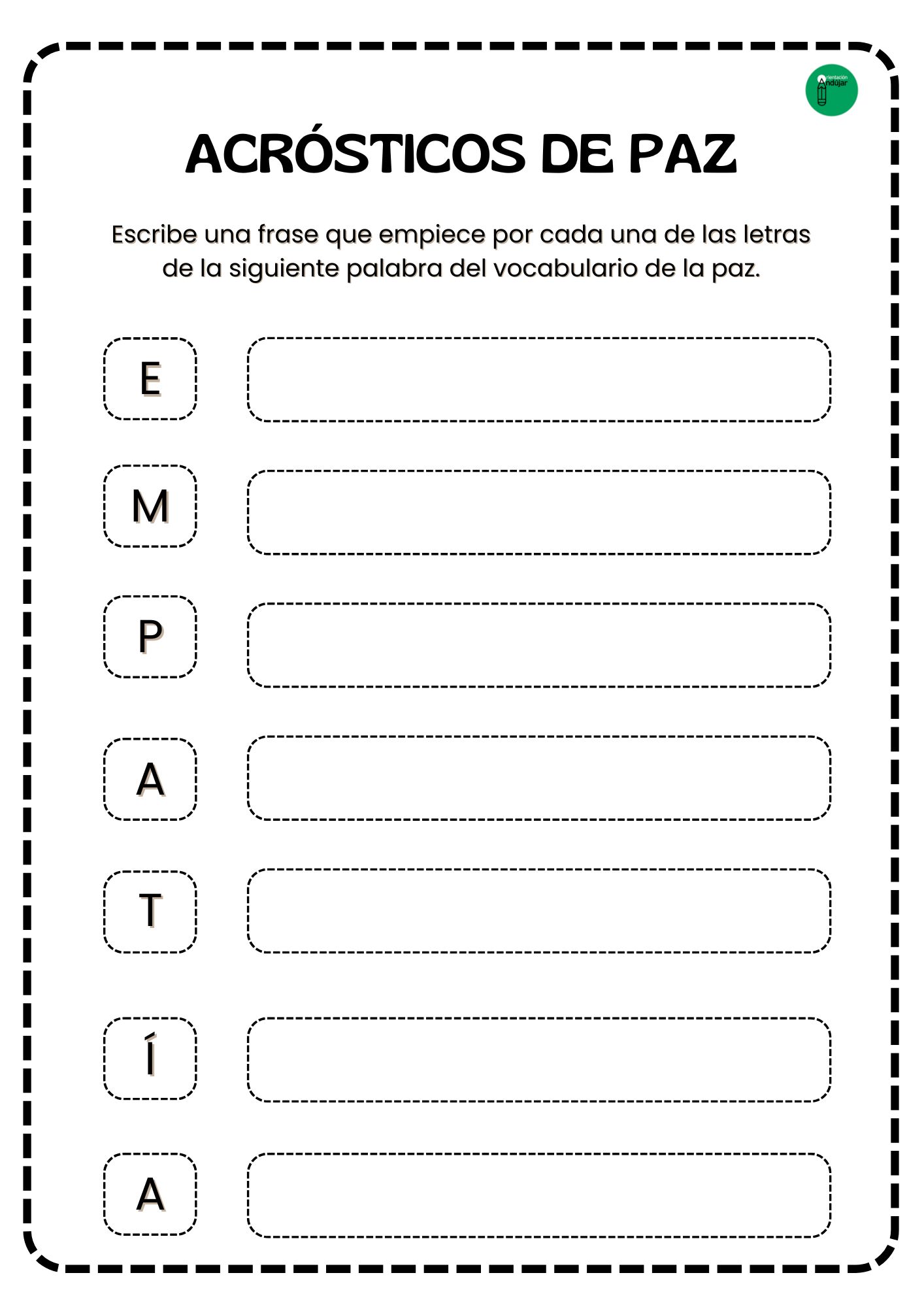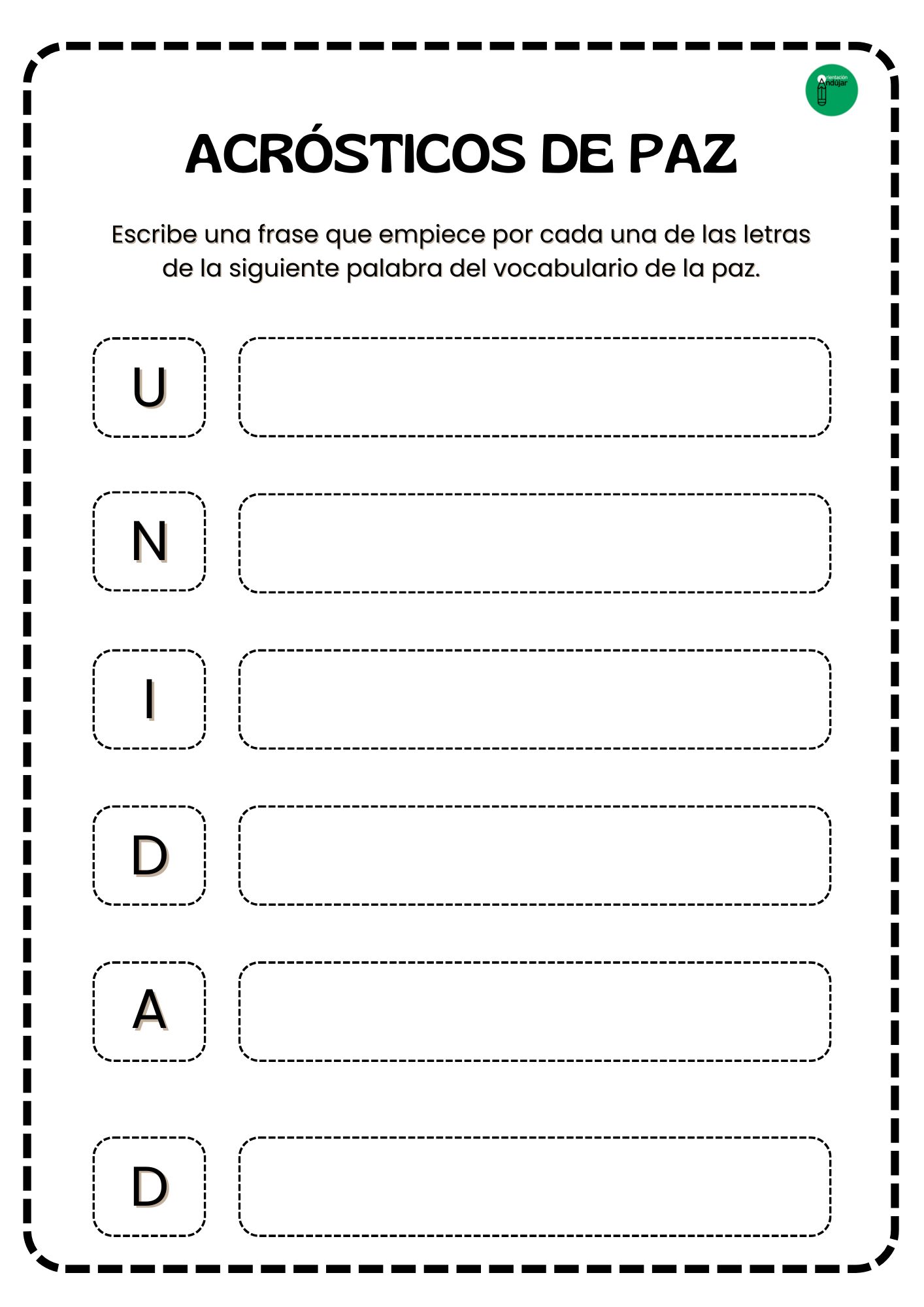Para esta actividad, primero seleccionaremos palabras relacionadas con la paz, como: armonía, respeto, solidaridad, tolerancia, calma, empatía. Luego, el objetivo será que cada alumno escriba una frase o palabra que empiece con cada letra de estas palabras.