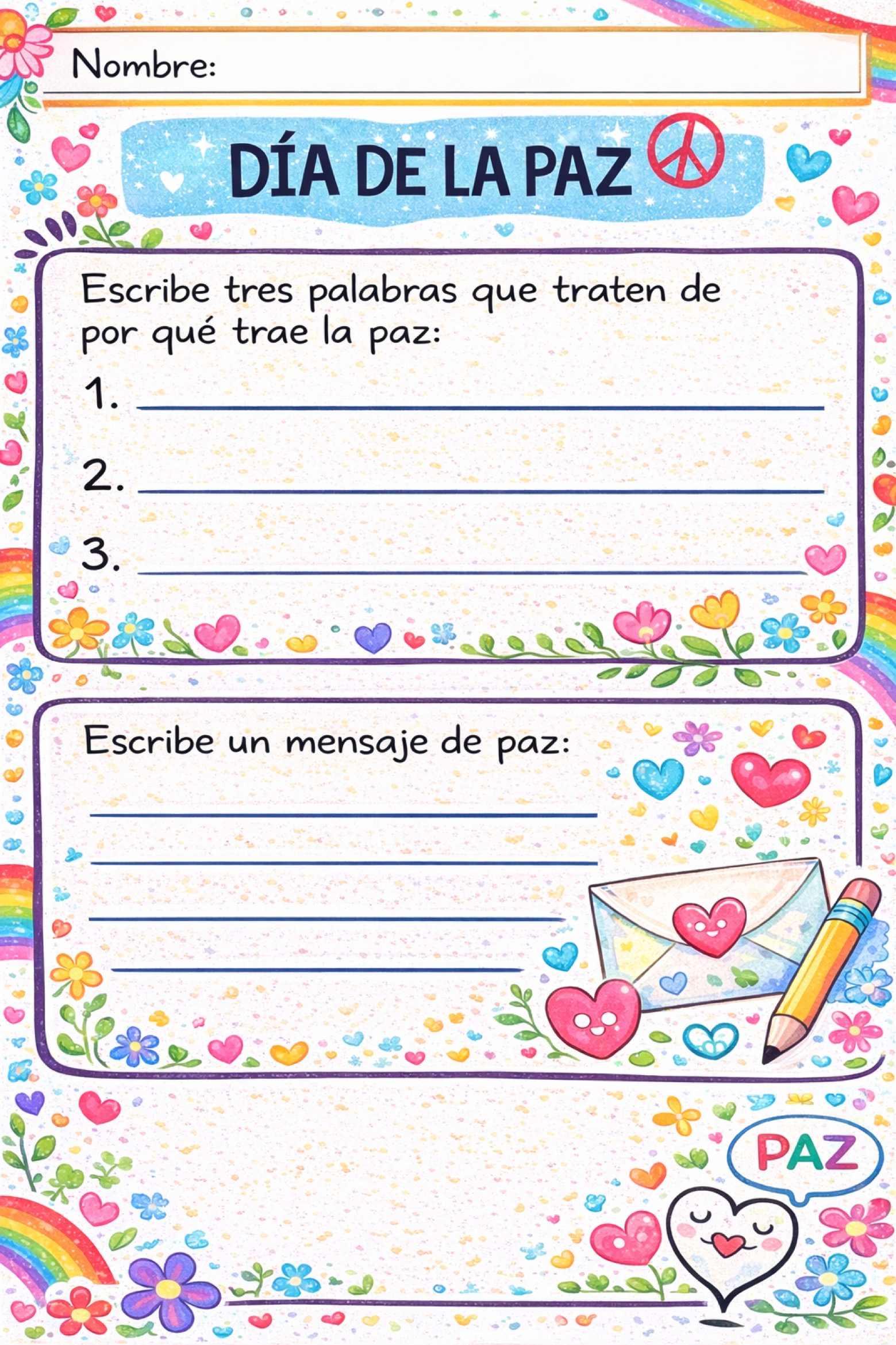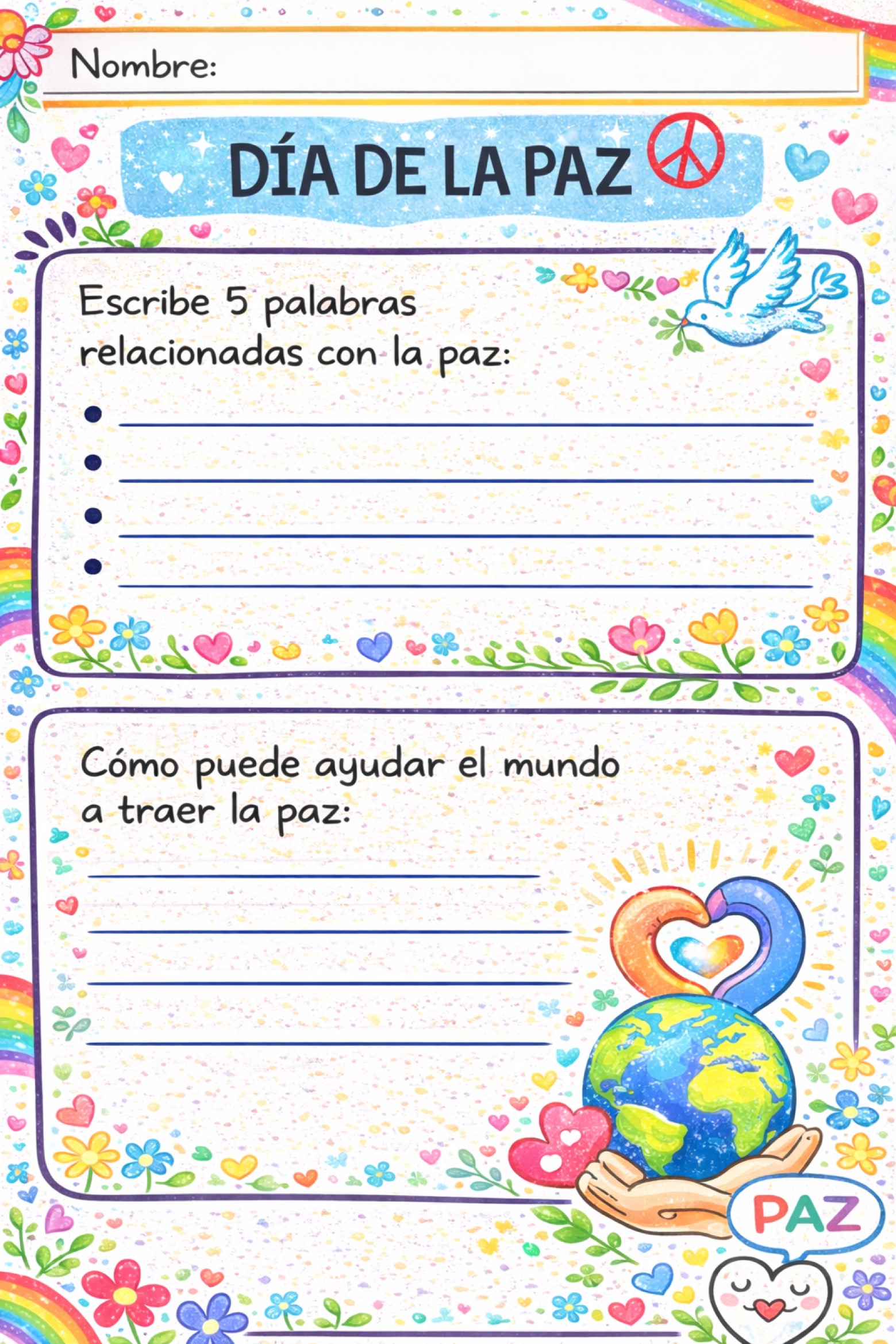 Este material ha sido diseñado para trabajar el Día Escolar de la Paz y la No Violencia con alumnado de segundo y tercer ciclo de Primaria, fomentando la reflexión, la expresión escrita y el desarrollo de valores fundamentales como el respeto, la empatía y la convivencia positiva.