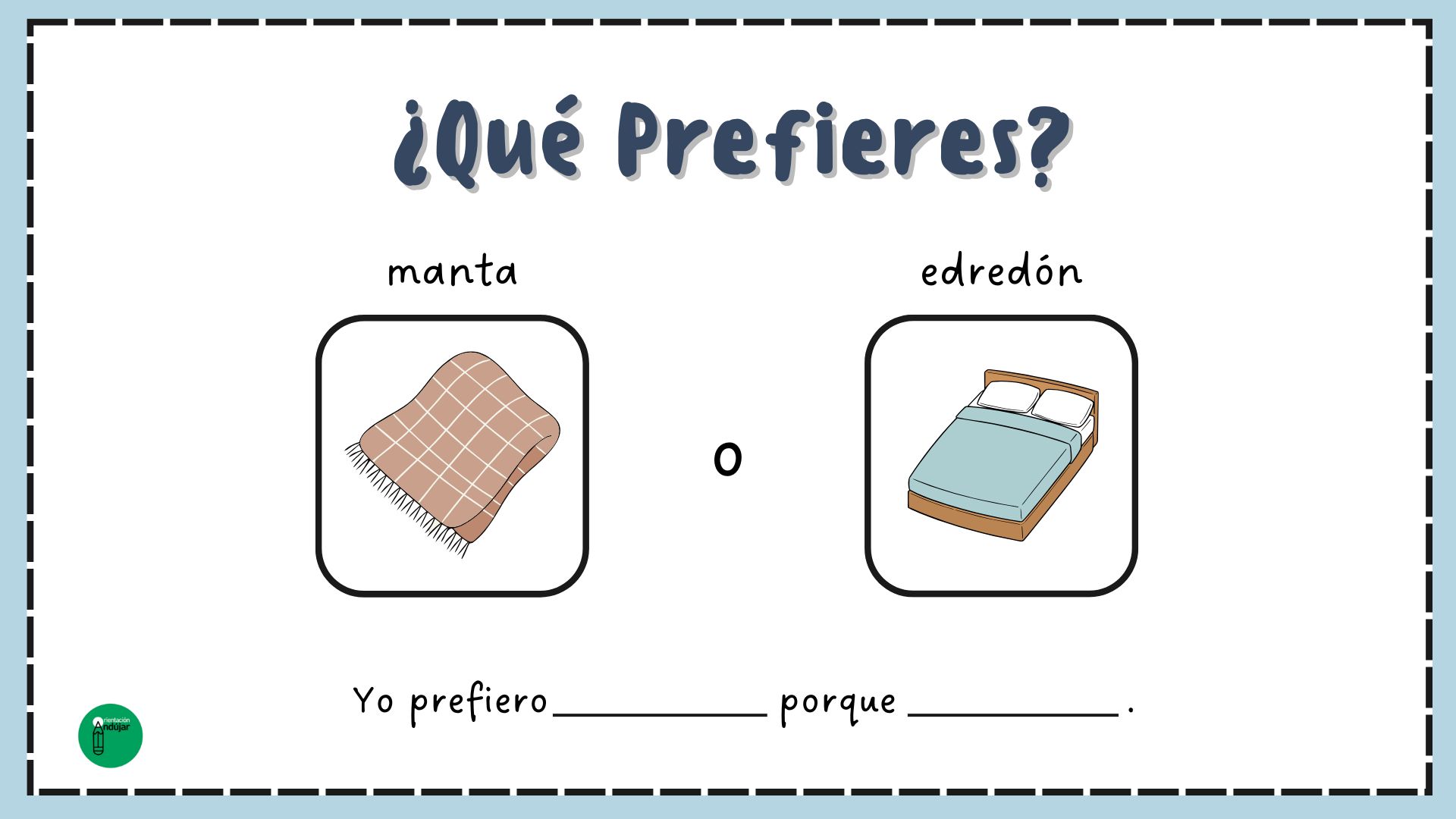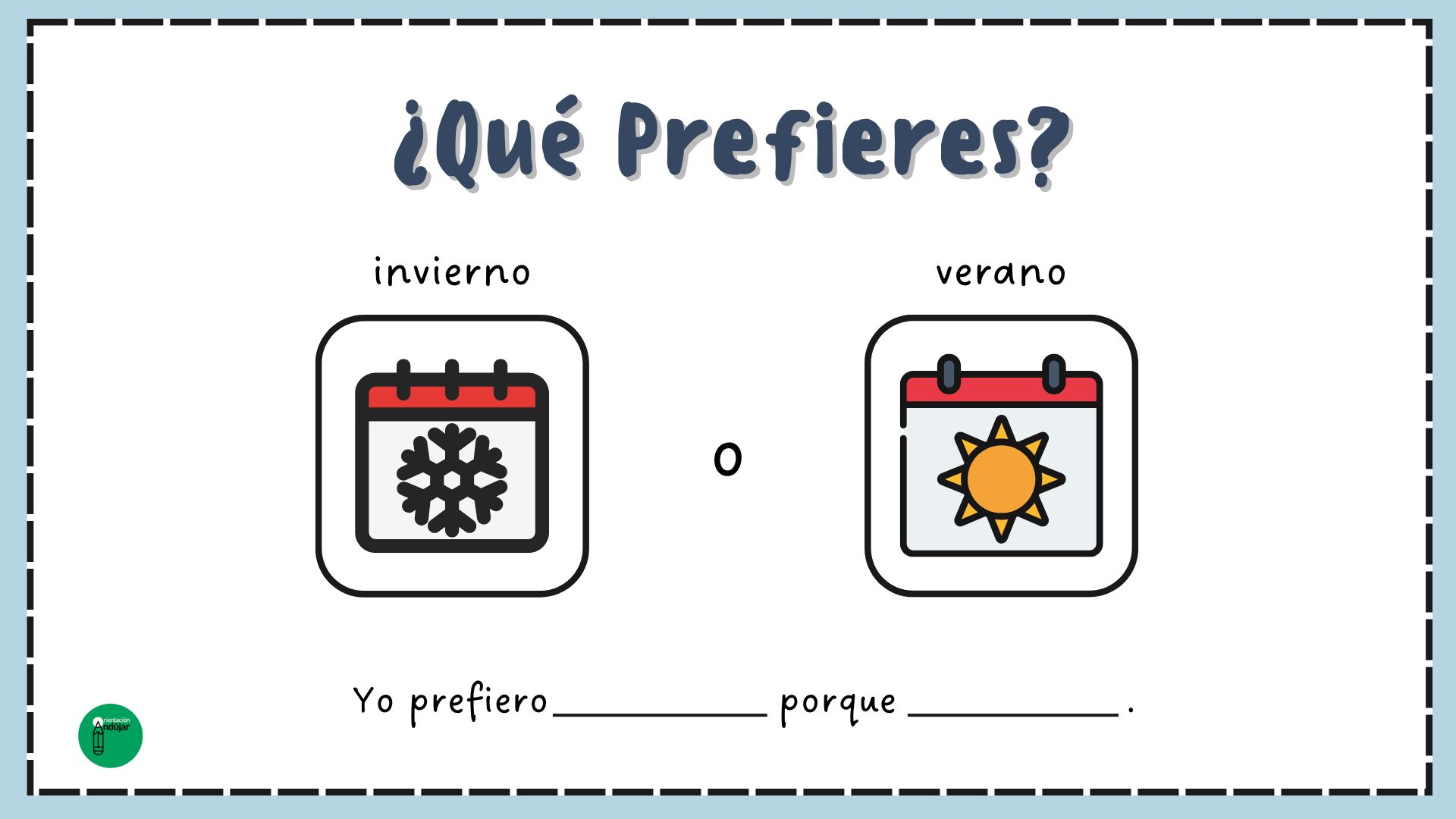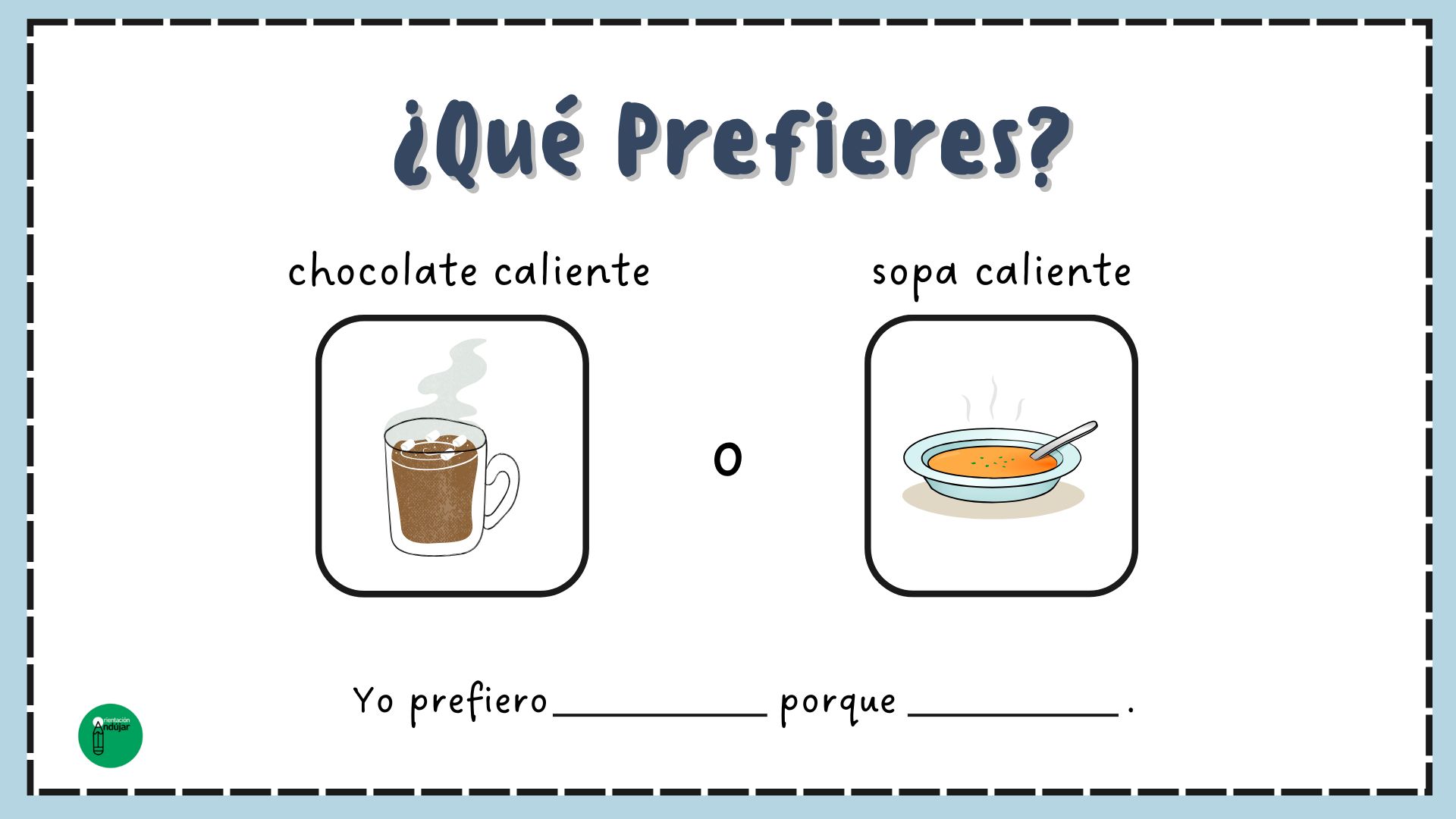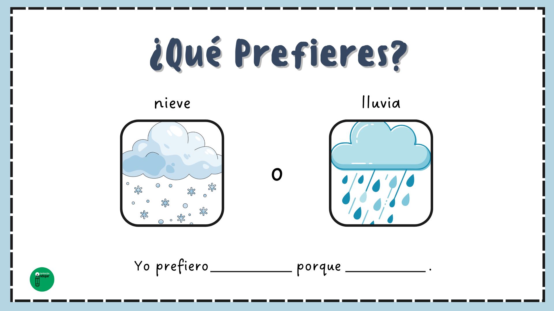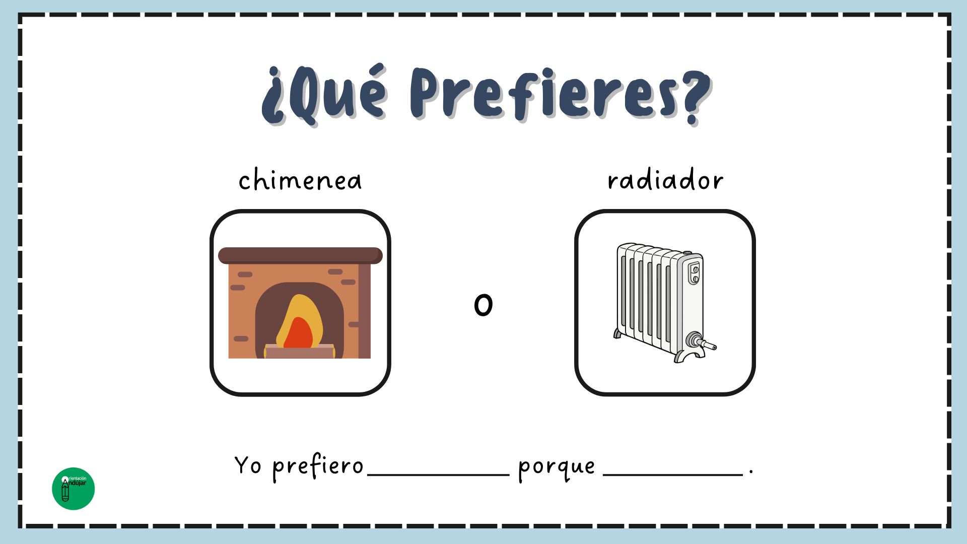 La propuesta consiste en presentar dos opciones relacionadas con el invierno y pedir al alumno que elija cuál prefiere. A partir de esa elección, se anima al niño o niña a expresar su respuesta de forma oral, comenzando por estructuras muy simples como “Prefiero…” y avanzando poco a poco hacia frases más completas como “Prefiero… porque…”. Esta dinámica permite adaptar fácilmente el nivel de exigencia lingüística a cada alumno.