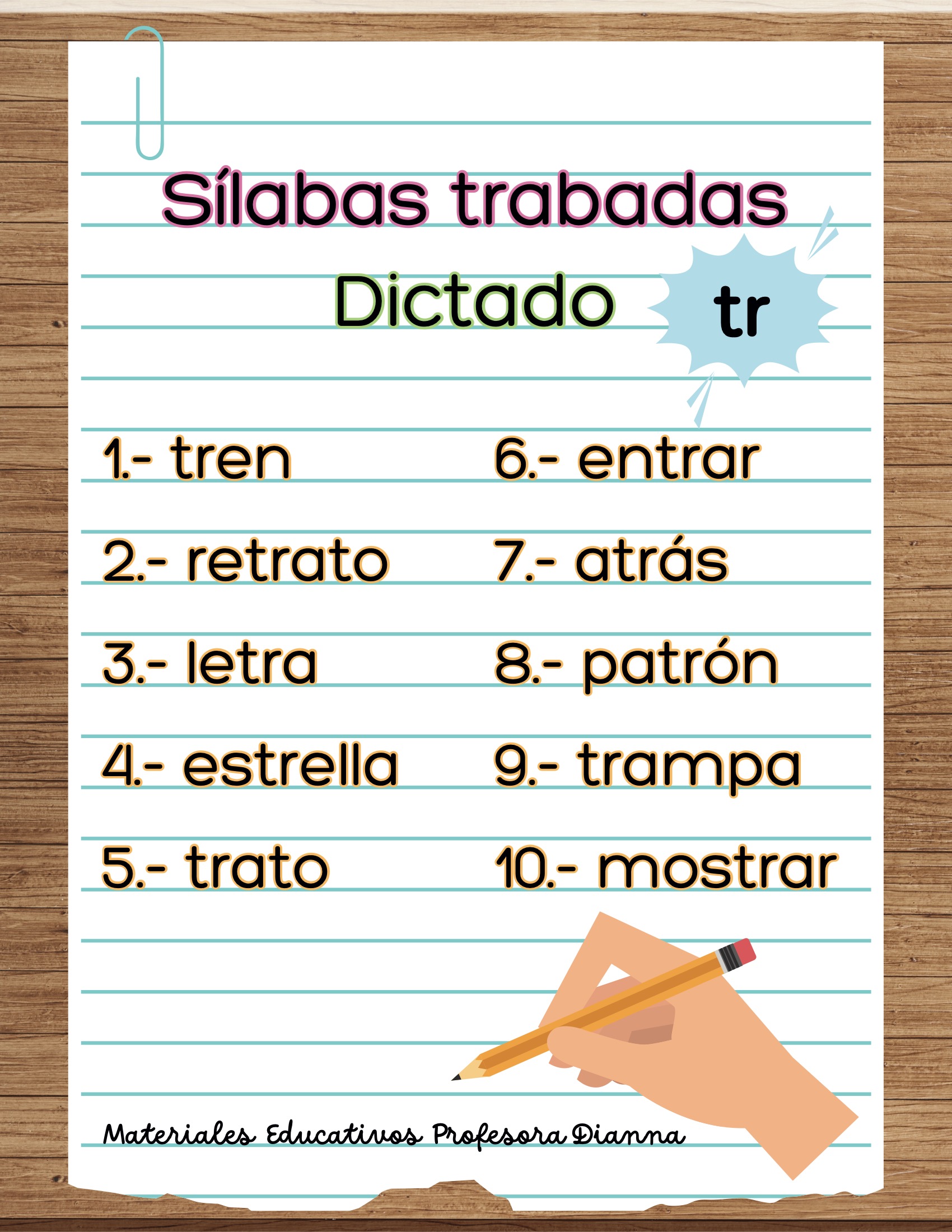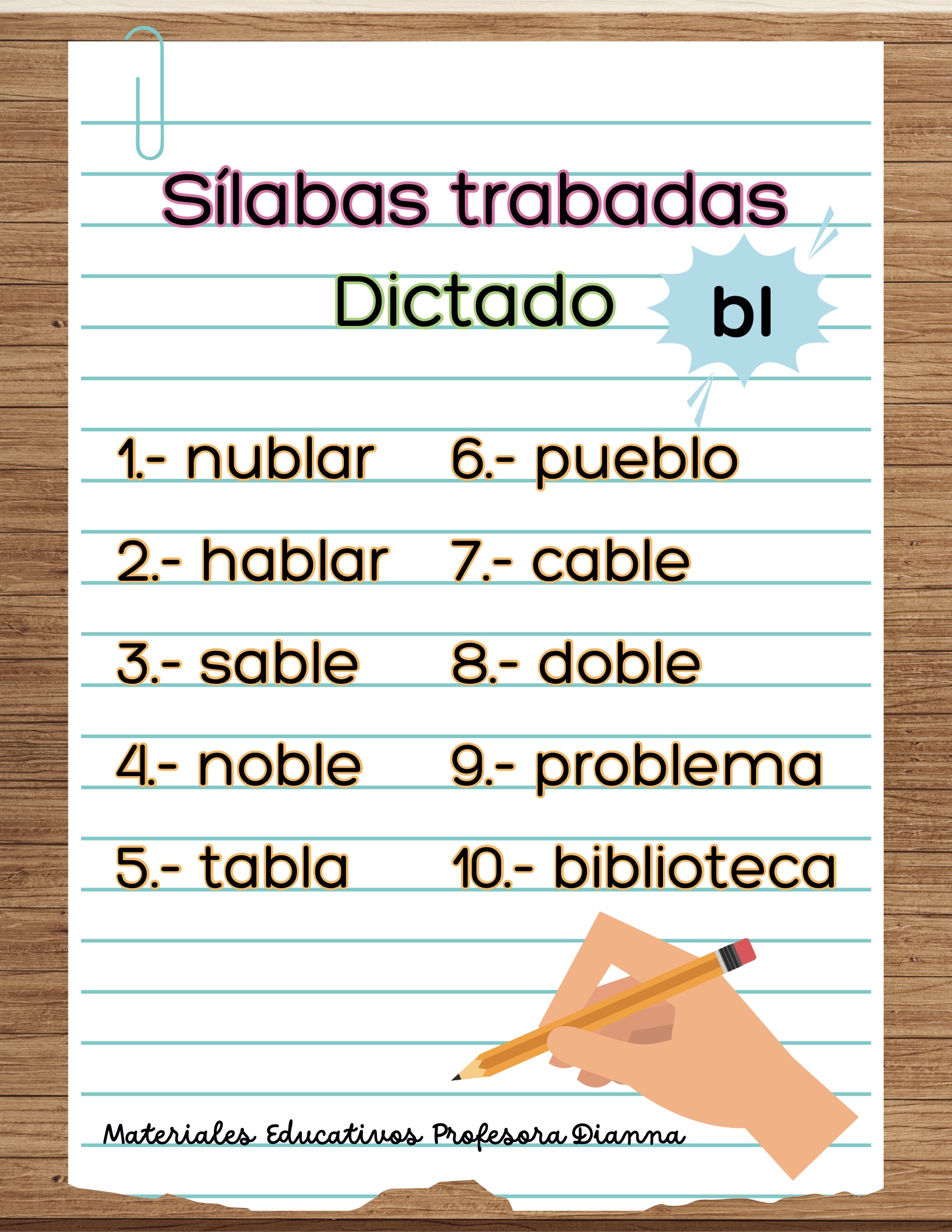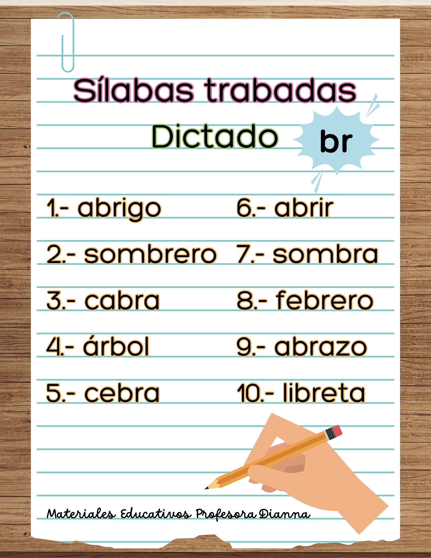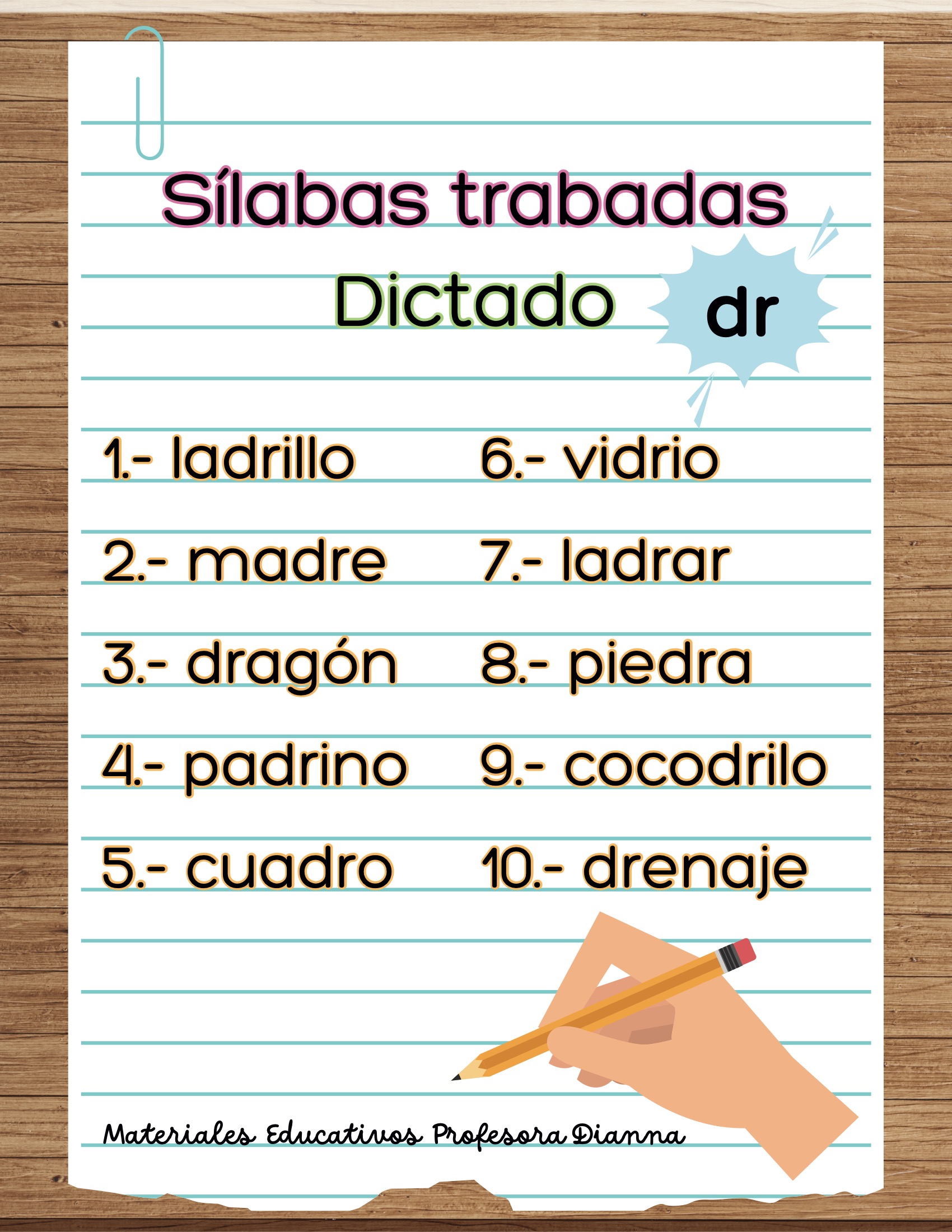 Dictados de palabras con s铆labas trabadas (bl, br, cl, cr, dr, fl, fr, gl, gr, pl, pr, tr).