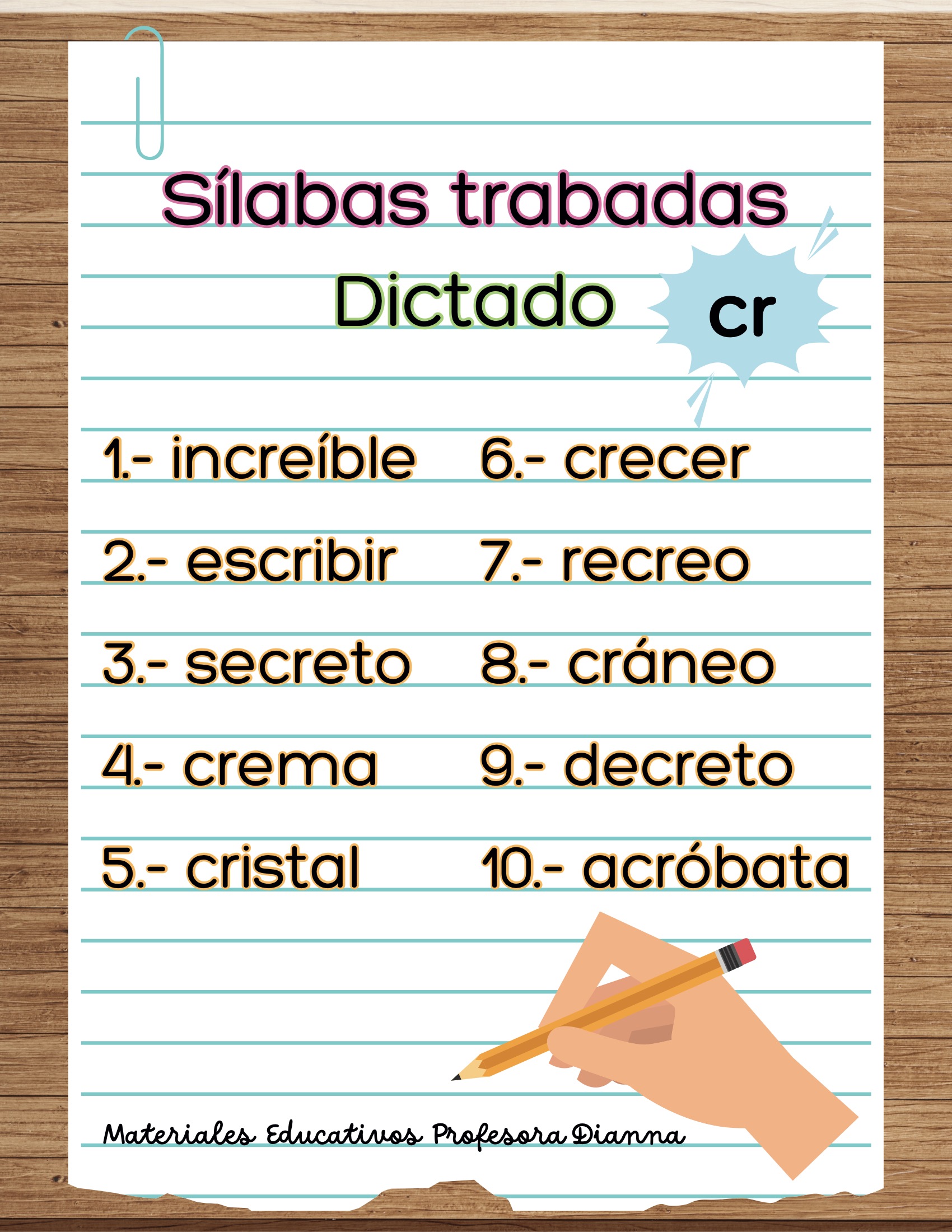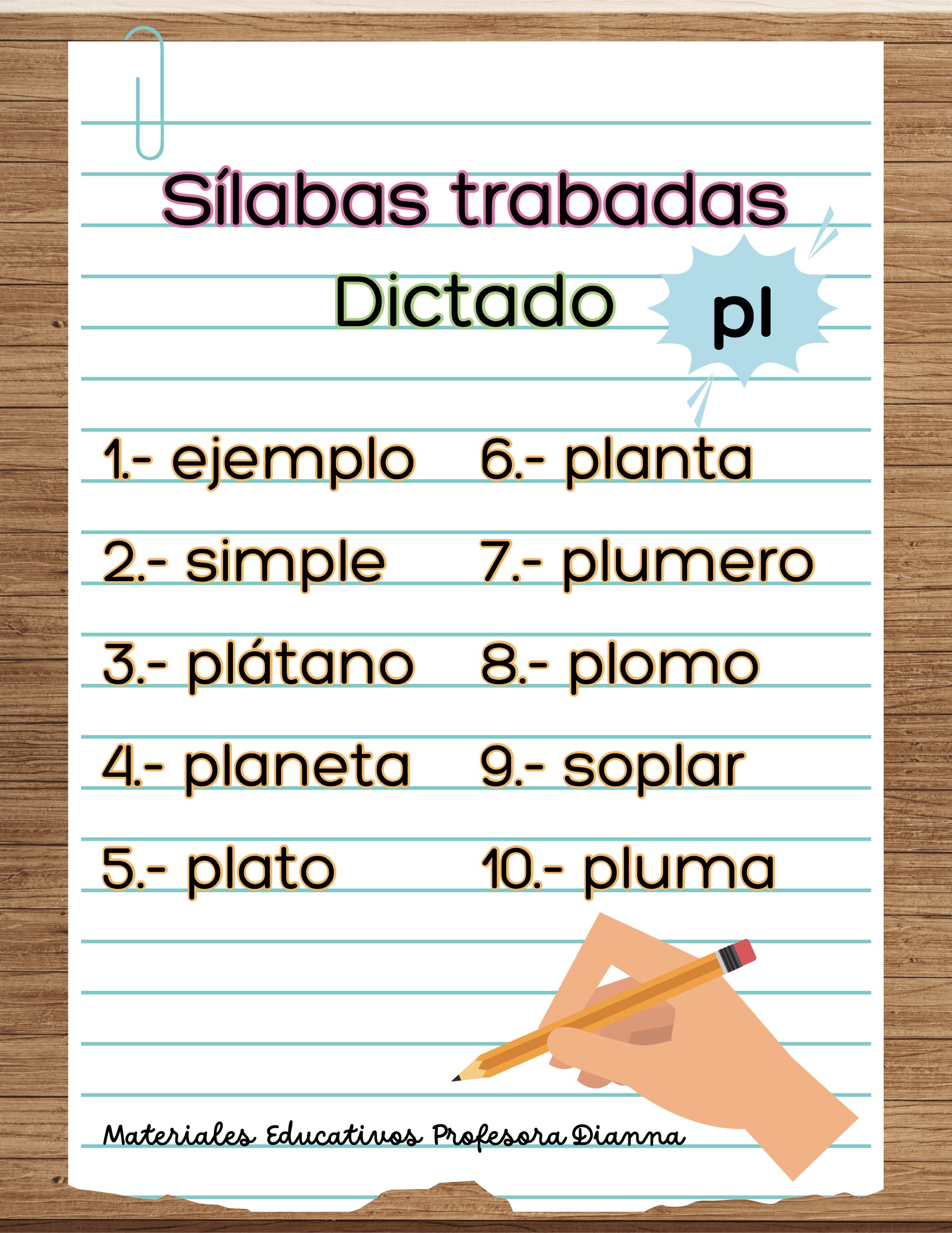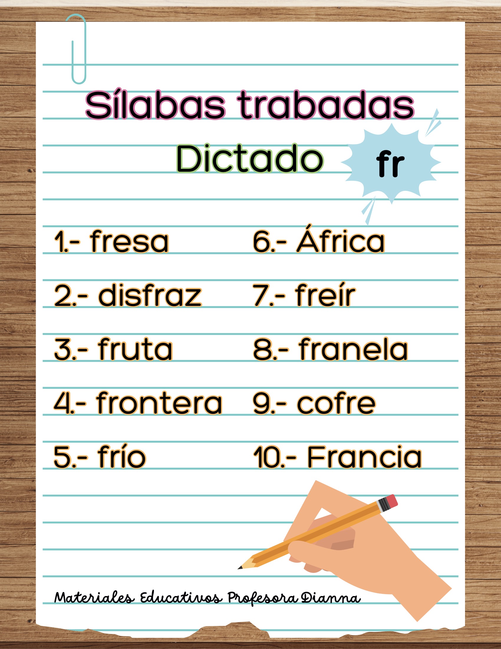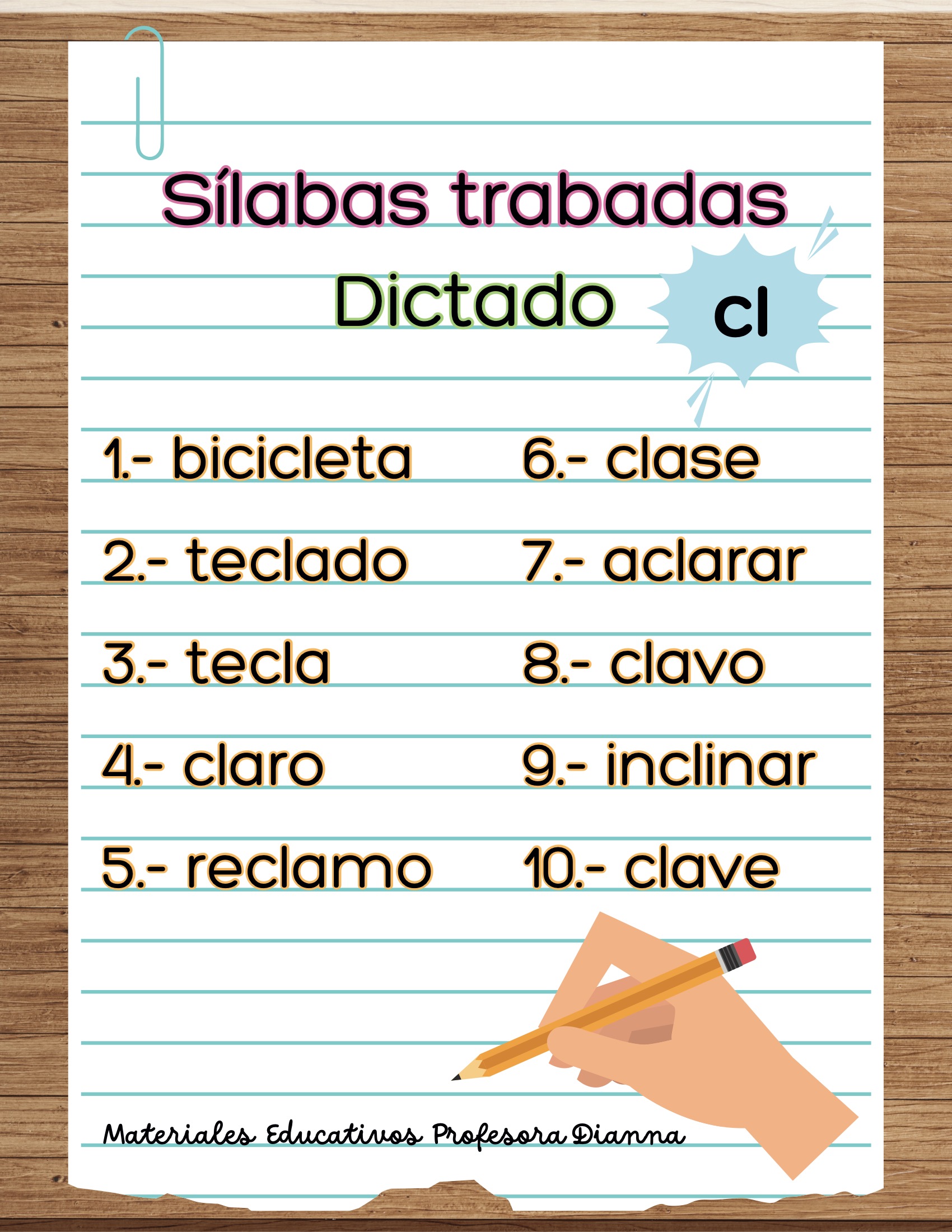 Dictados de palabras con s铆labas trabadas (bl, br, cl, cr, dr, fl, fr, gl, gr, pl, pr, tr).