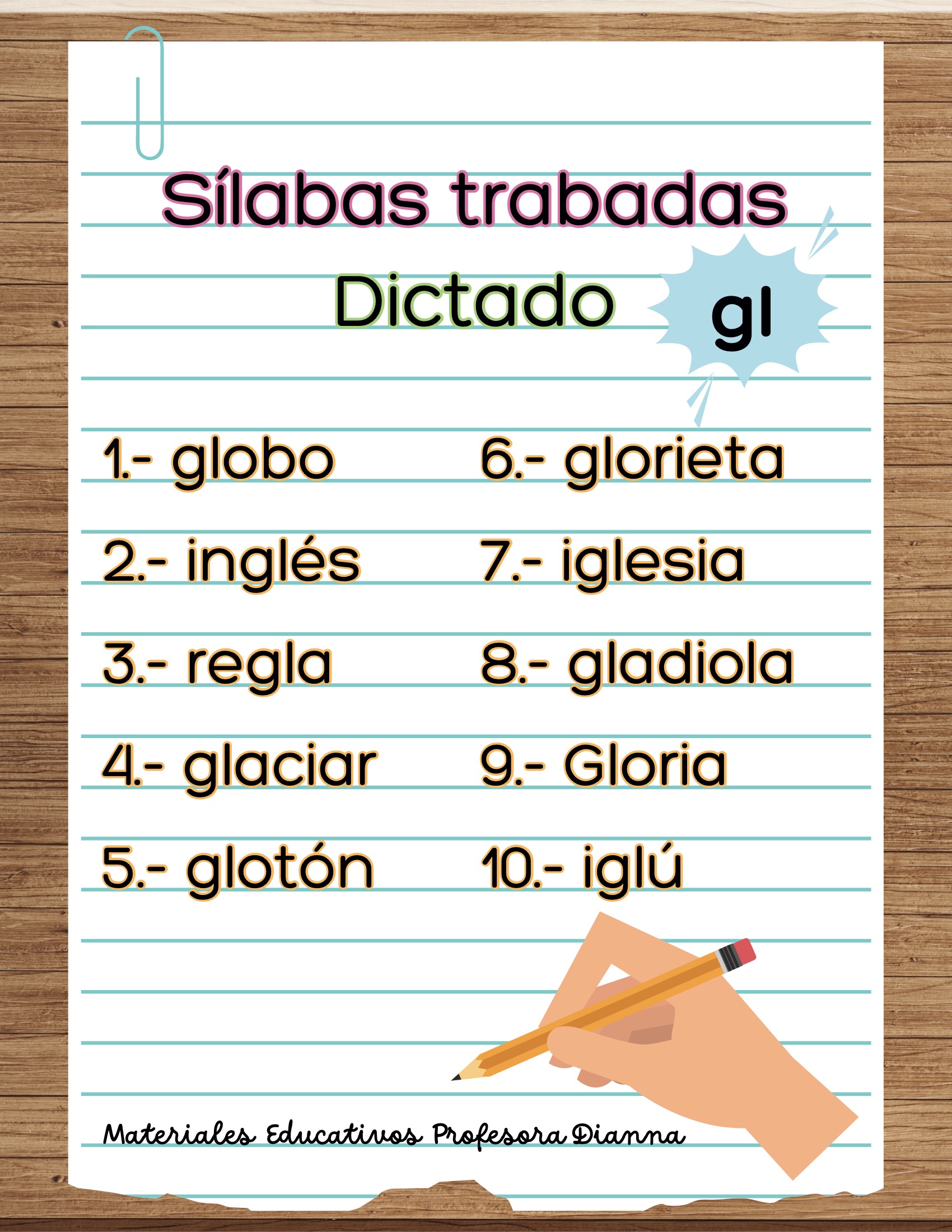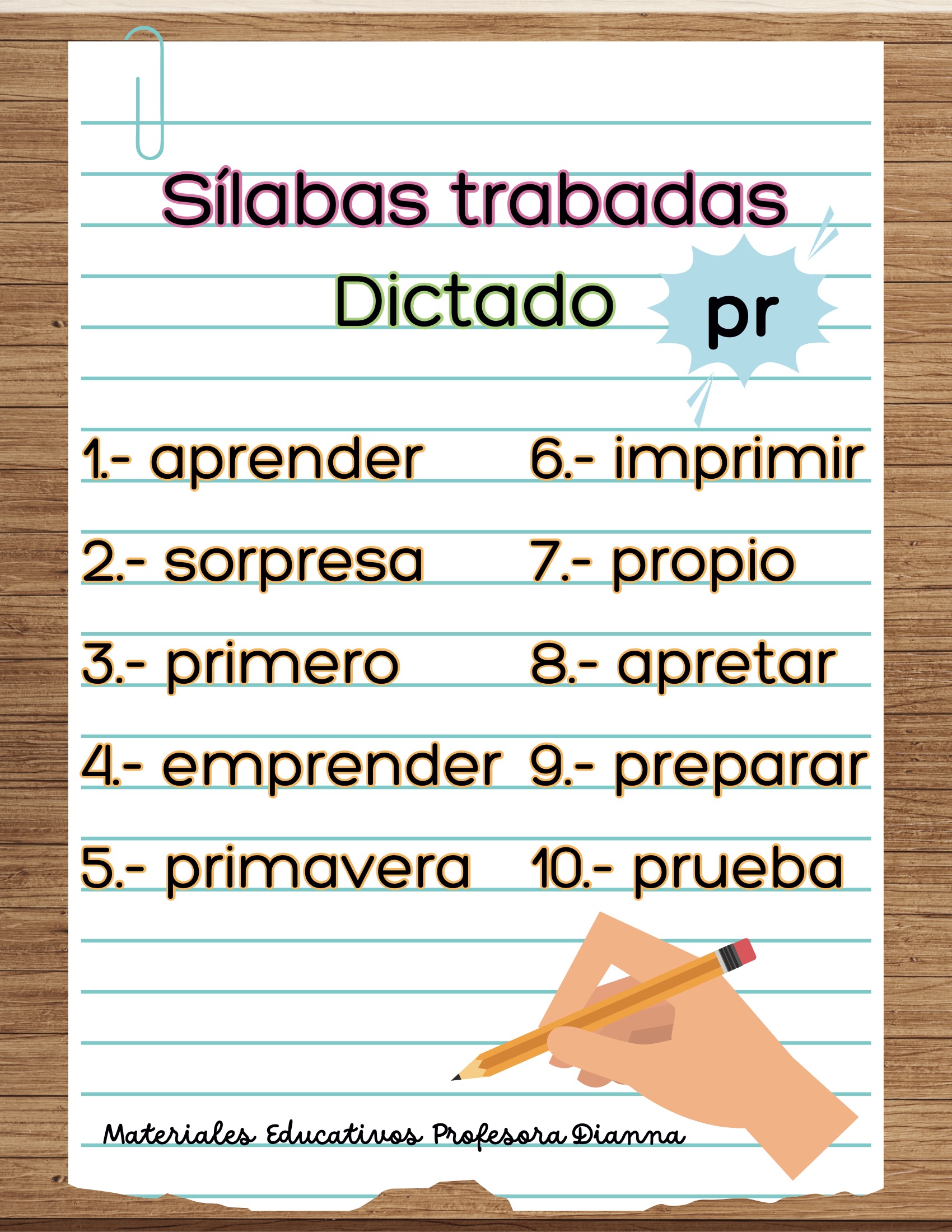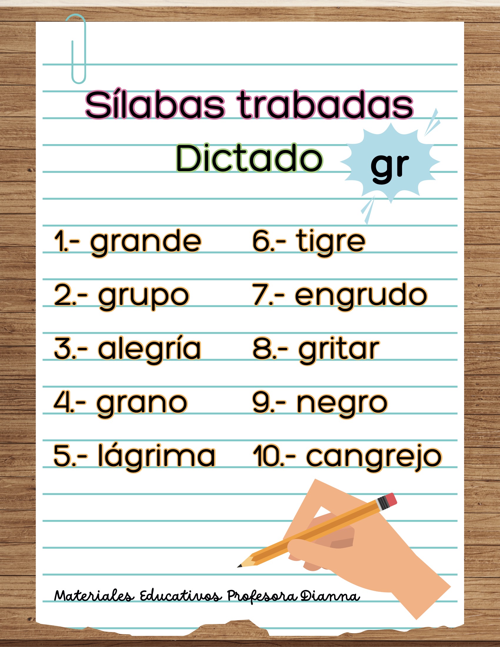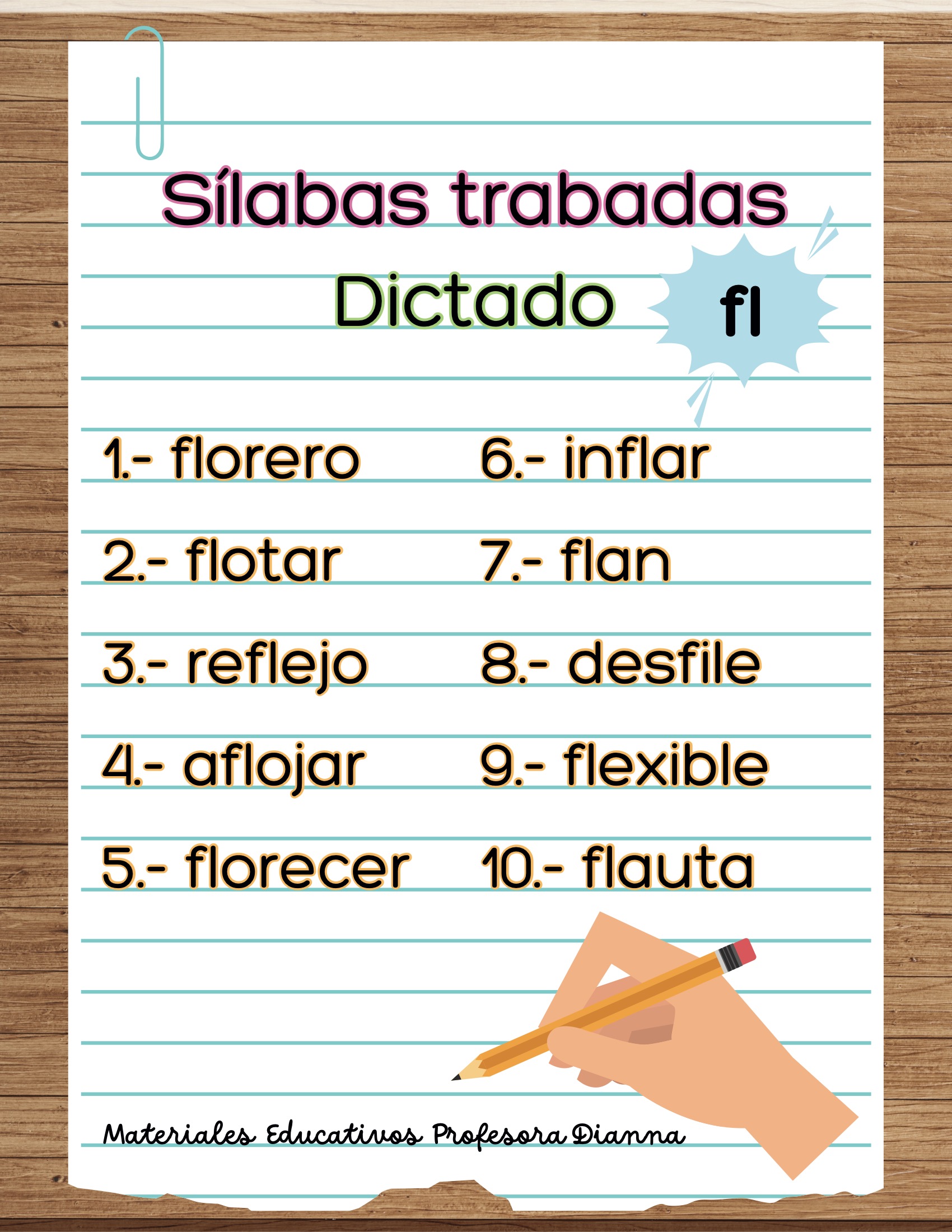 Dictados de palabras con s铆labas trabadas (bl, br, cl, cr, dr, fl, fr, gl, gr, pl, pr, tr).