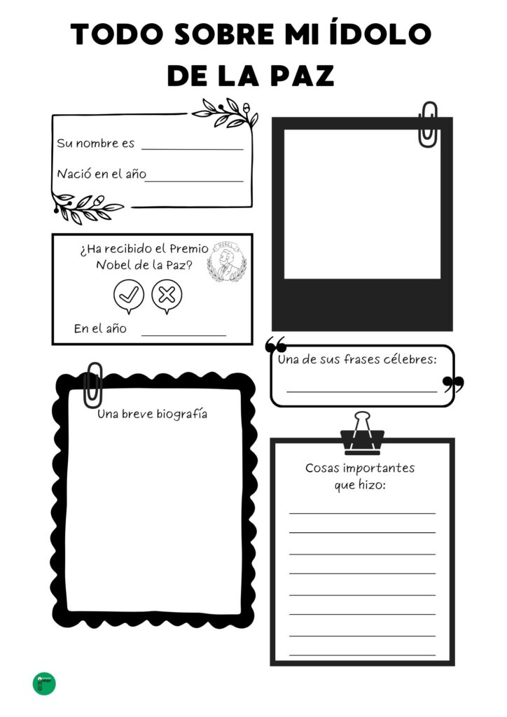 A través de esta ficha, los alumnos deberán elegir a una persona que admiren por su labor pacifista, ya sea un personaje histórico o una figura contemporánea. Una vez seleccionado su ídolo de la paz, comenzarán un proceso de investigación en el que recopilarán la información más relevante sobre su vida y su legado. Entre los aspectos a trabajar se incluyen sus logros más importantes, una frase célebre que represente su pensamiento y una pequeña biografía que ayude a comprender su trayectoria personal y social.