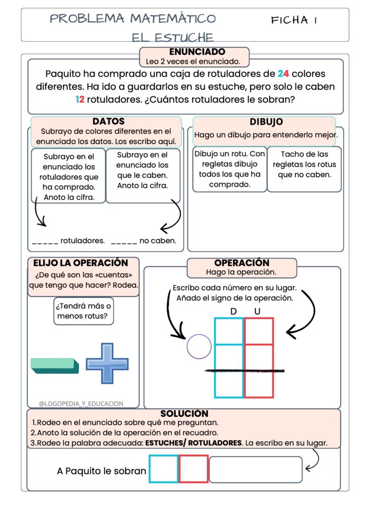 Fichas estructuradas paso a paso para trabajar la resolución de problemas.