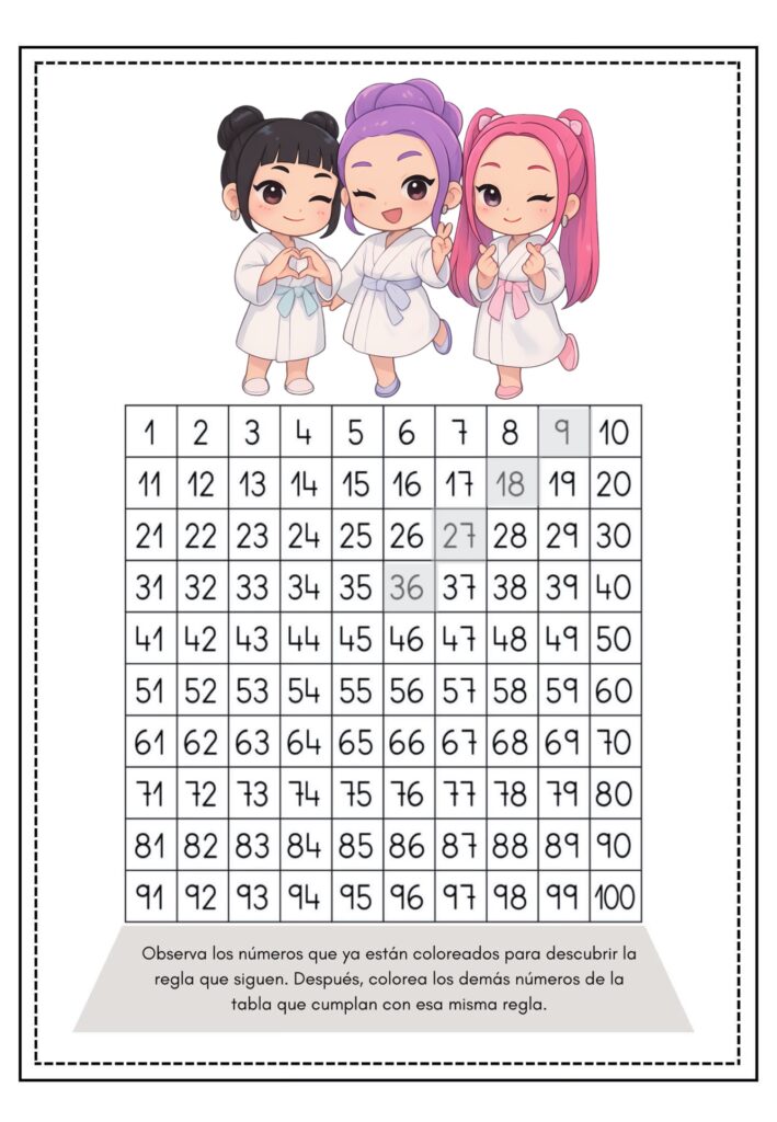 Trabajar la numeraci贸n de forma visual y motivadora es clave en los primeros cursos de Primaria. Este material combina la tabla del 100 y las secuencias num茅ricas con el atractivo universo de las Guerreras del K-POP, logrando que el alumnado aprenda matem谩ticas jugando, observando y razonando.