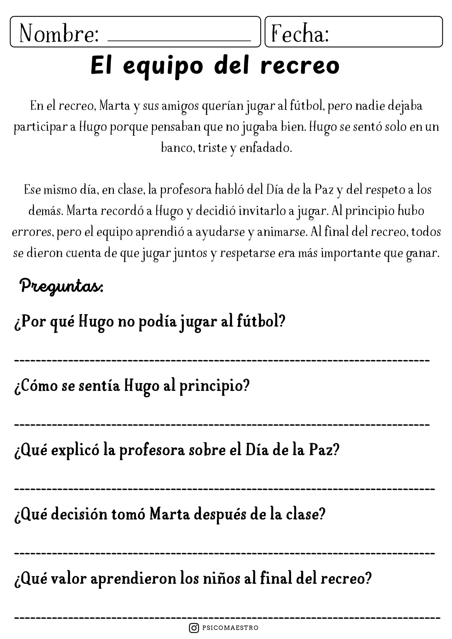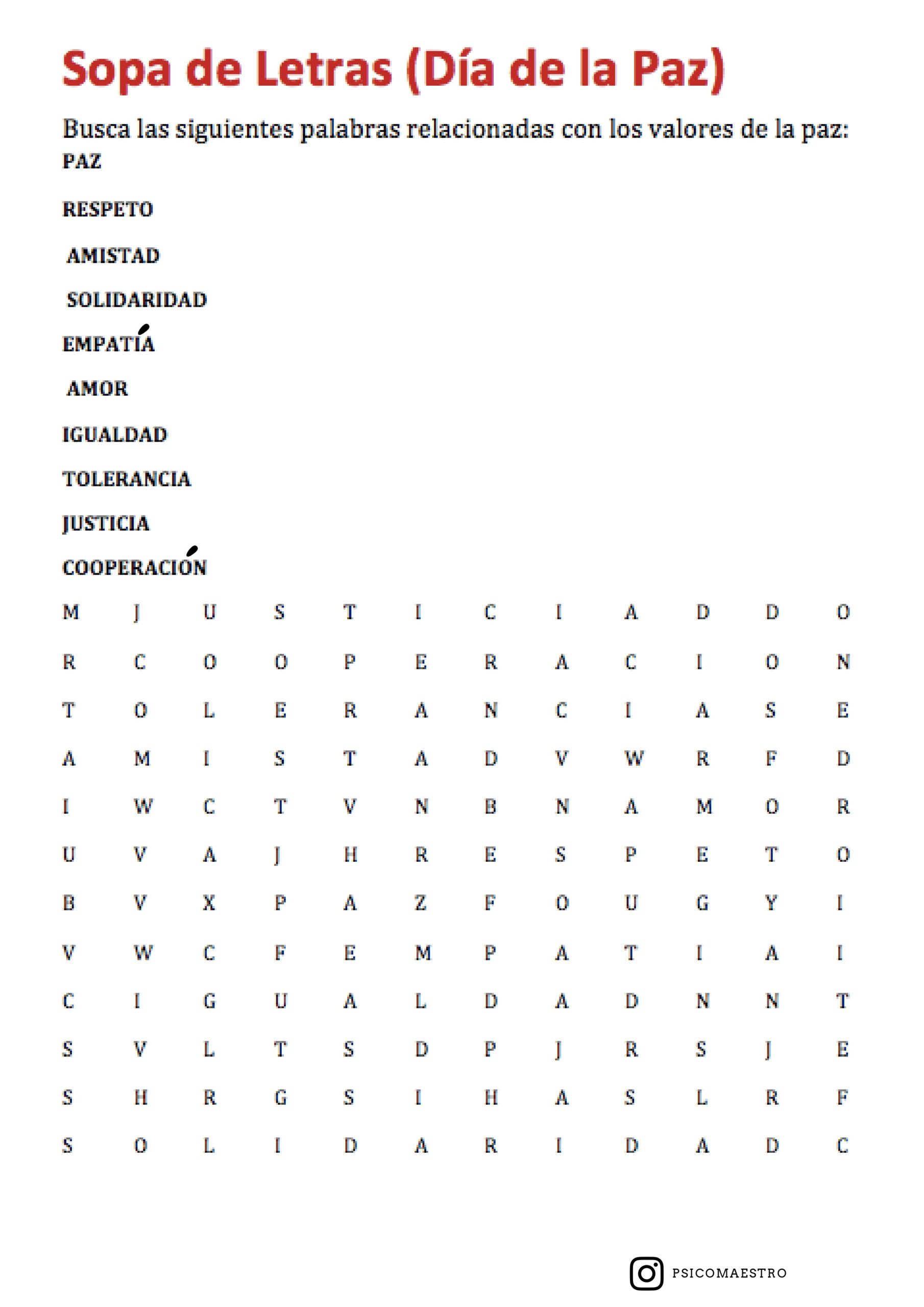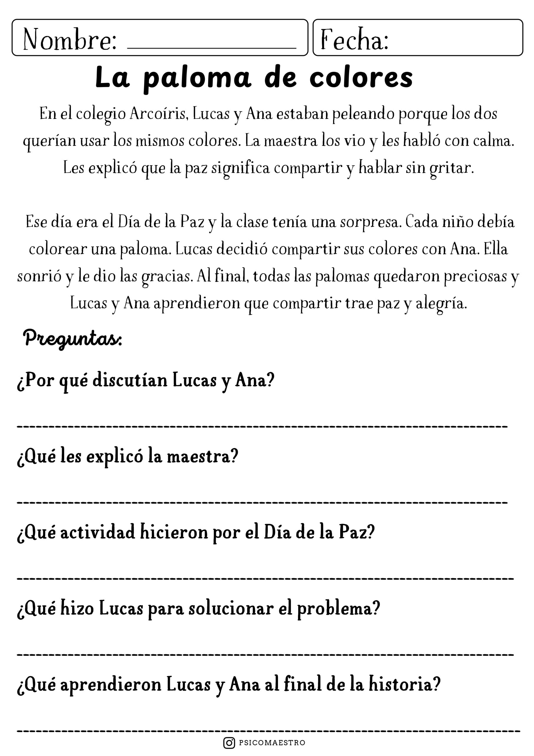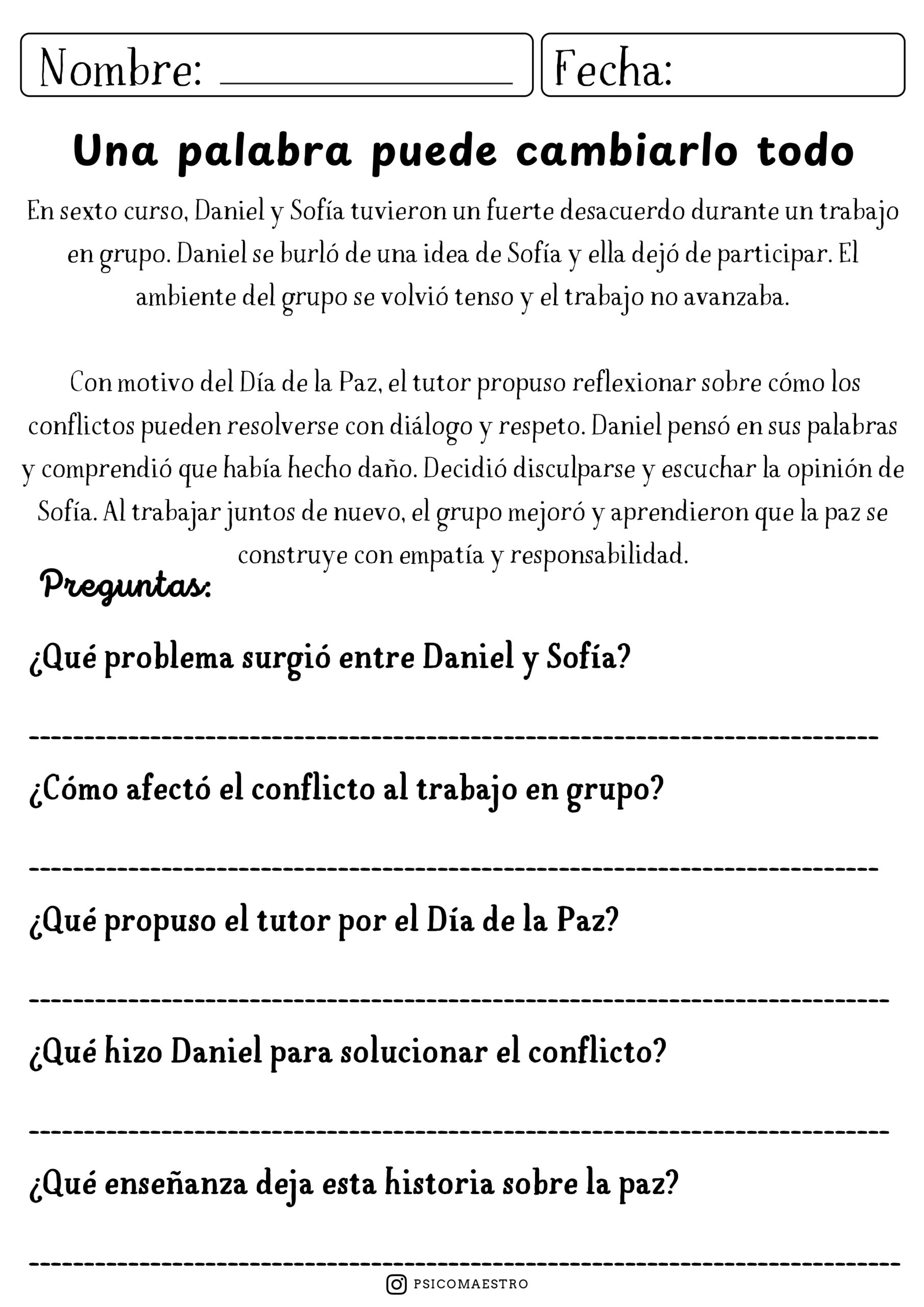 El material incluye propuestas de comprensión lectora que invitan al análisis y la reflexión, marcapáginas con mensajes positivos, sopas de letras para reforzar vocabulario relacionado con la paz, así como cómics y dibujos que permiten expresar ideas y emociones de manera creativa. Cada actividad está pensada para adaptarse a diferentes ritmos y niveles, favoreciendo la participación de todo el alumnado.