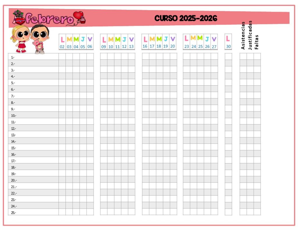 Este registro se convierte en una herramienta imprescindible para los docentes, ya que ayuda a controlar la asistencia del alumnado de forma rápida y ordenada, además de simplificar la gestión y el archivo de la información. Al ser editable, cada profesor puede adaptarla a las necesidades de su grupo, añadiendo nombres, fechas u observaciones.