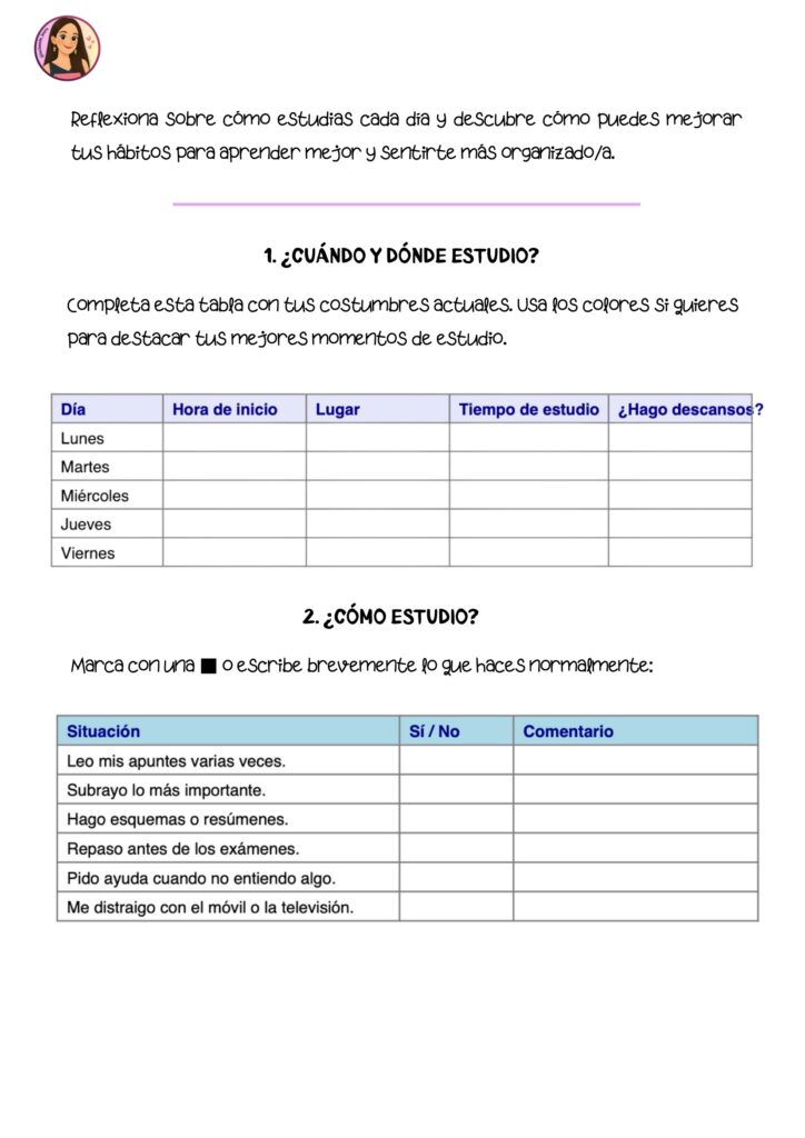 Este material est谩 pensado para trabajar en tutor铆a de Secundaria, ayudando al alumnado a reflexionar sobre sus h谩bitos de estudio, su organizaci贸n diaria y su forma de aprender. A trav茅s de actividades guiadas, los estudiantes analizan c贸mo estudian actualmente y dise帽an un plan de mejora personal, fomentando la autonom铆a, la autorregulaci贸n y la responsabilidad acad茅mica.