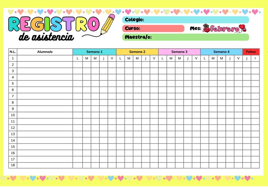 馃搮 Febrero: Registro de Asistencia colorido para tus clases