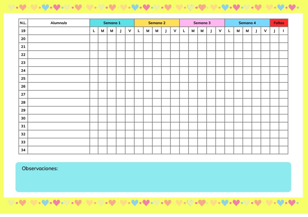 鉁忥笍 Espacios para nombre del alumnado, d铆as lectivos y faltas