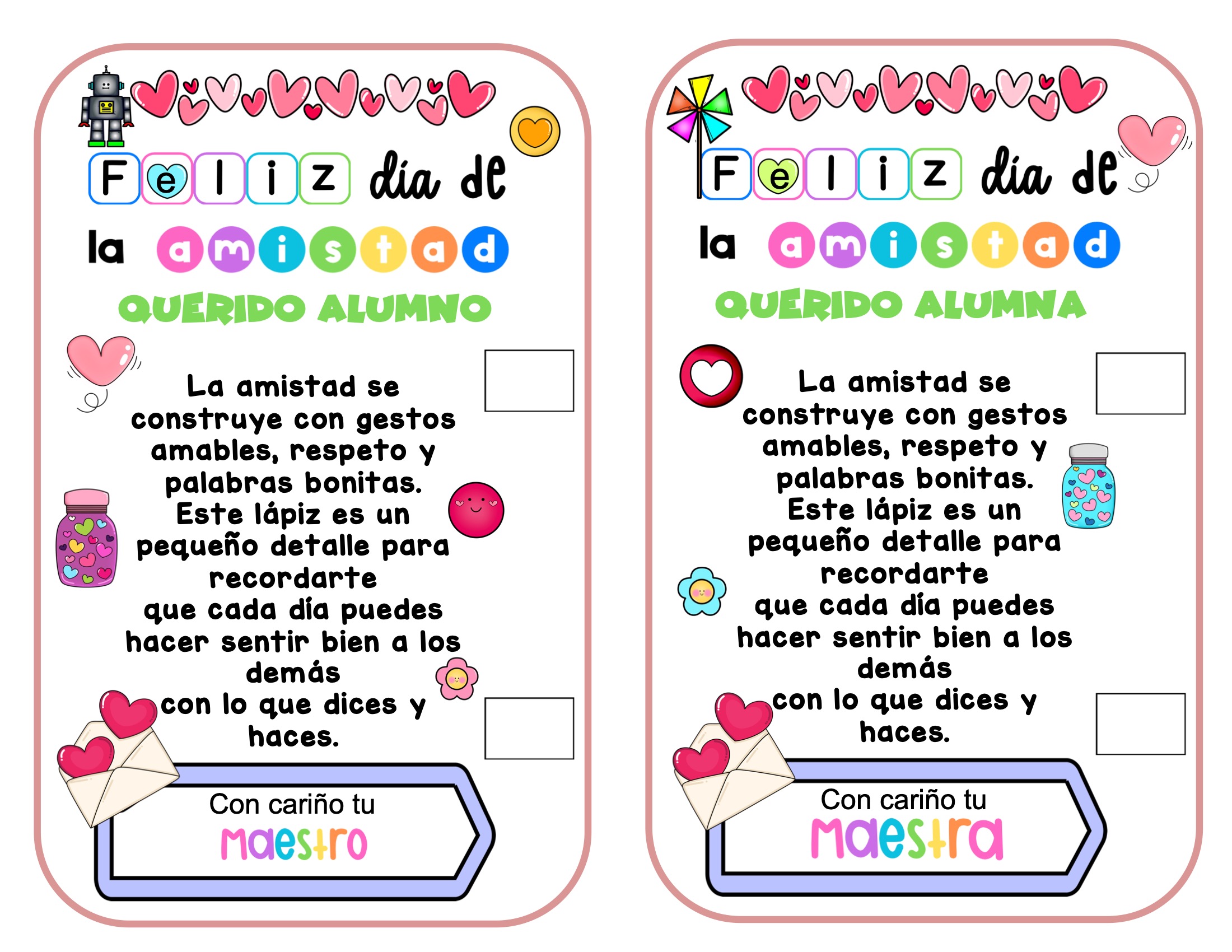 Estas tarjetas son perfectas para entregar junto a un lápiz en el Día del Amor y la Amistad. Se pueden usar como actividad de tutoría, detalle sorpresa en clase o como cierre de una dinámica sobre convivencia, empatía y respeto. También es ideal para fomentar un clima positivo y reforzar la educación emocional de forma sencilla.