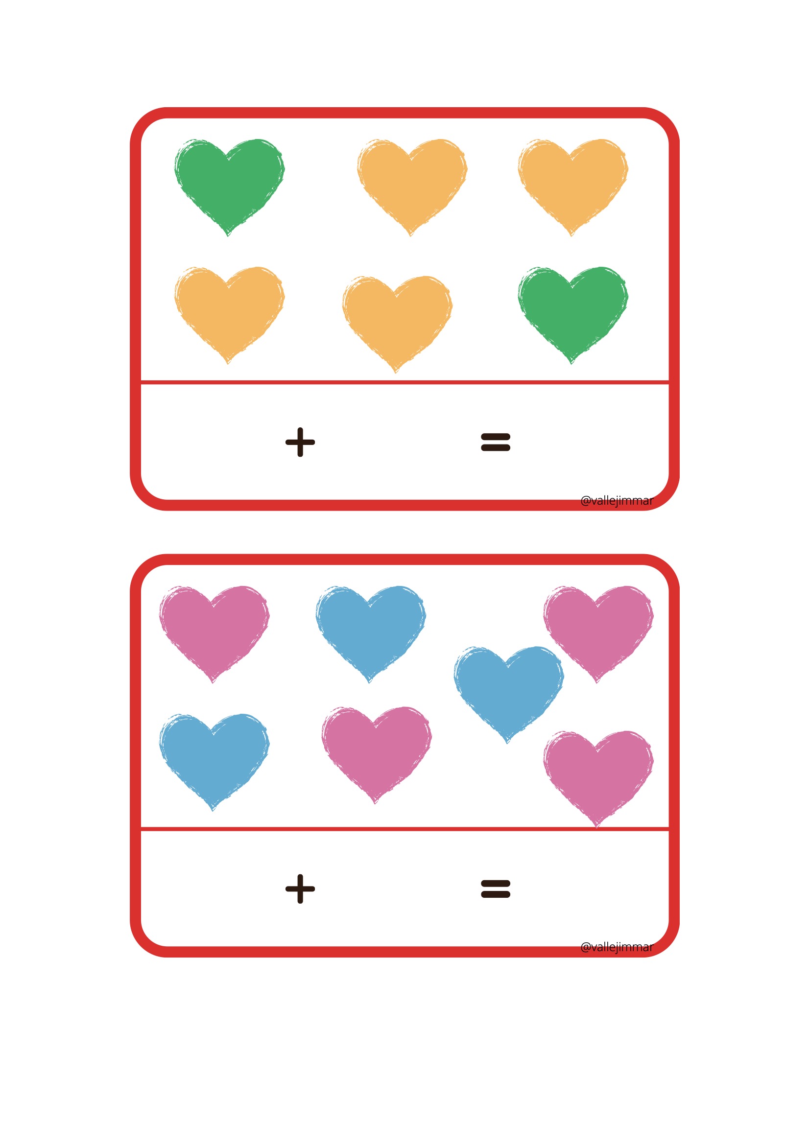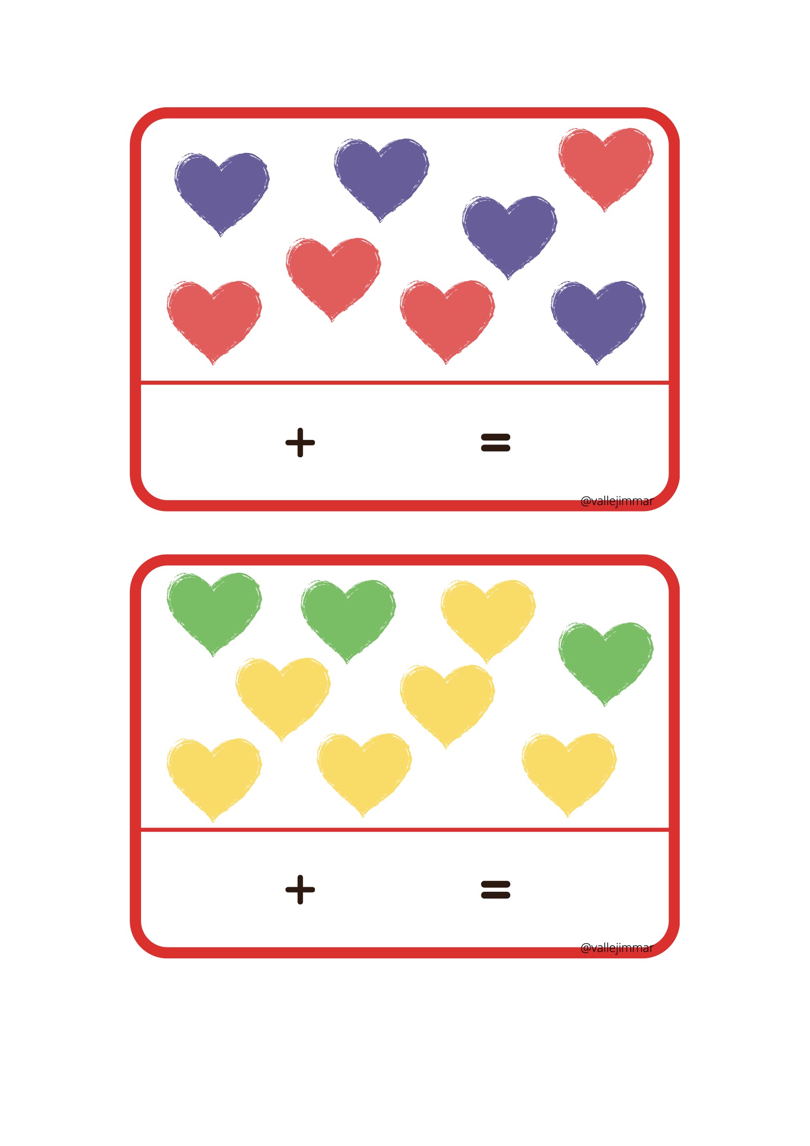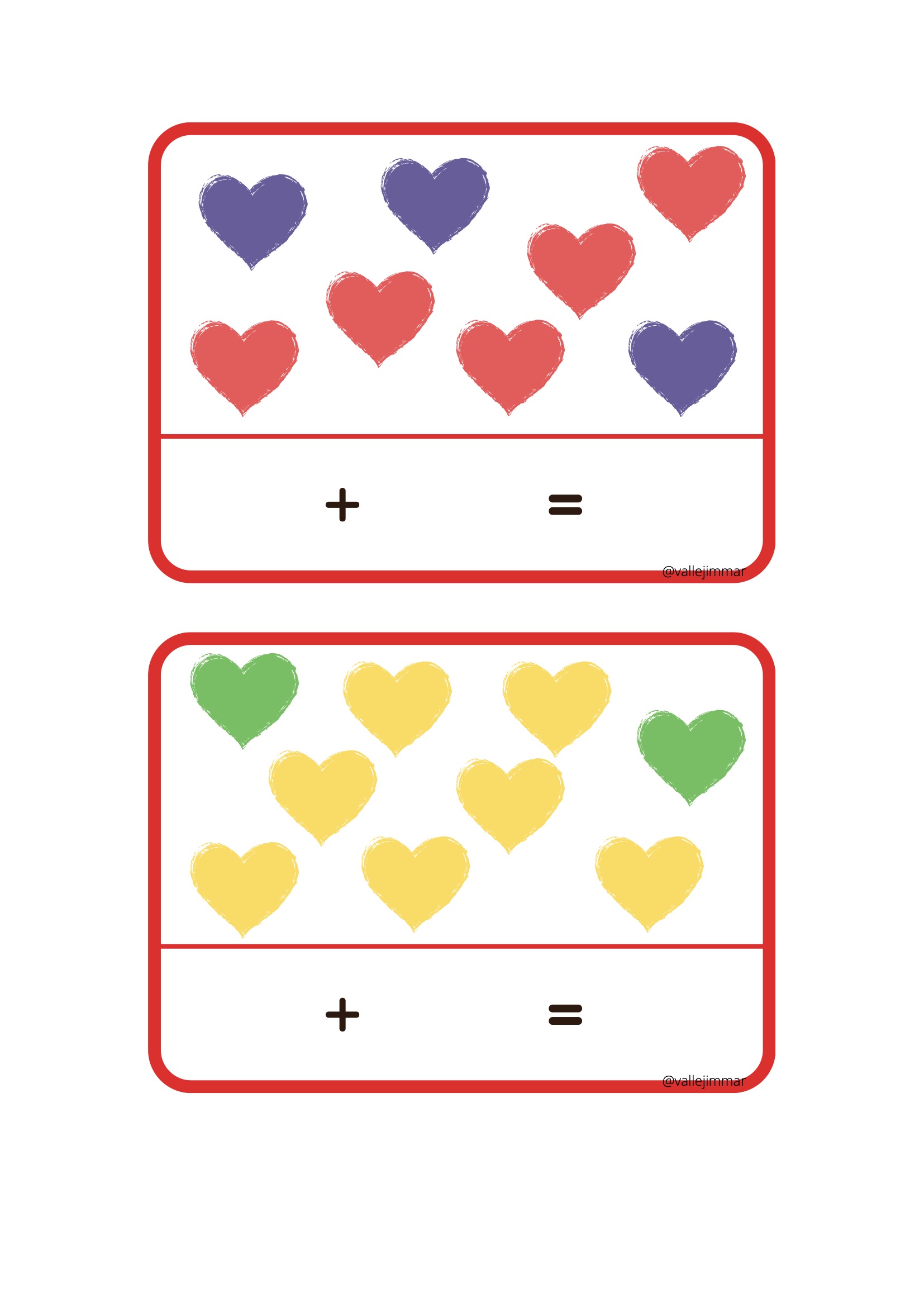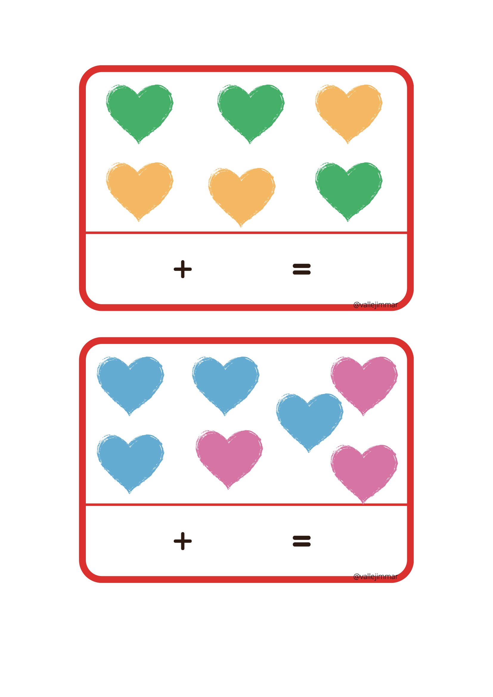 Fichas de sumas visuales con corazones de diferentes colores.