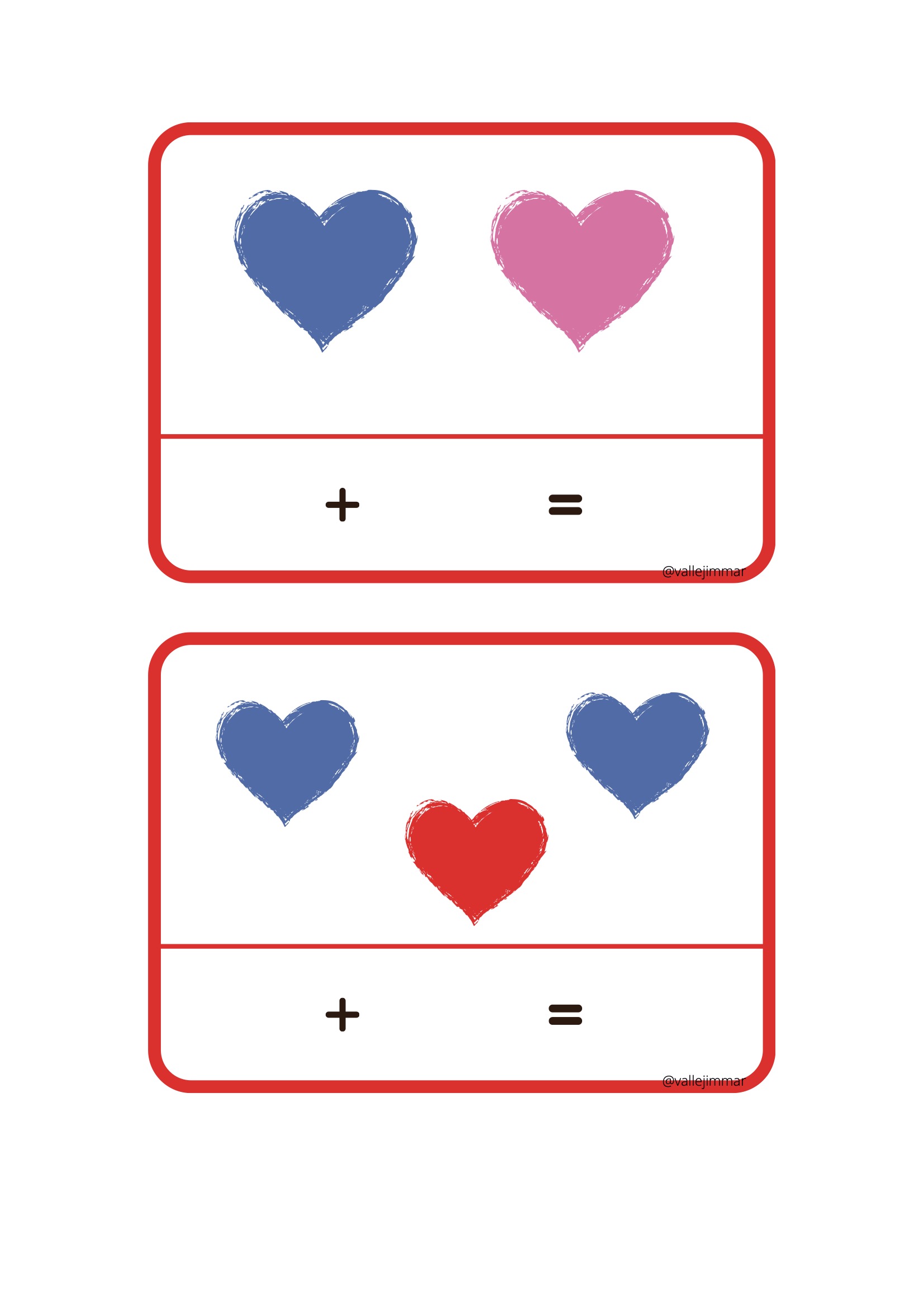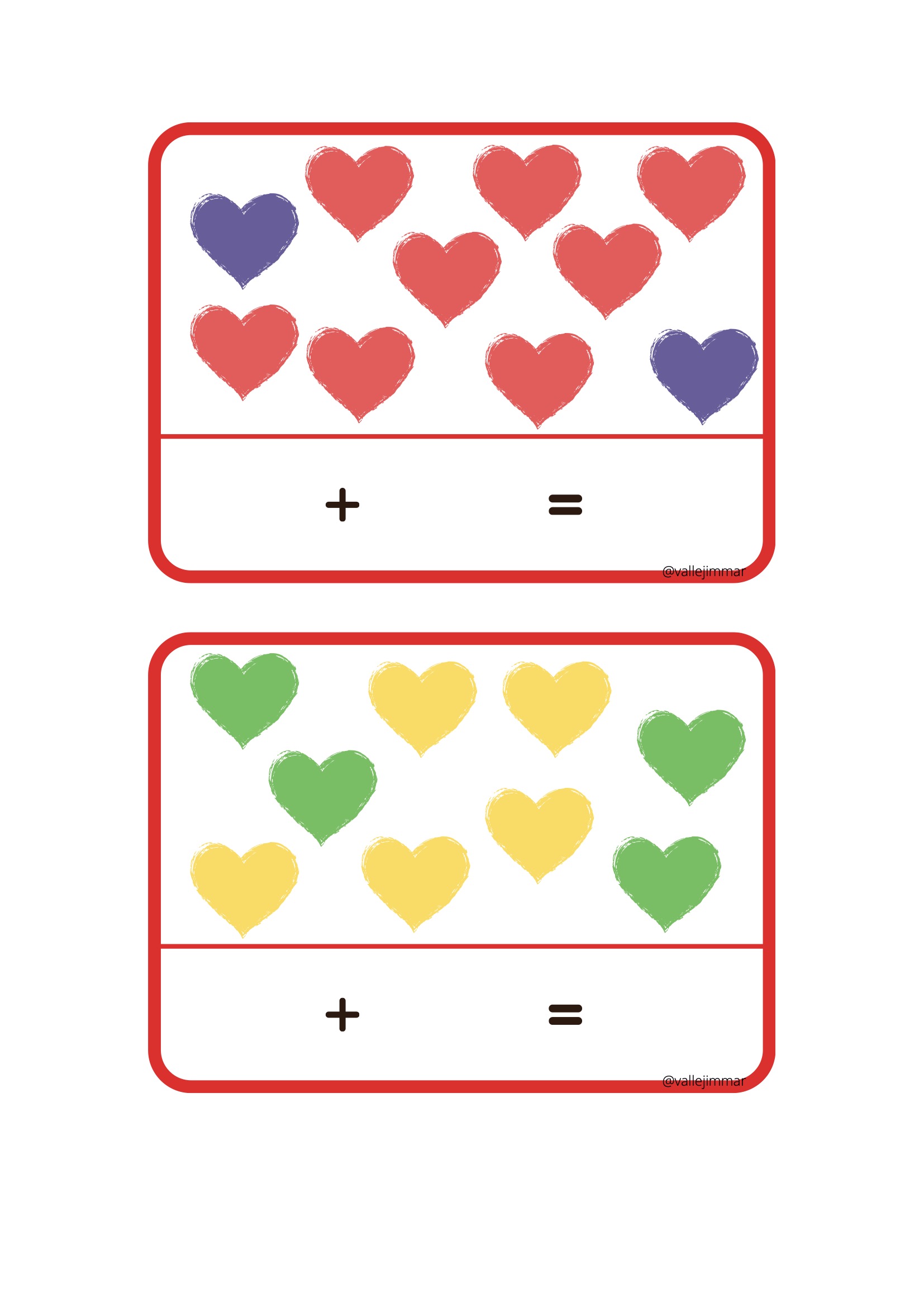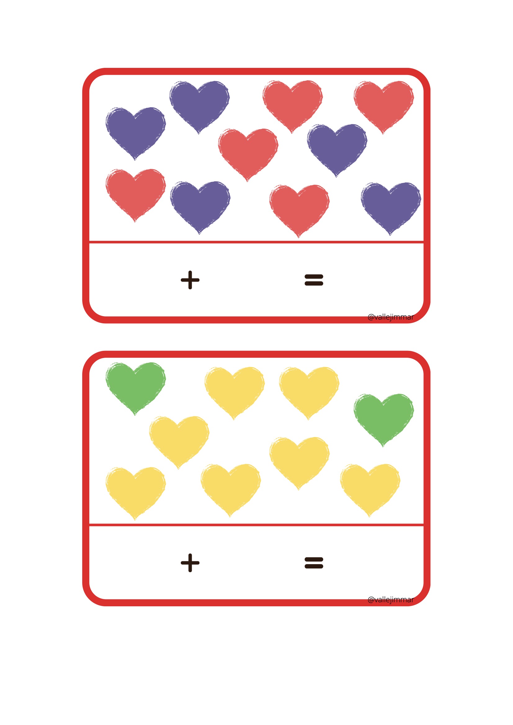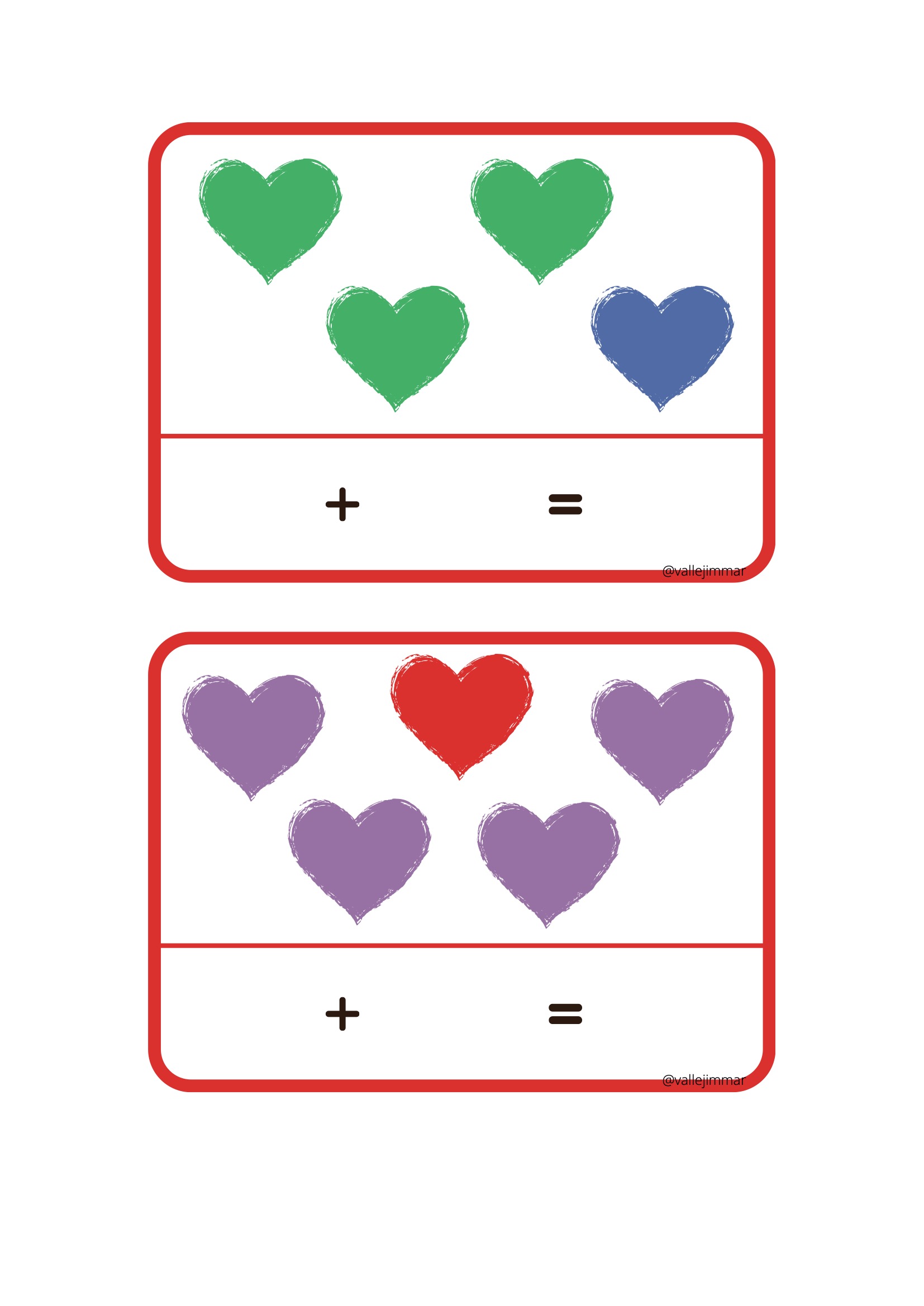 Fichas de sumas visuales con corazones de diferentes colores.