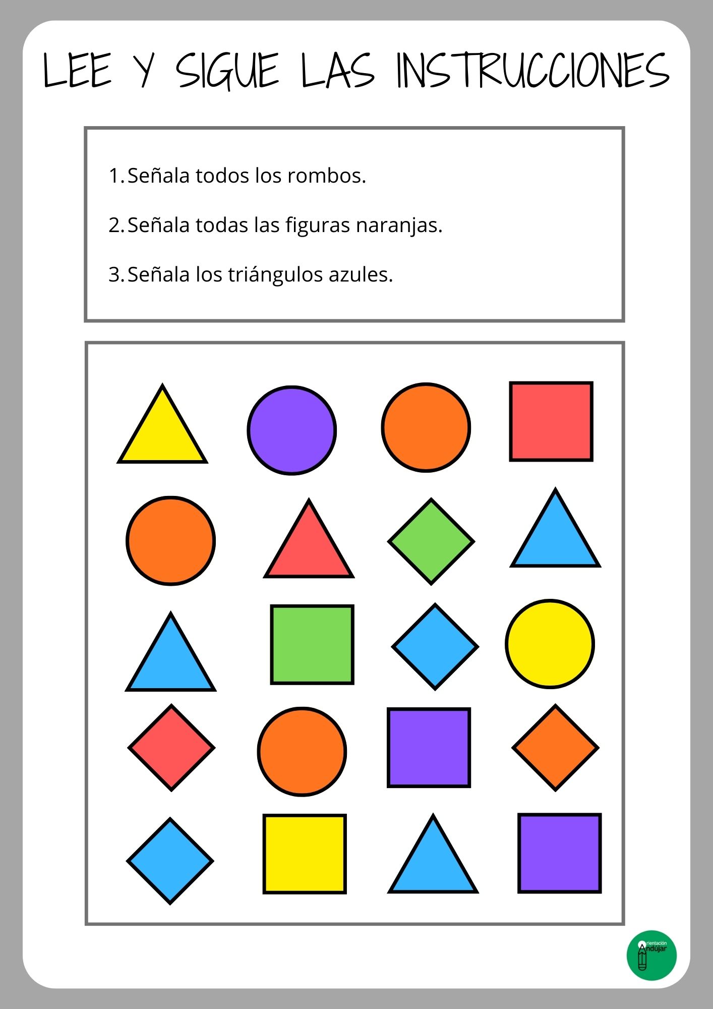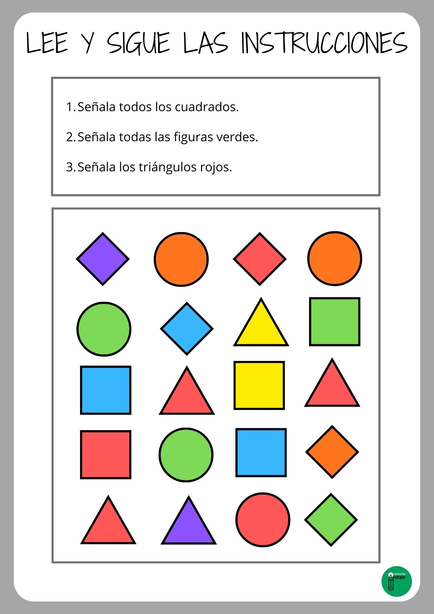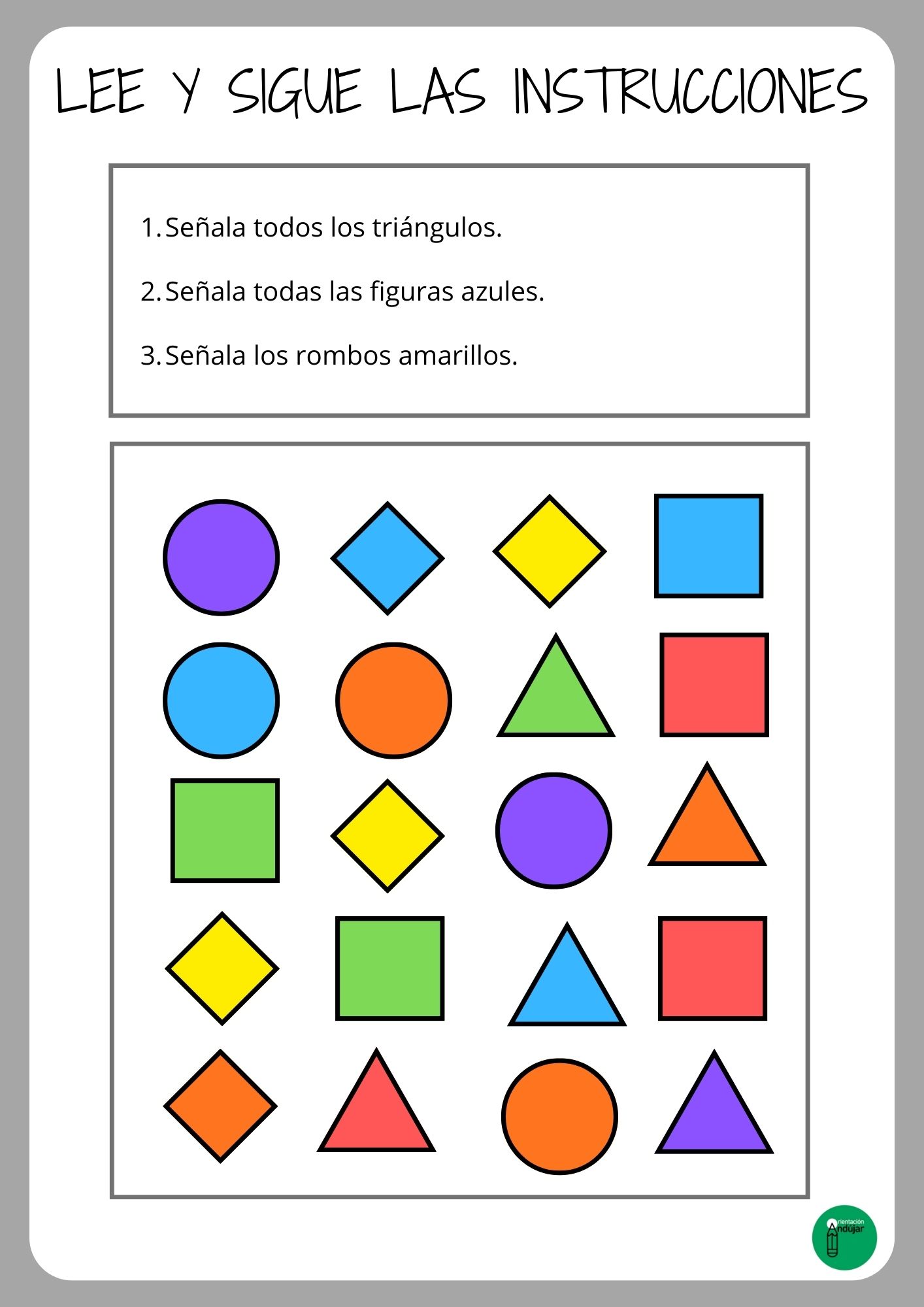 Cada tablero está compuesto por filas con diferentes figuras geométricas (círculos, triángulos, cuadrados, estrellas, etc.) y colores variados. Para realizar los ejercicios, un acompañante o tutor propone tres instrucciones específicas: una en la que se indique señalar todas las figuras de un tipo geométrico concreto, otra donde se indique marcar figuras de un color específico y una tercera en la que se combine tipo de figura y color.