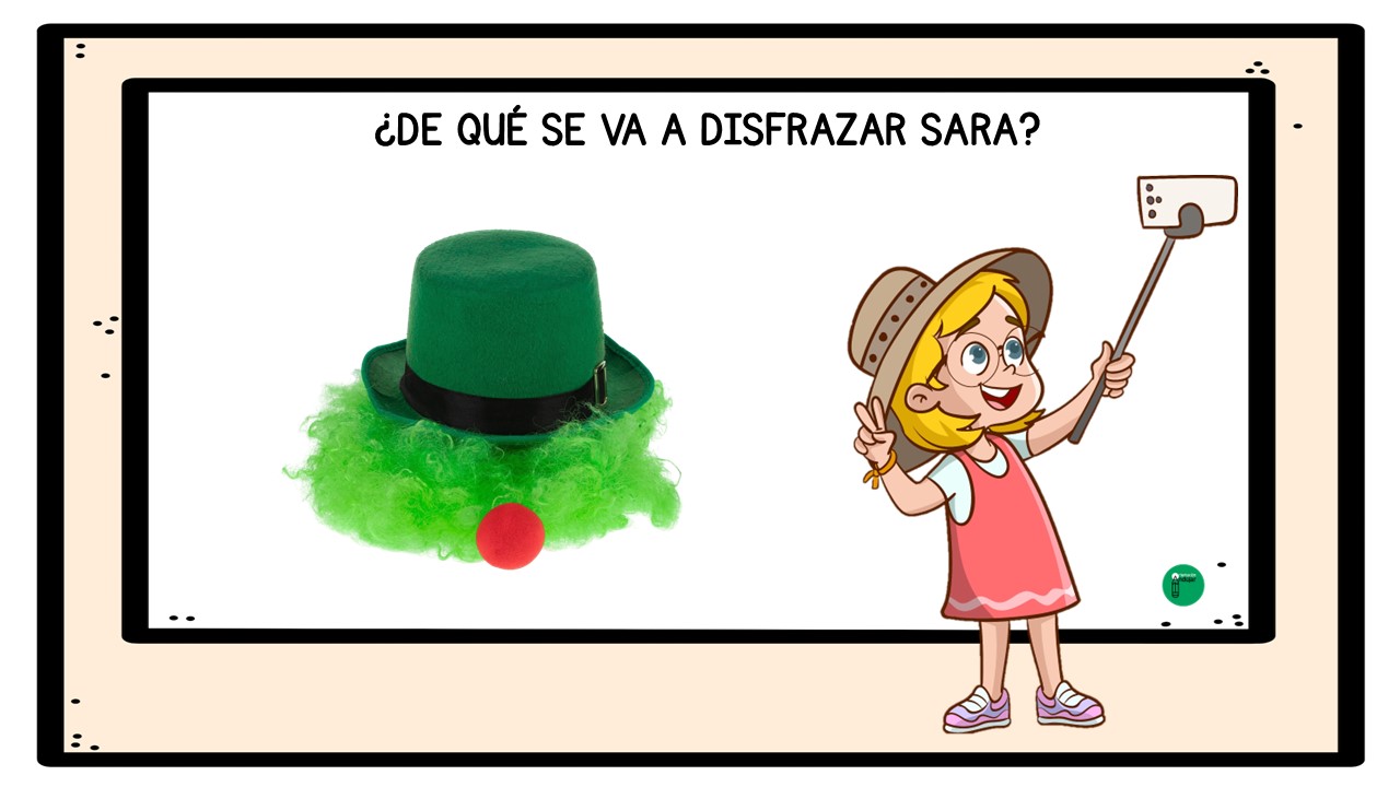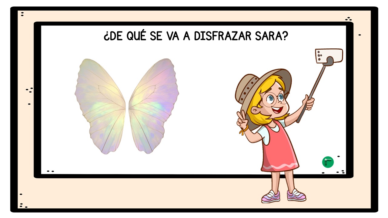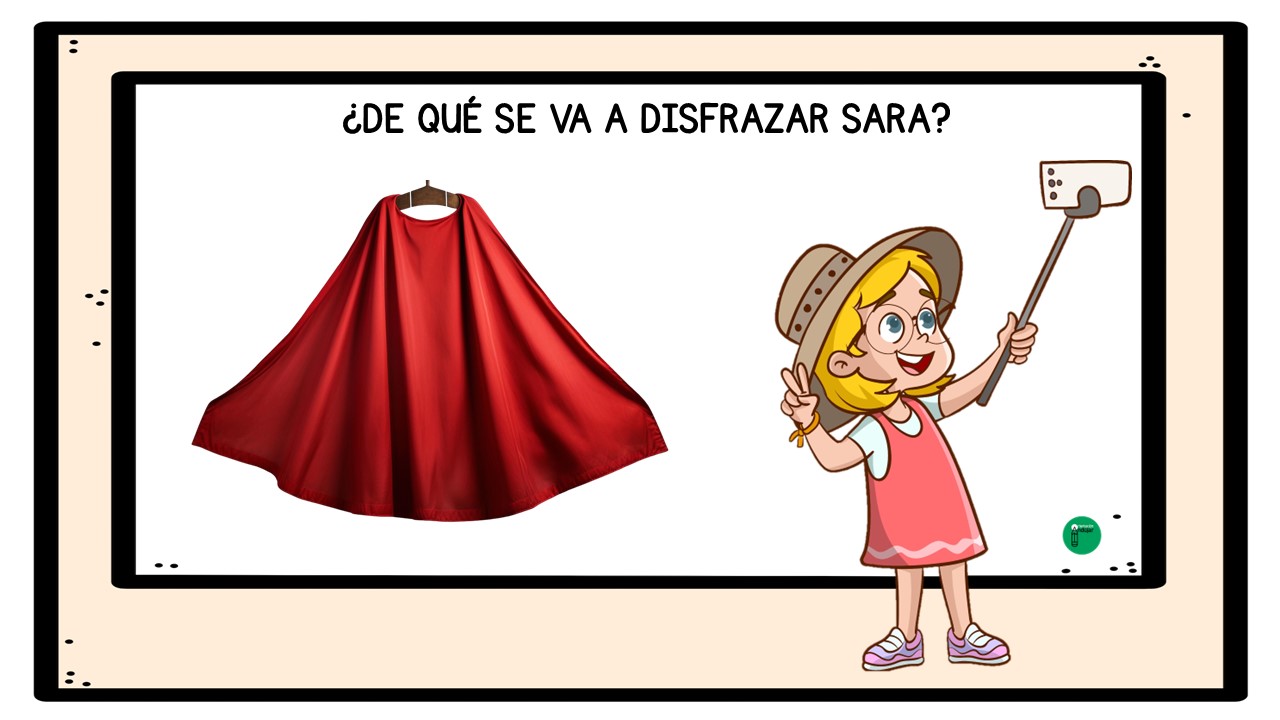 El objetivo del juego es que los alumnos y alumnas, a partir de cada imagen, observen con atención los complementos y pistas visuales que aparecen: sombreros, máscaras, capas, gafas, colores o accesorios característicos de distintos disfraces de Carnaval. Con toda esa información, deberán pensar, debatir y llegar a una conclusión: ¿de qué se va a disfrazar Sara?