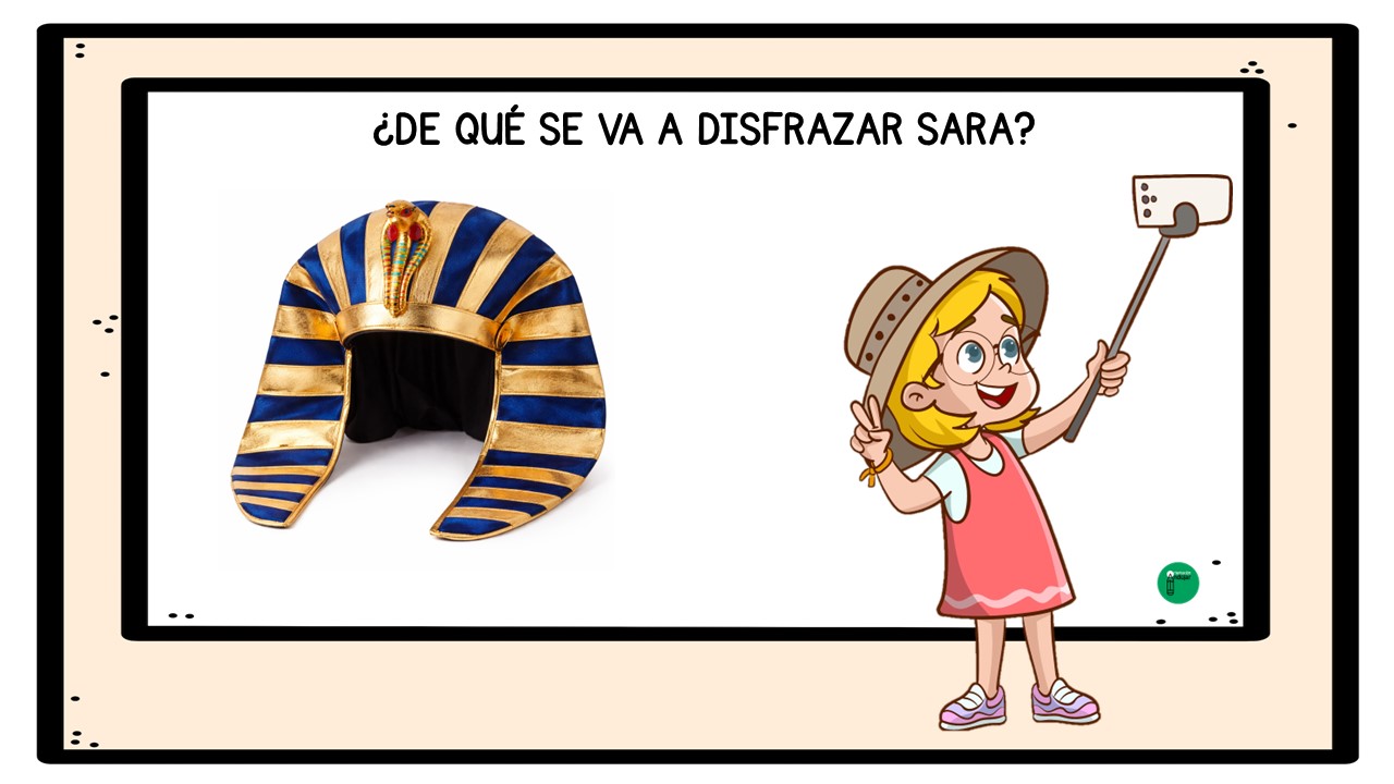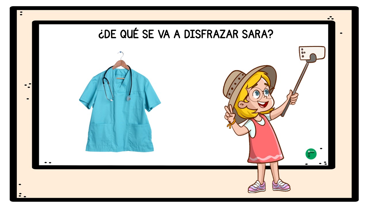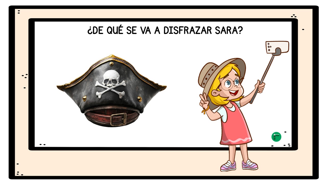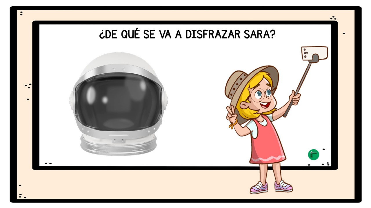 El objetivo del juego es que los alumnos y alumnas, a partir de cada imagen, observen con atención los complementos y pistas visuales que aparecen: sombreros, máscaras, capas, gafas, colores o accesorios característicos de distintos disfraces de Carnaval. Con toda esa información, deberán pensar, debatir y llegar a una conclusión: ¿de qué se va a disfrazar Sara?